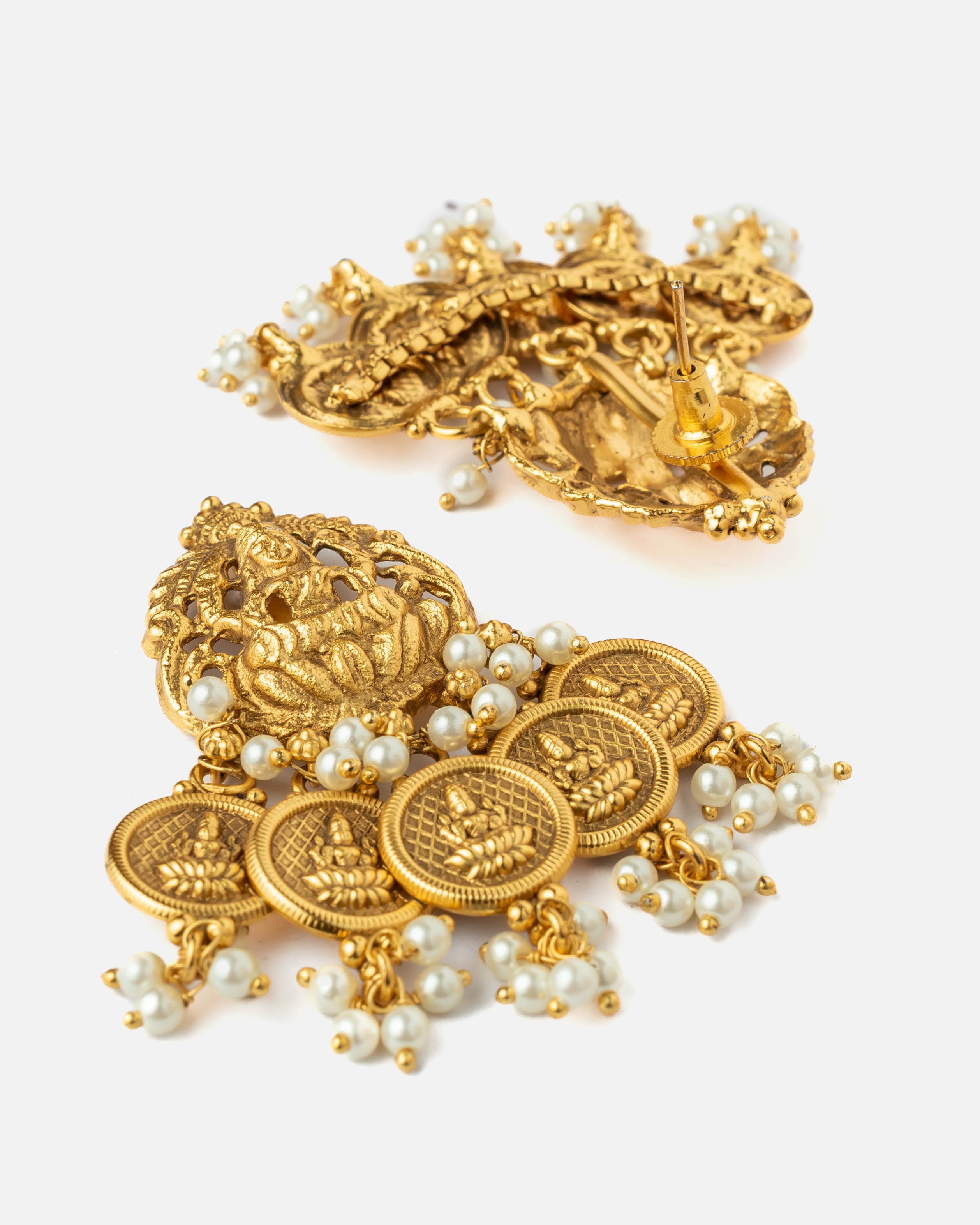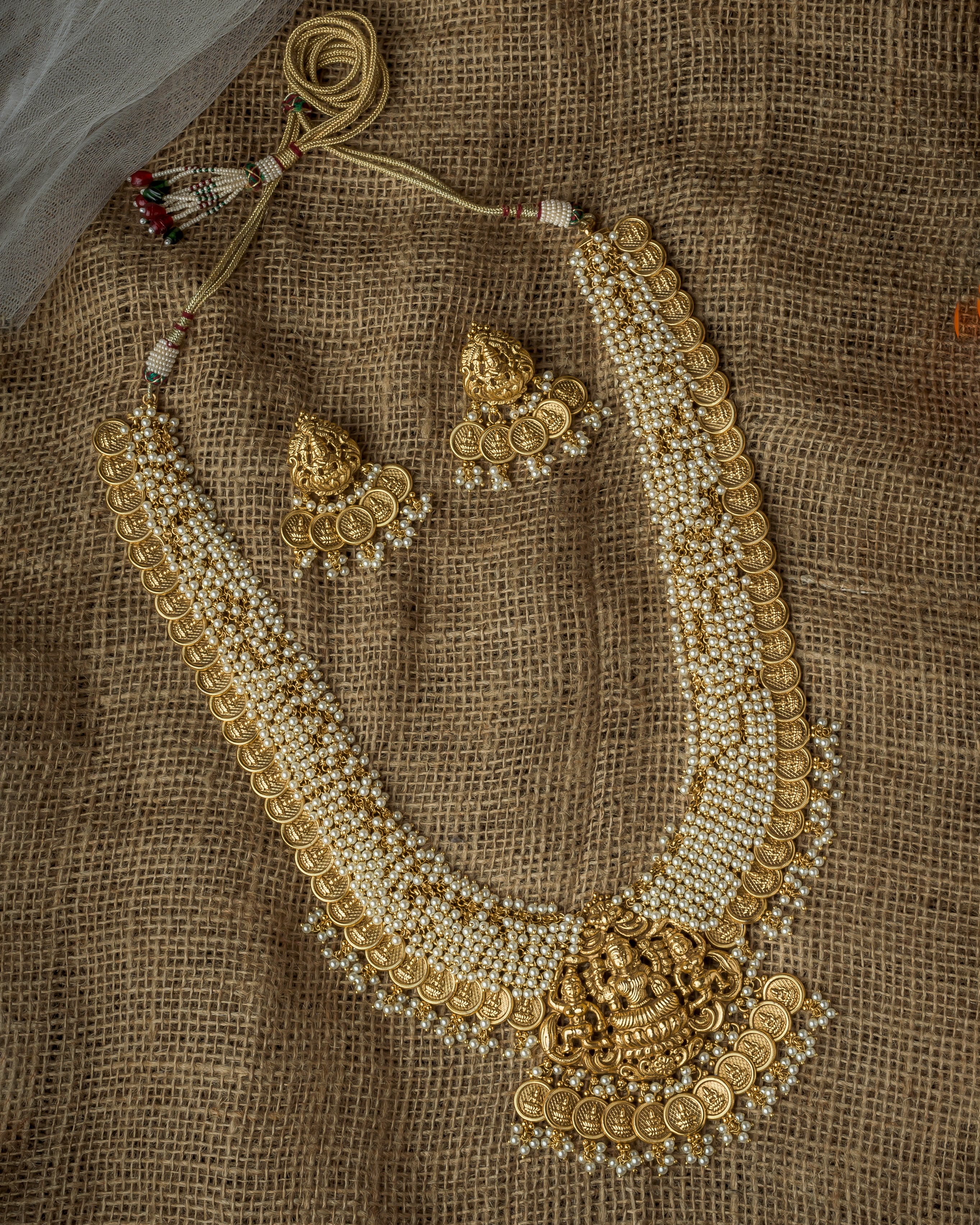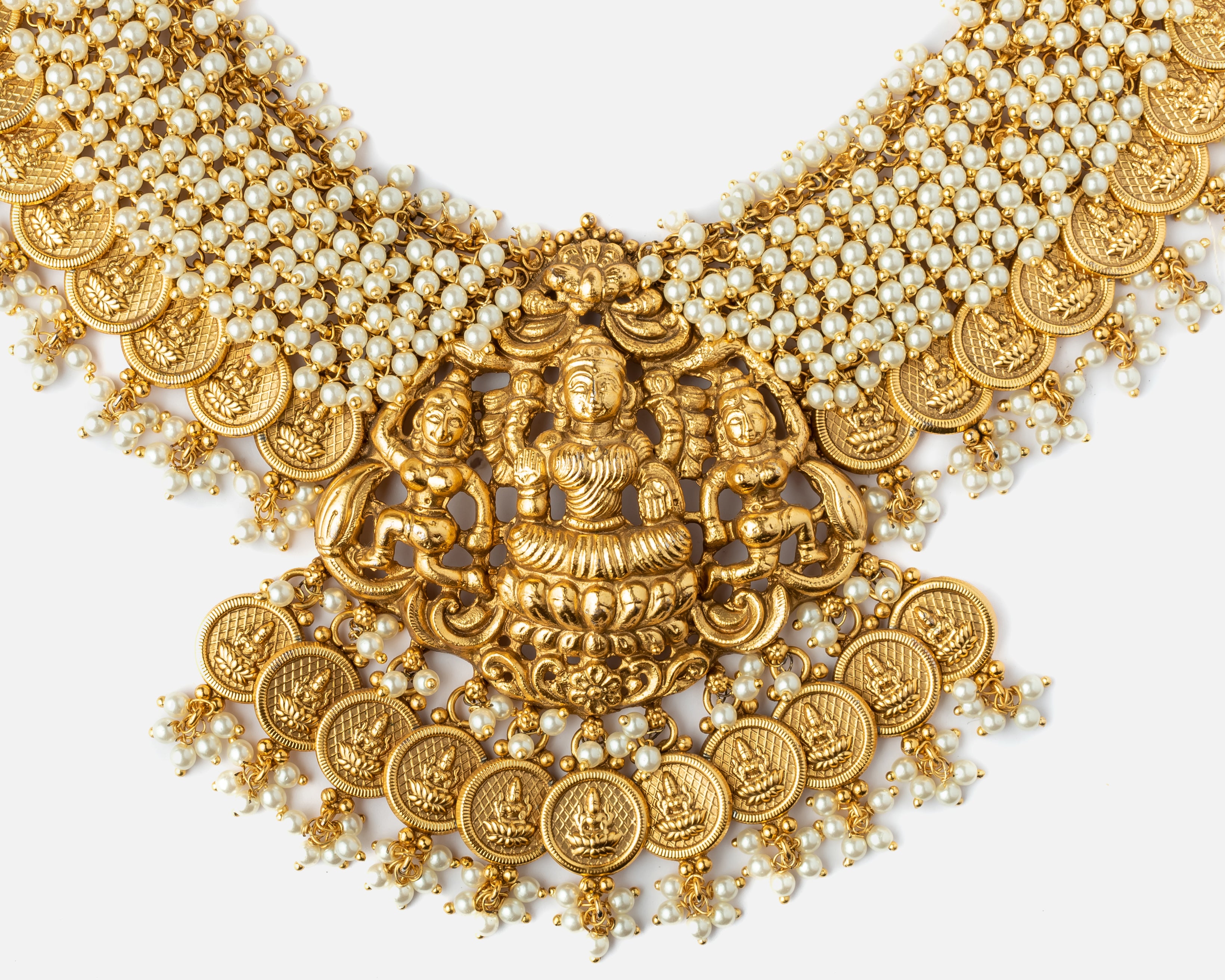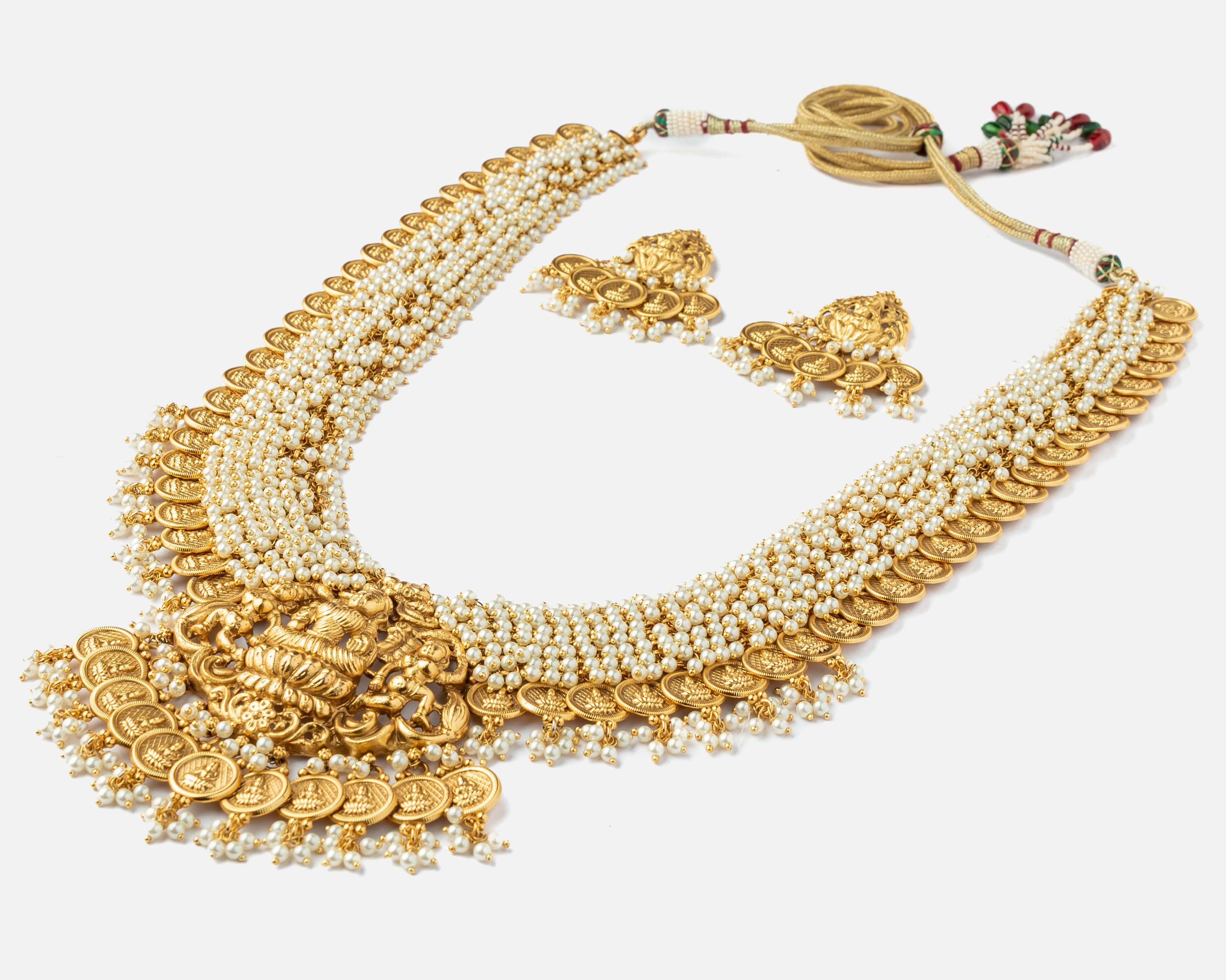 - Elegant Bridal Necklace Set – Features intricate gold-tone detailing with pearl embellishments for a royal look.