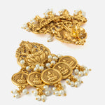 Exquisite bridal necklace set featuring intricate gold-tone detailing with pearl embellishments. Paired with matching earrings, this regal piece adds a touch of grandeur to any occasion.