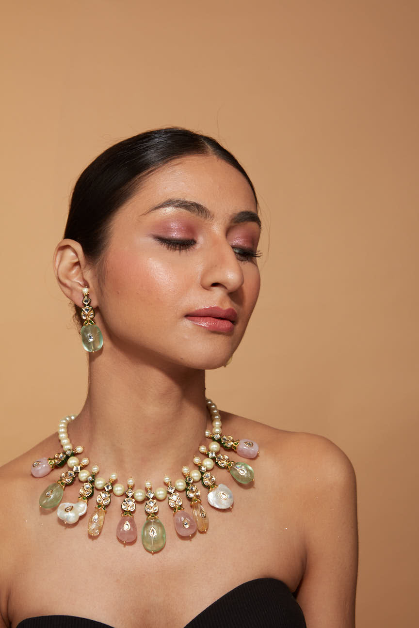 Elevate your elegance with this exquisite necklace set featuring pearl accents and pastel gemstone drops. A stunning blend of traditional artistry and modern charm, ideal for weddings or formal occasions.