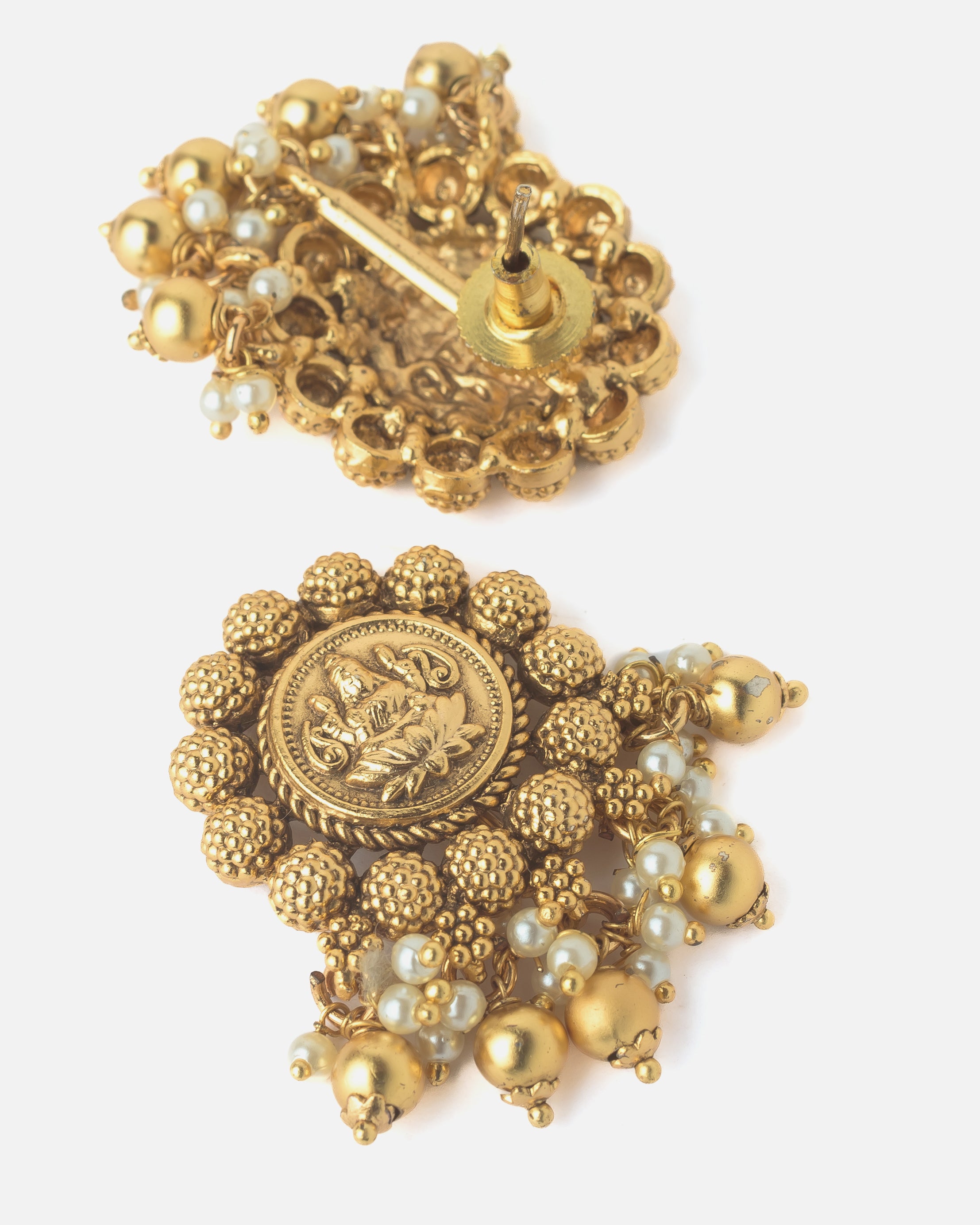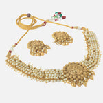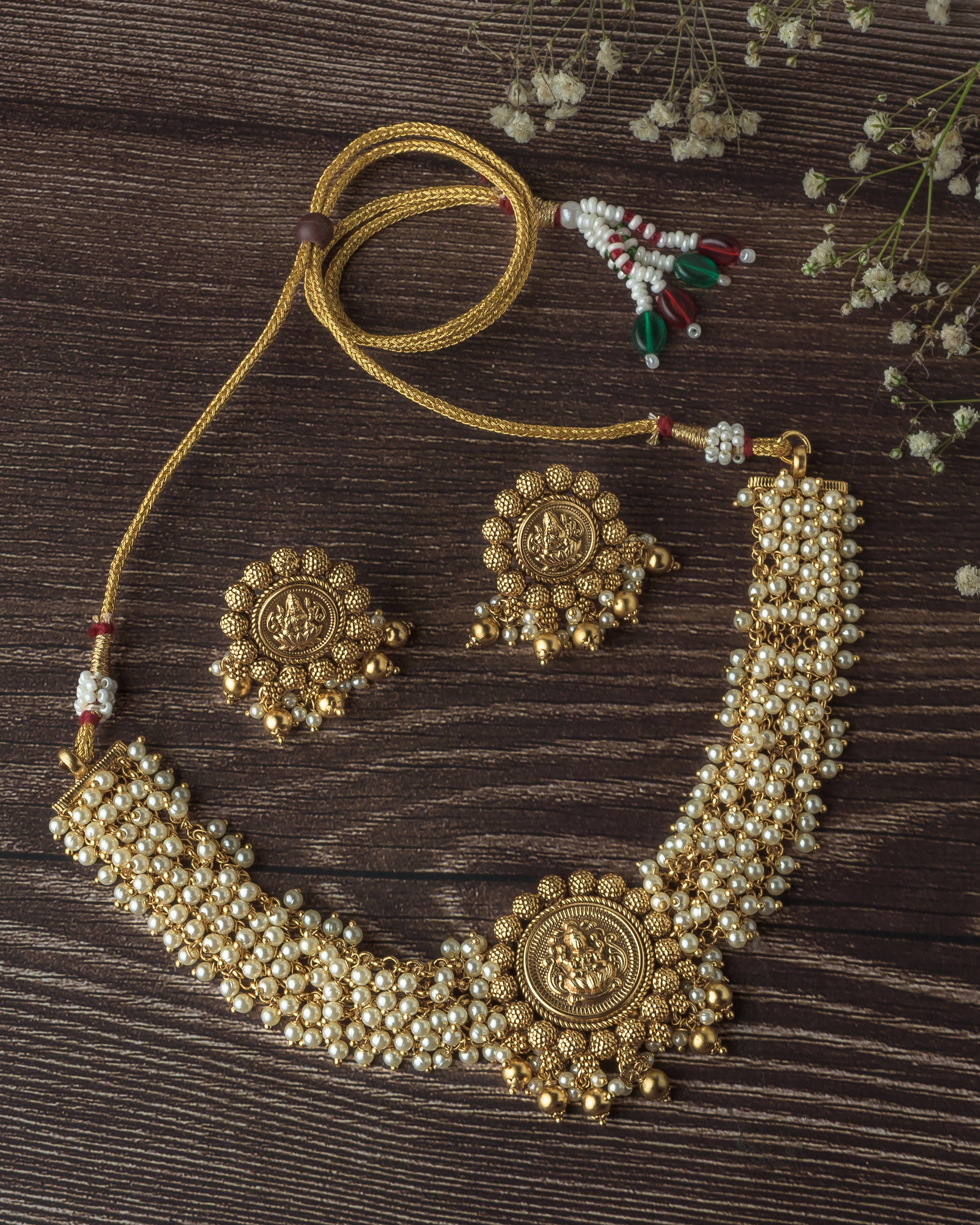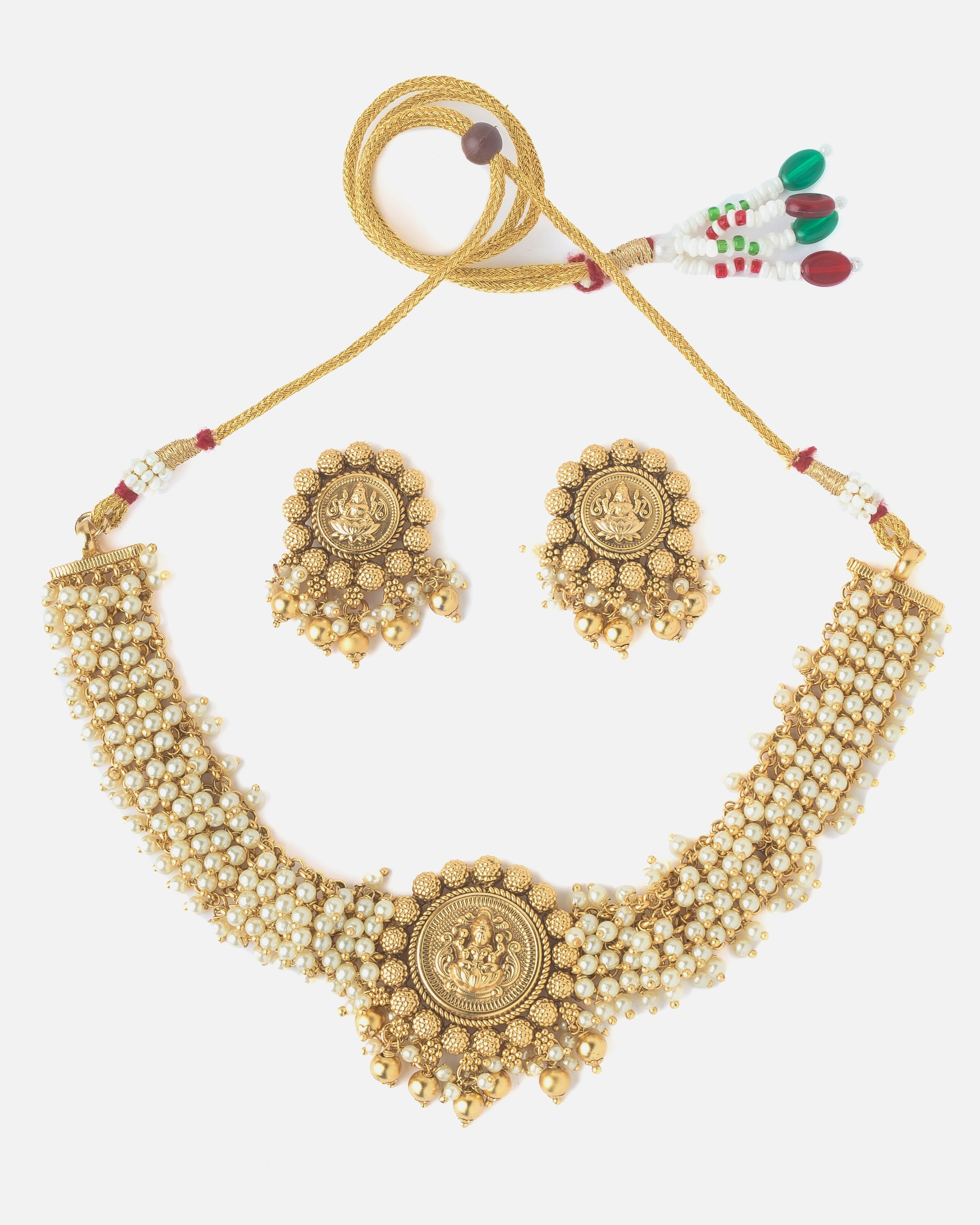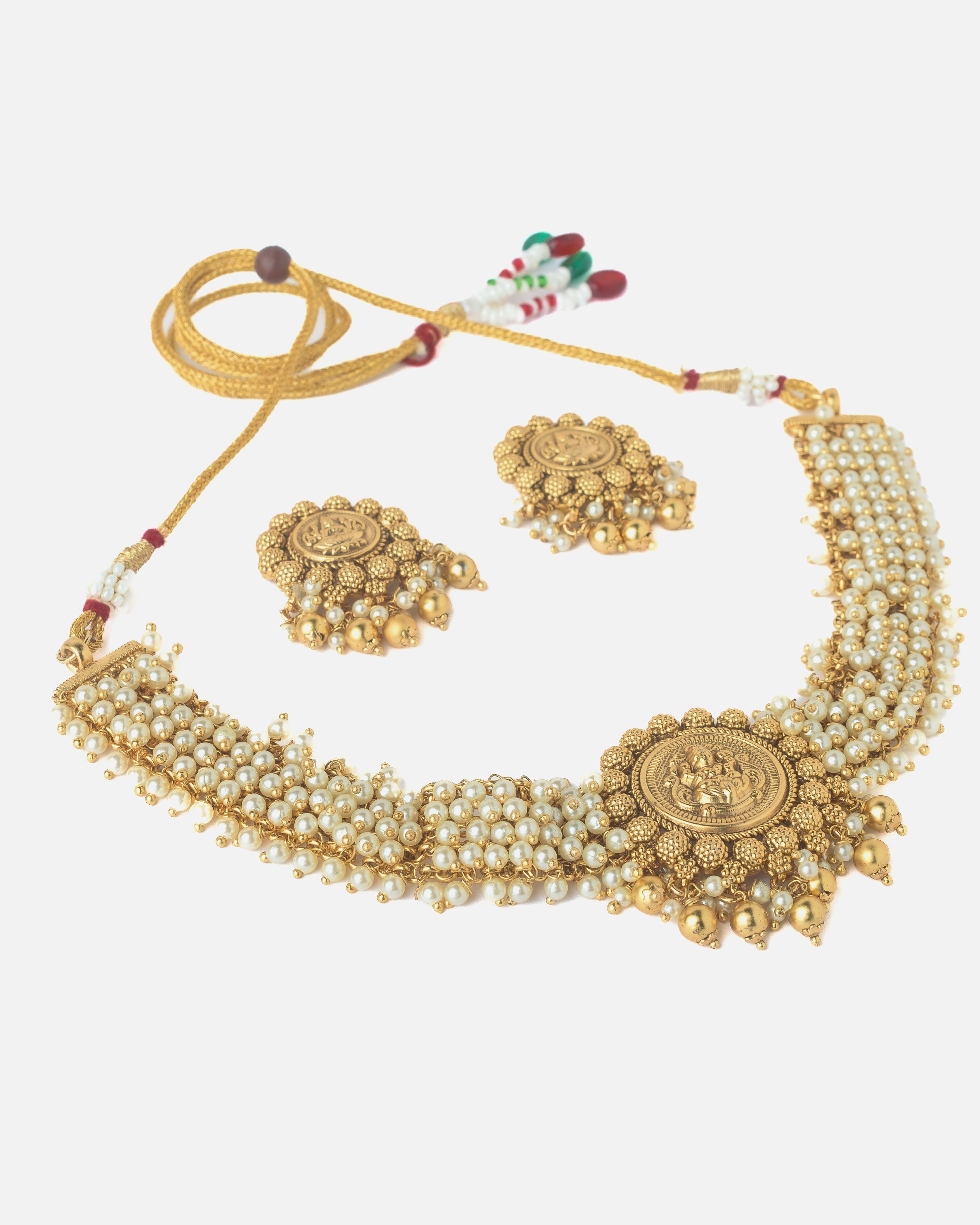 Enhance your ethnic charm with this traditional gold-tone necklace set featuring intricate temple motifs, pearl clusters, and matching earrings. Perfect for weddings, festivals, and cultural occasions.