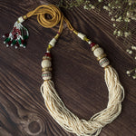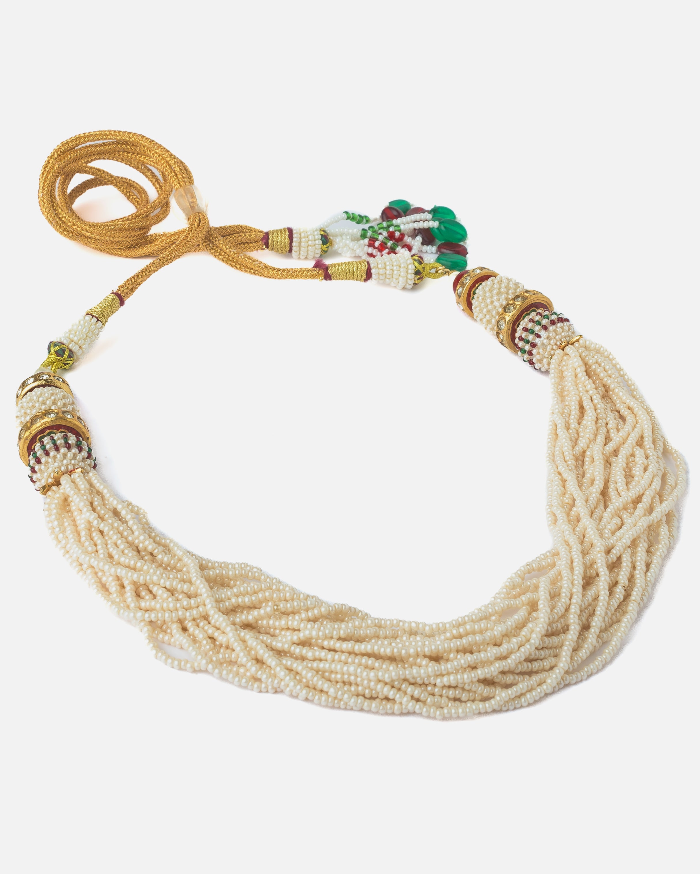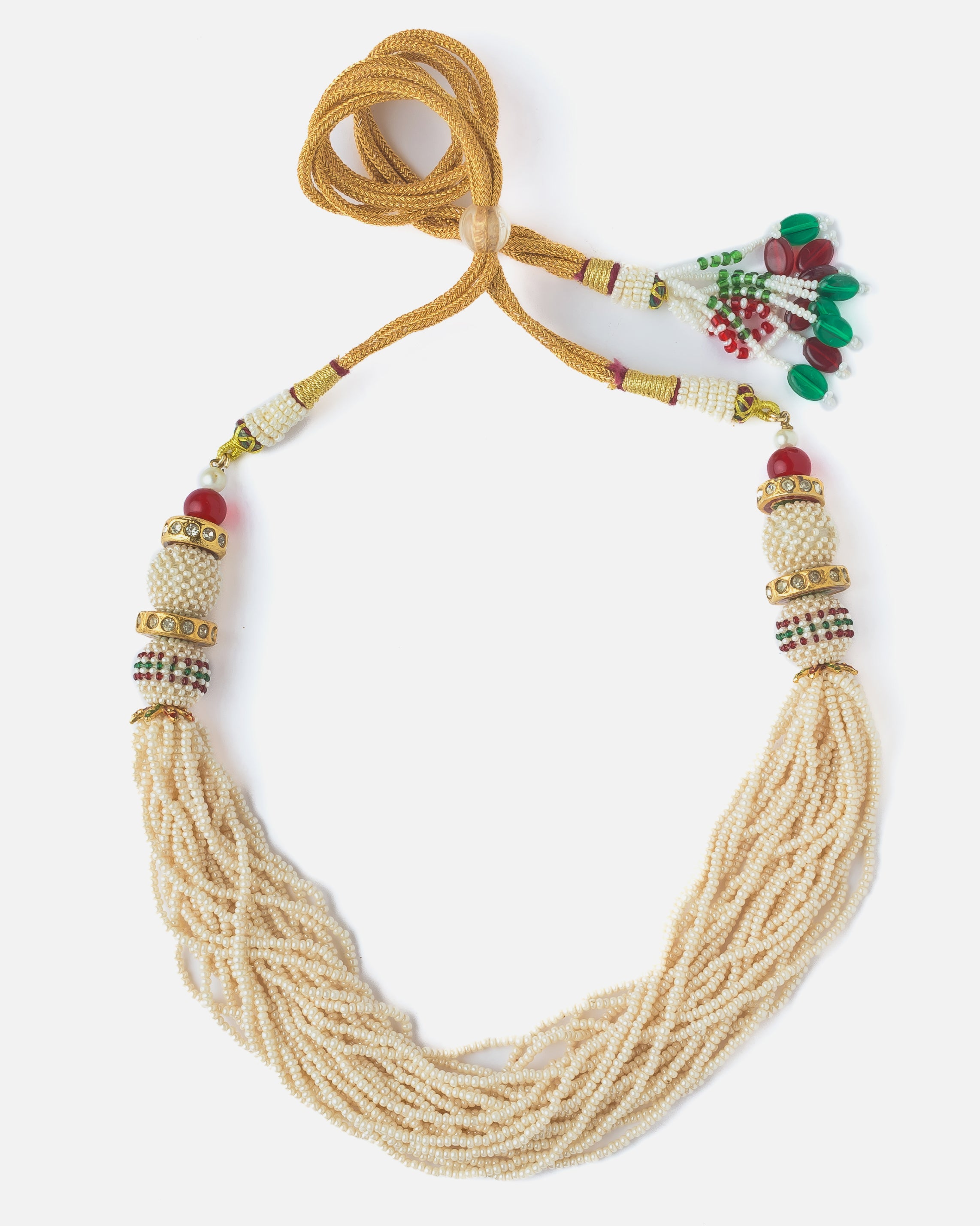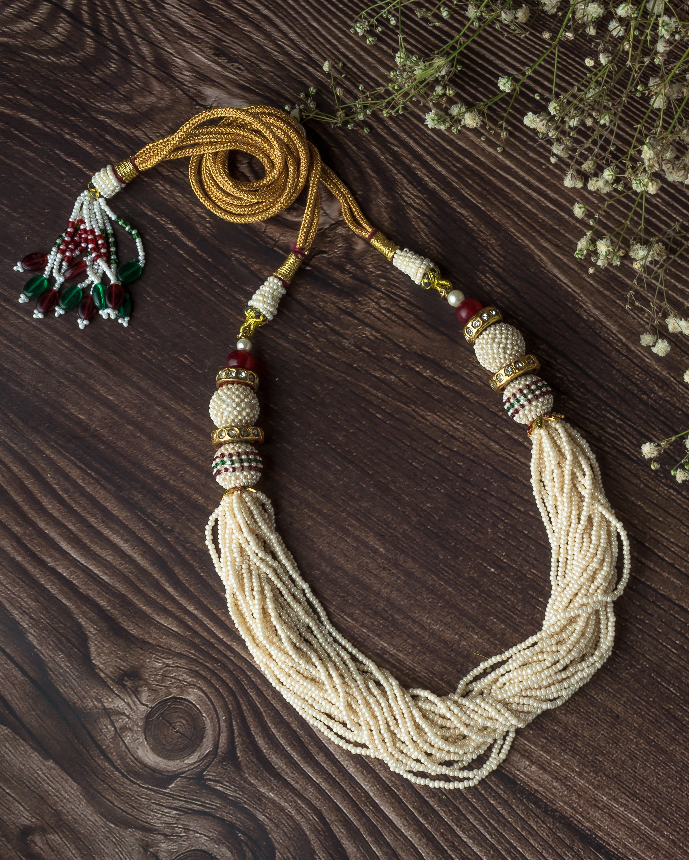 Elegant multi-strand pearl necklace with intricate beadwork, golden accents, and red-green tassels. Perfect for weddings, festivals, and traditional occasions. Handcrafted to reflect timeless beauty.