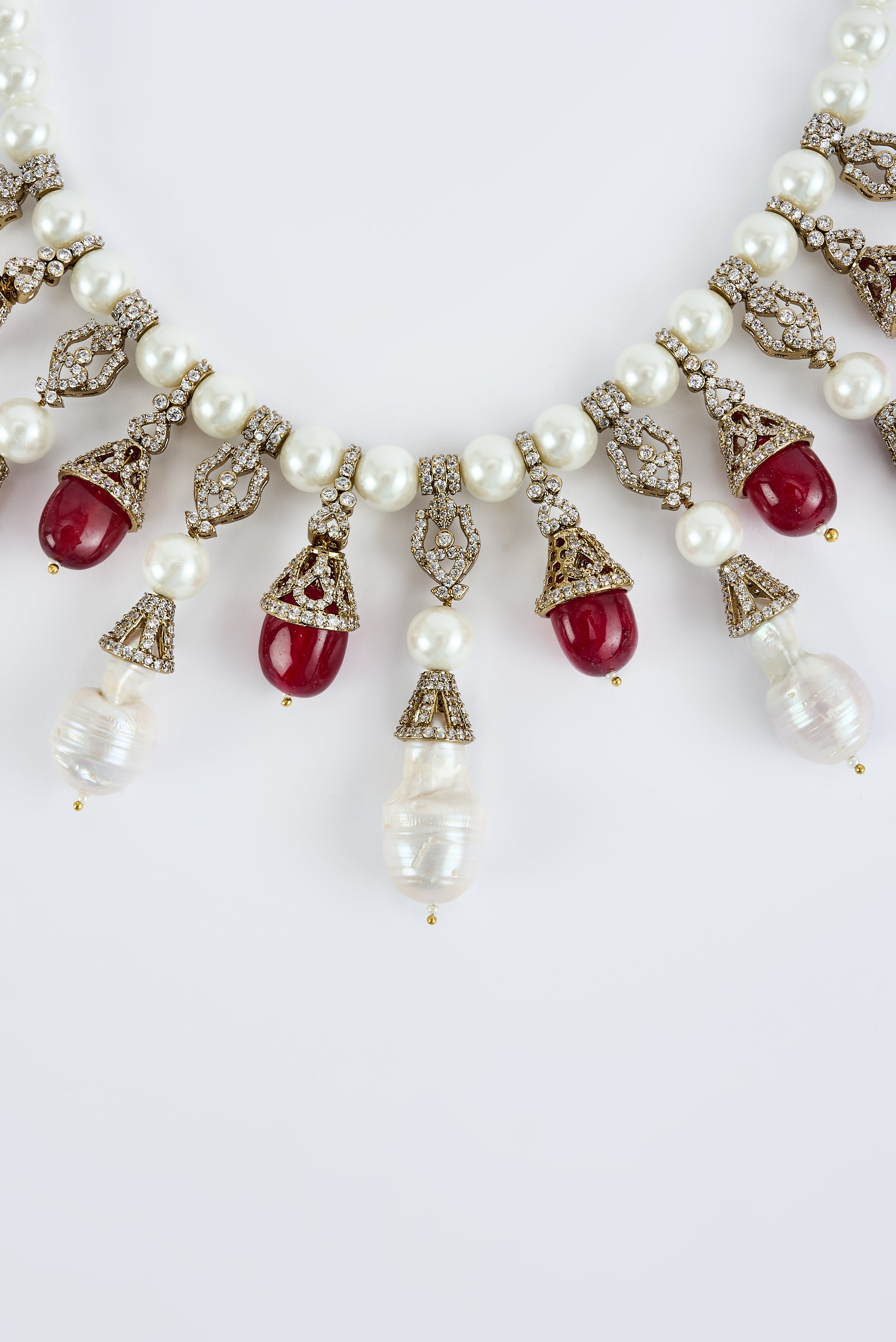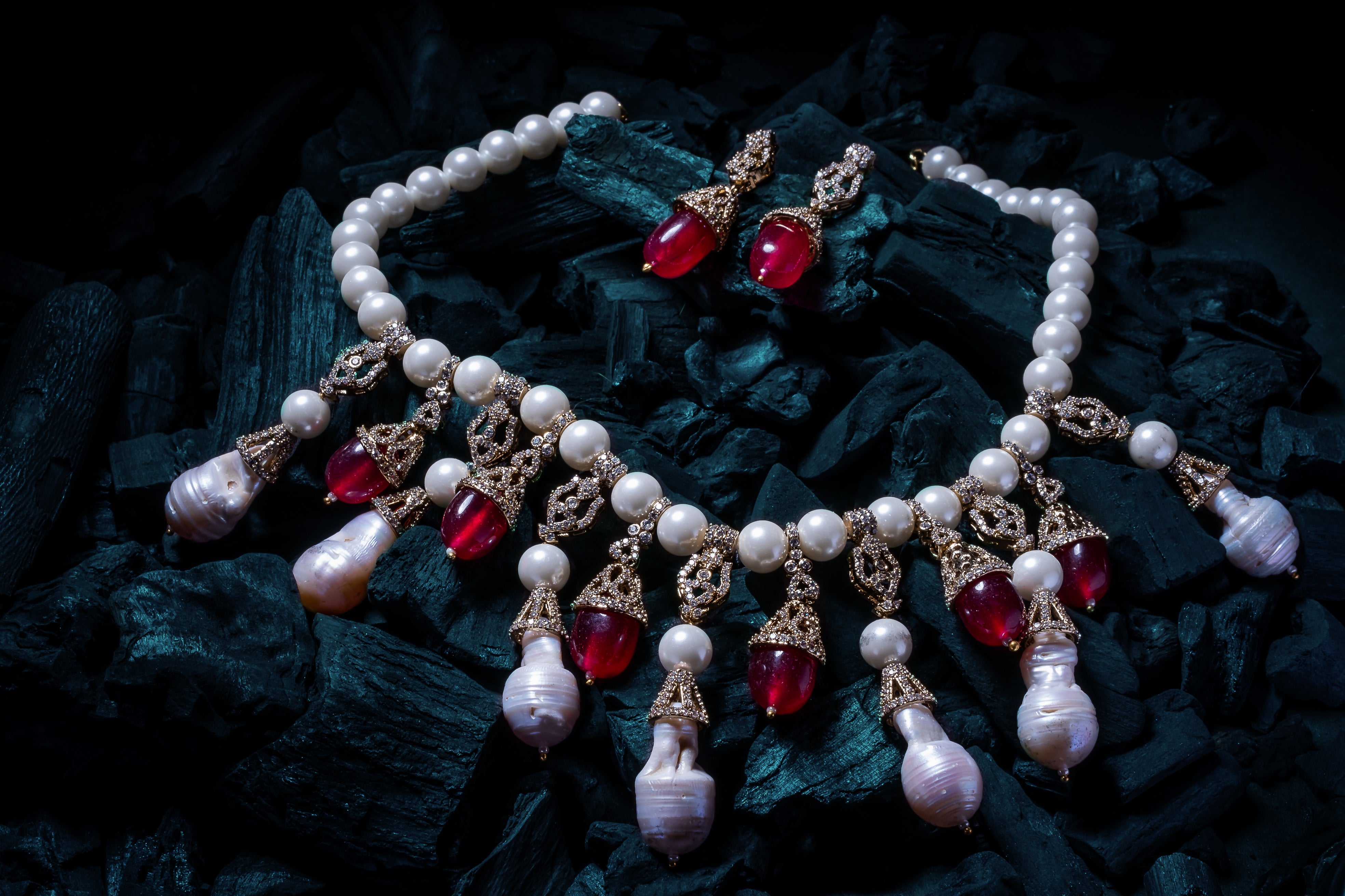 - Elegant Design: Features a sophisticated pearl necklace with ruby-colored drops and baroque white pearls, exuding timeless elegance.