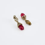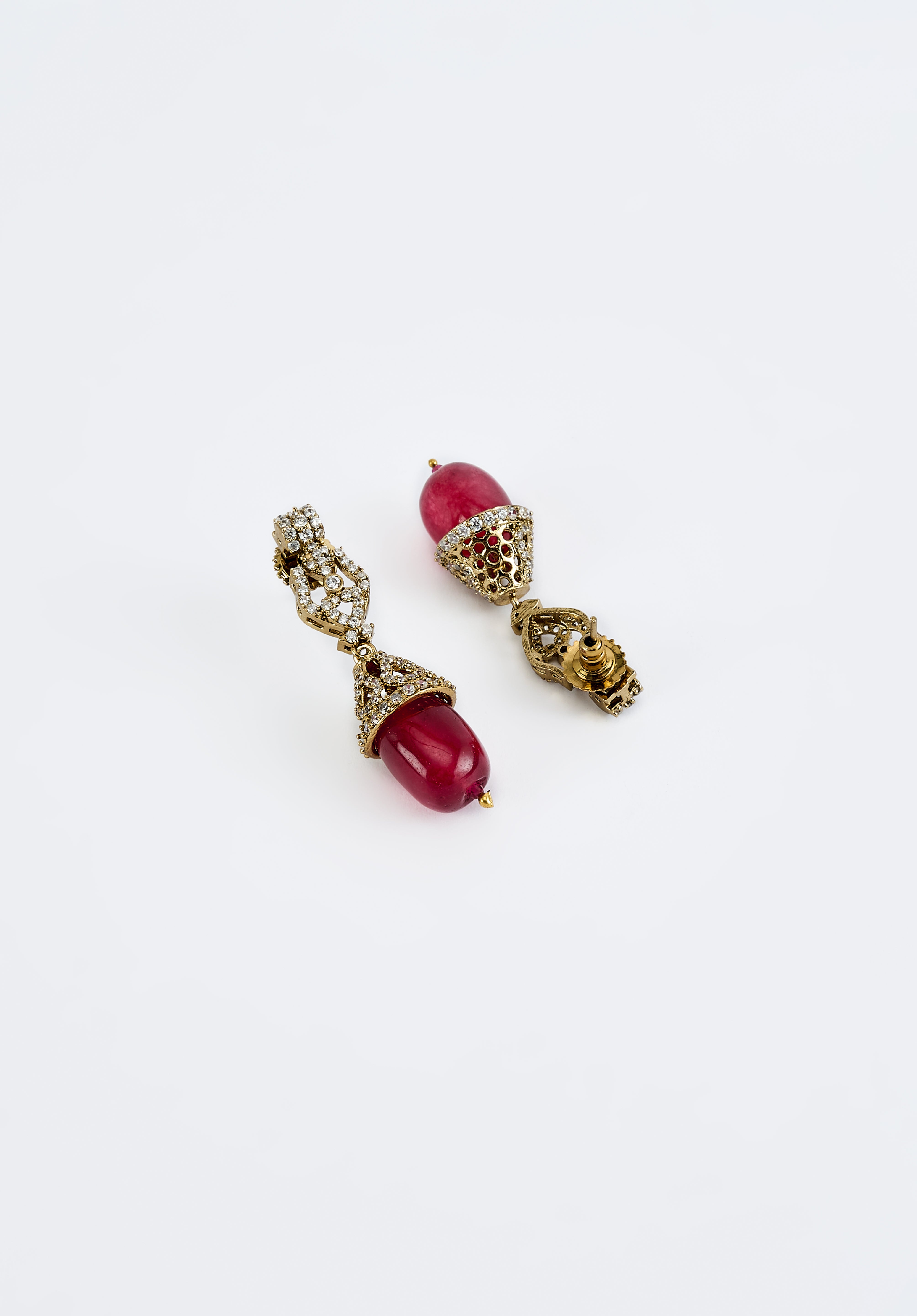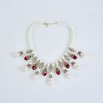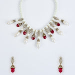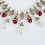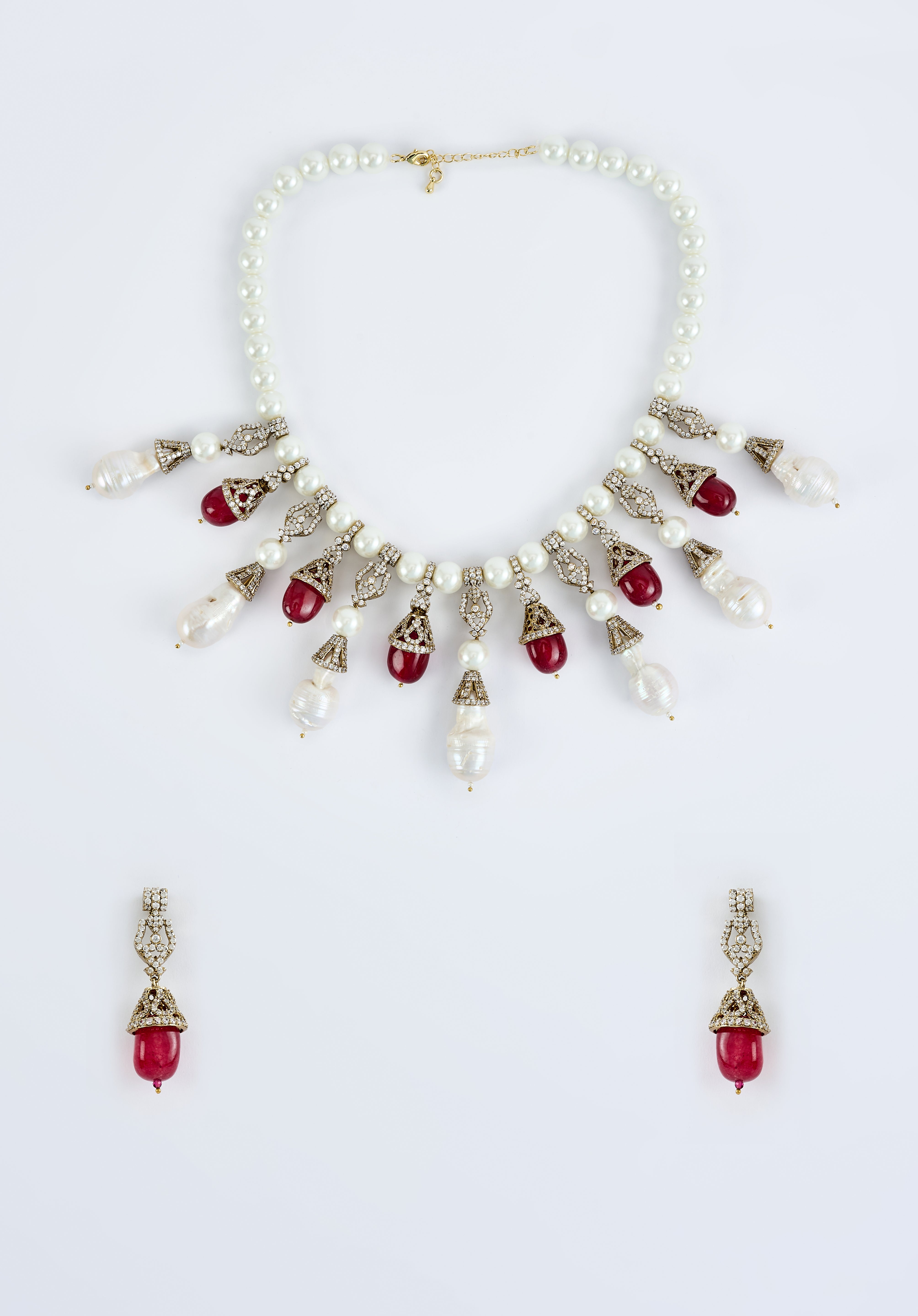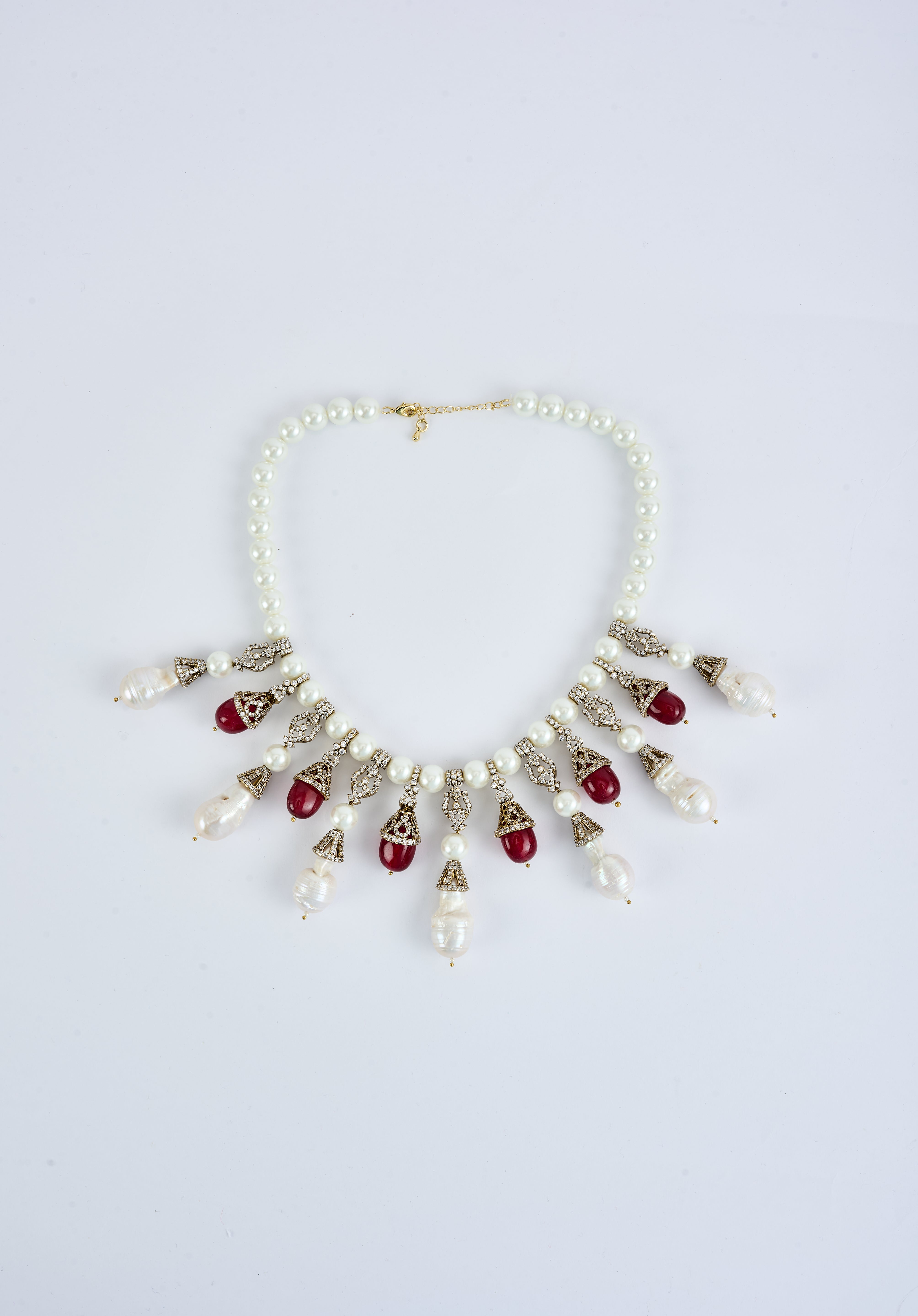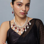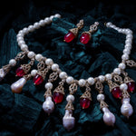 Elegant pearl necklace adorned with ruby-colored accents & baroque-style white pearls, paired with matching earrings. Perfect for weddings, parties & festive celebrations. Luxurious & timeless design