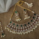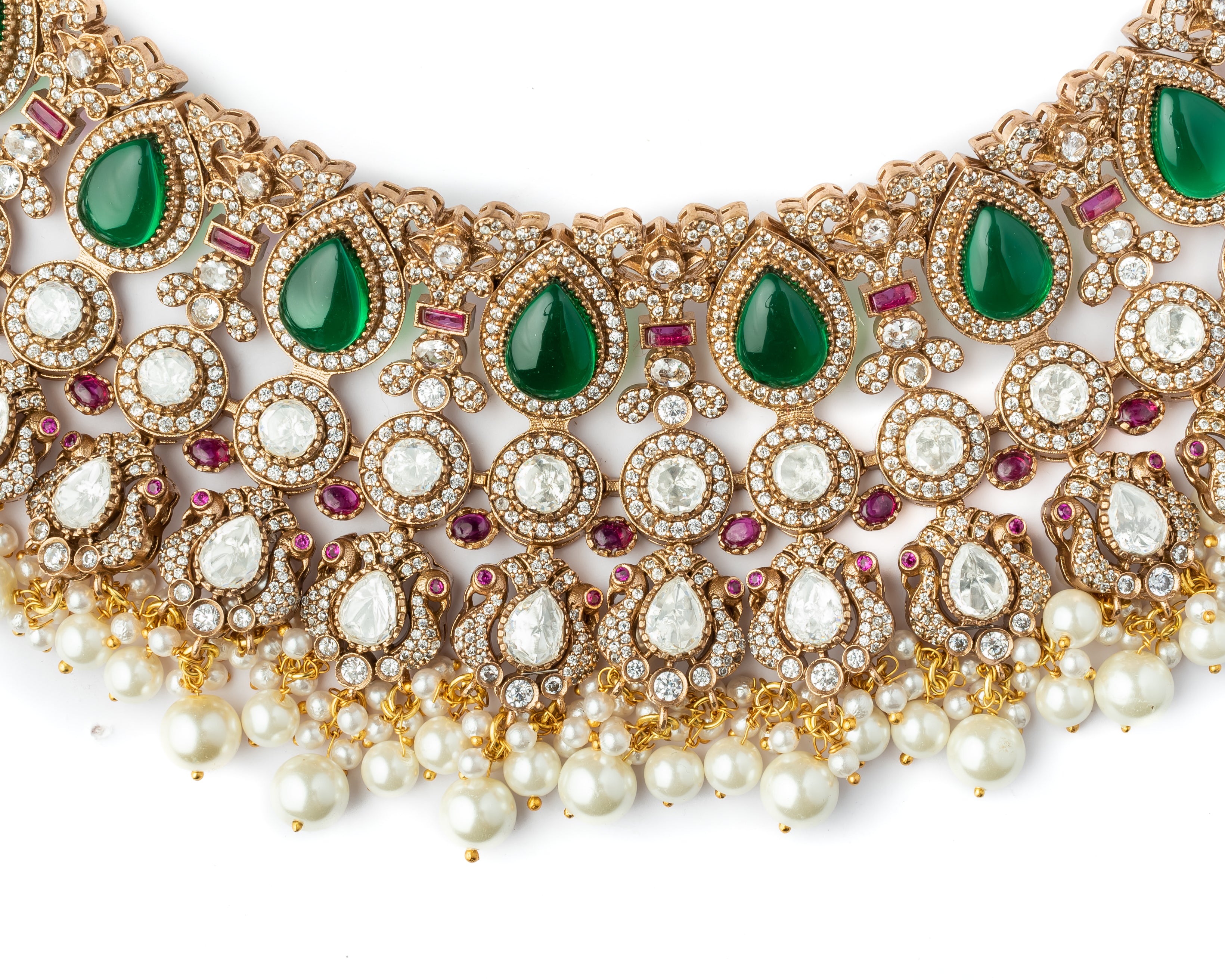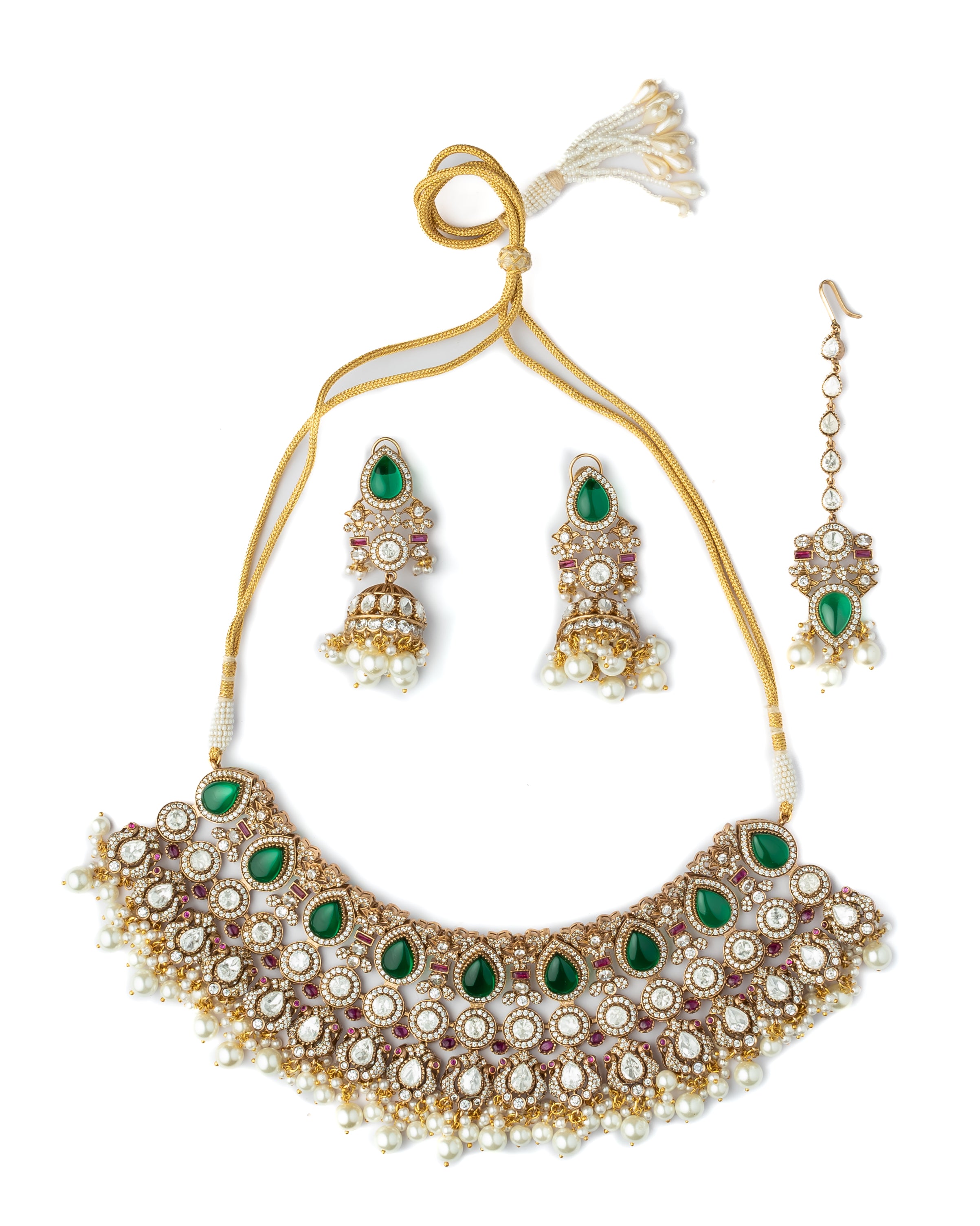 • Elegant Design: Features a regal choker with uncut diamonds, emerald green stones, and pearls.