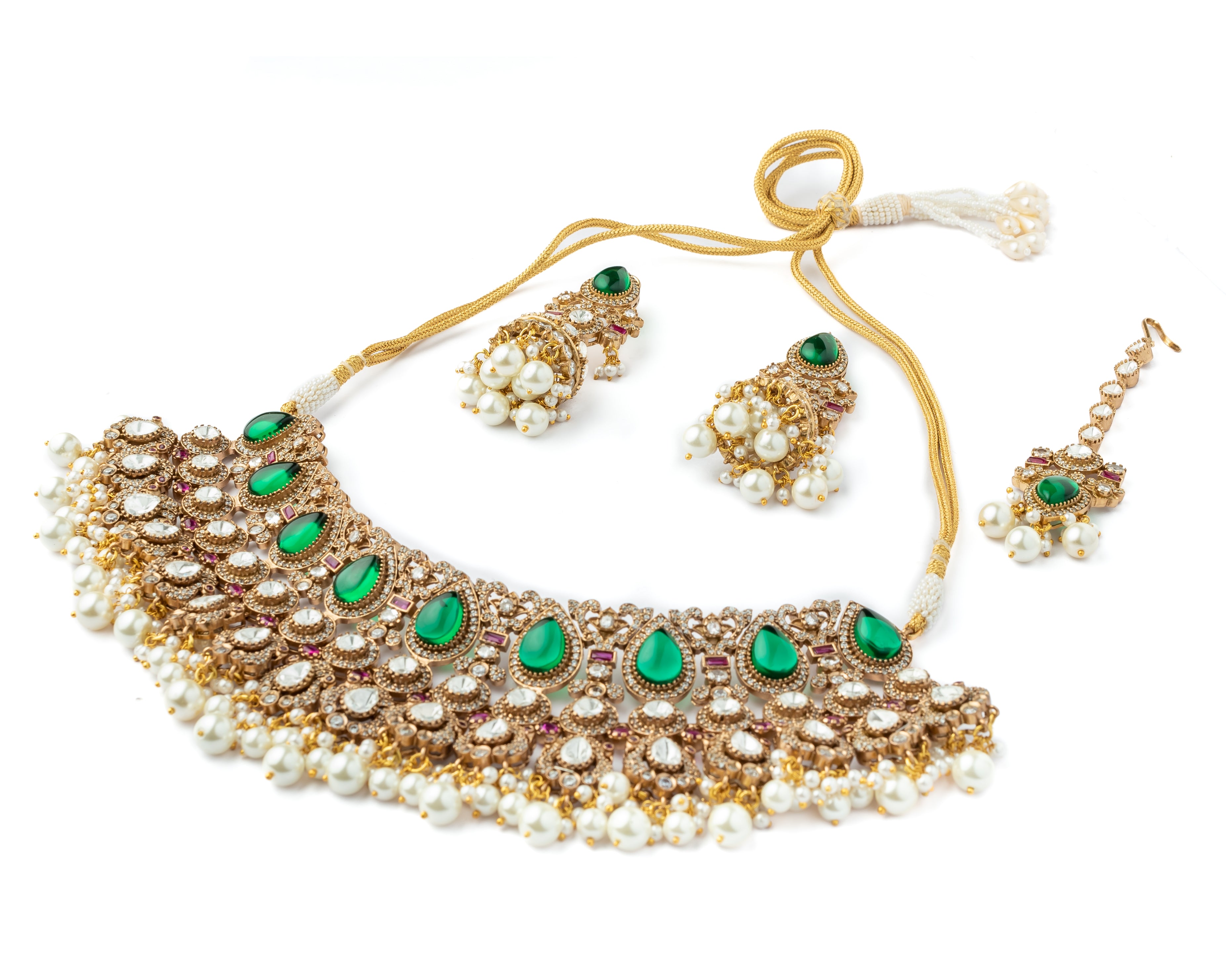 Royal gold choker set adorned with emerald green stones, uncut diamonds, and pearls. Paired with matching earrings and a maang tikka, perfect for weddings and grand celebrations.
