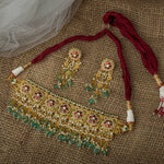 Elegant handcrafted gold-tone choker set with intricate Kundan work, red & green stone embellishments, and pearl drops. Paired with matching earrings for a regal ethnic charm.