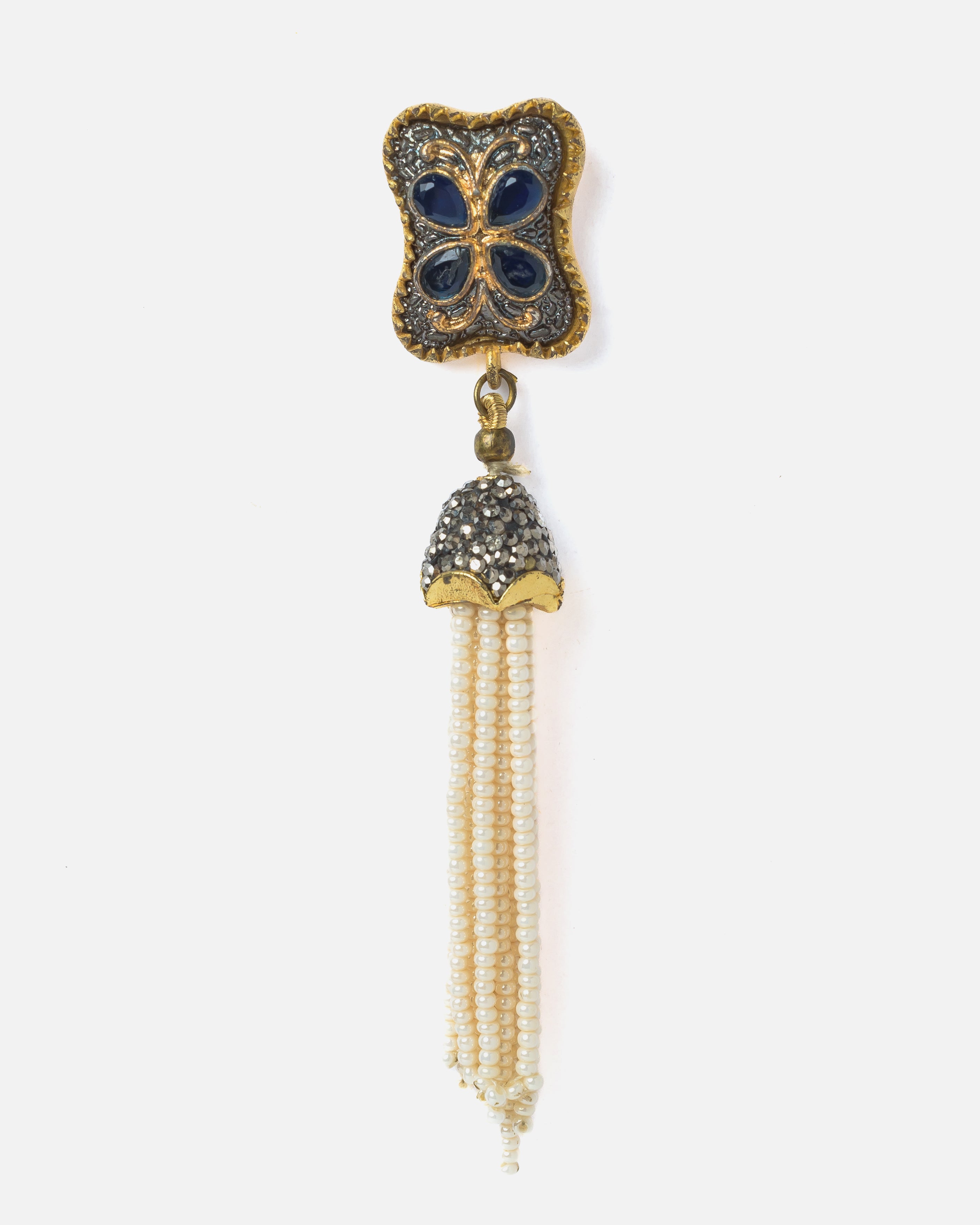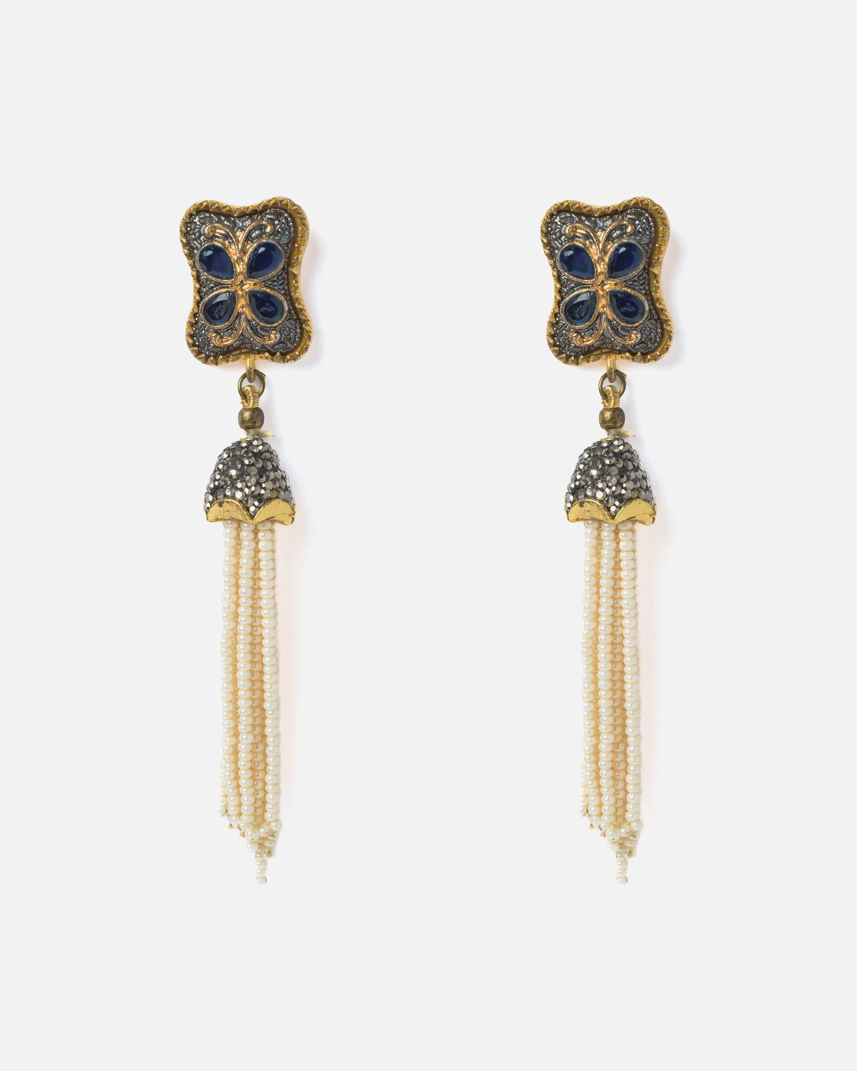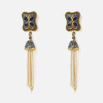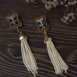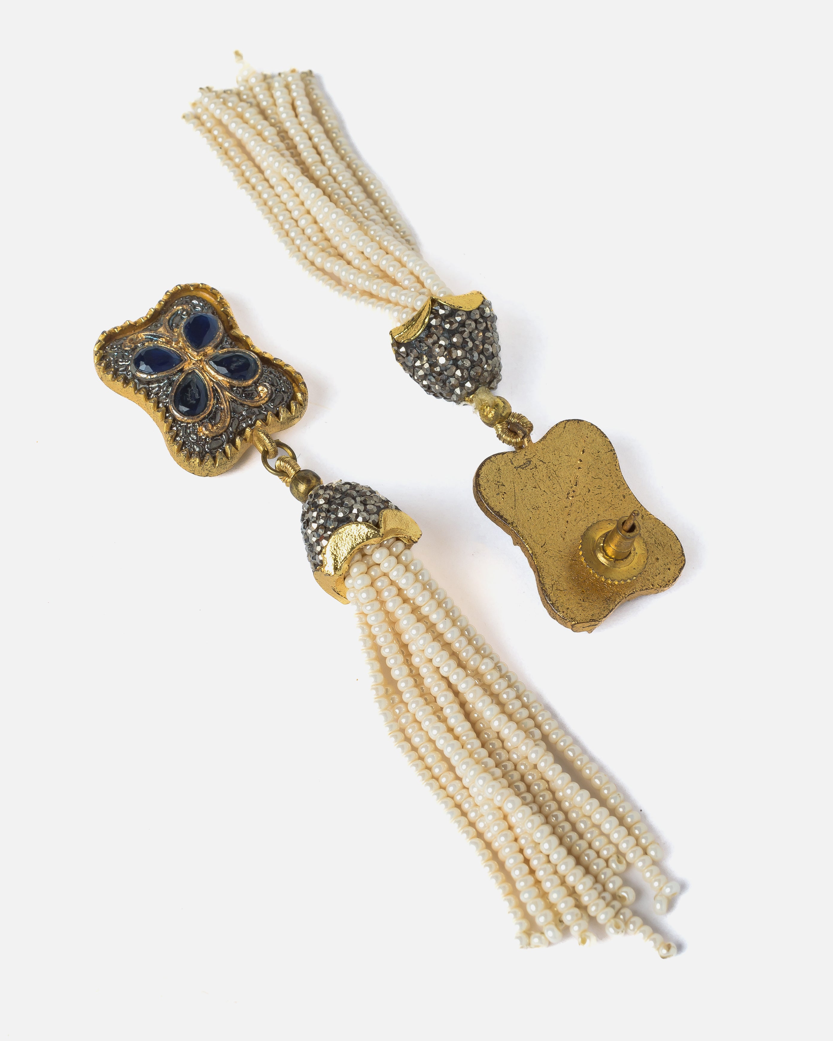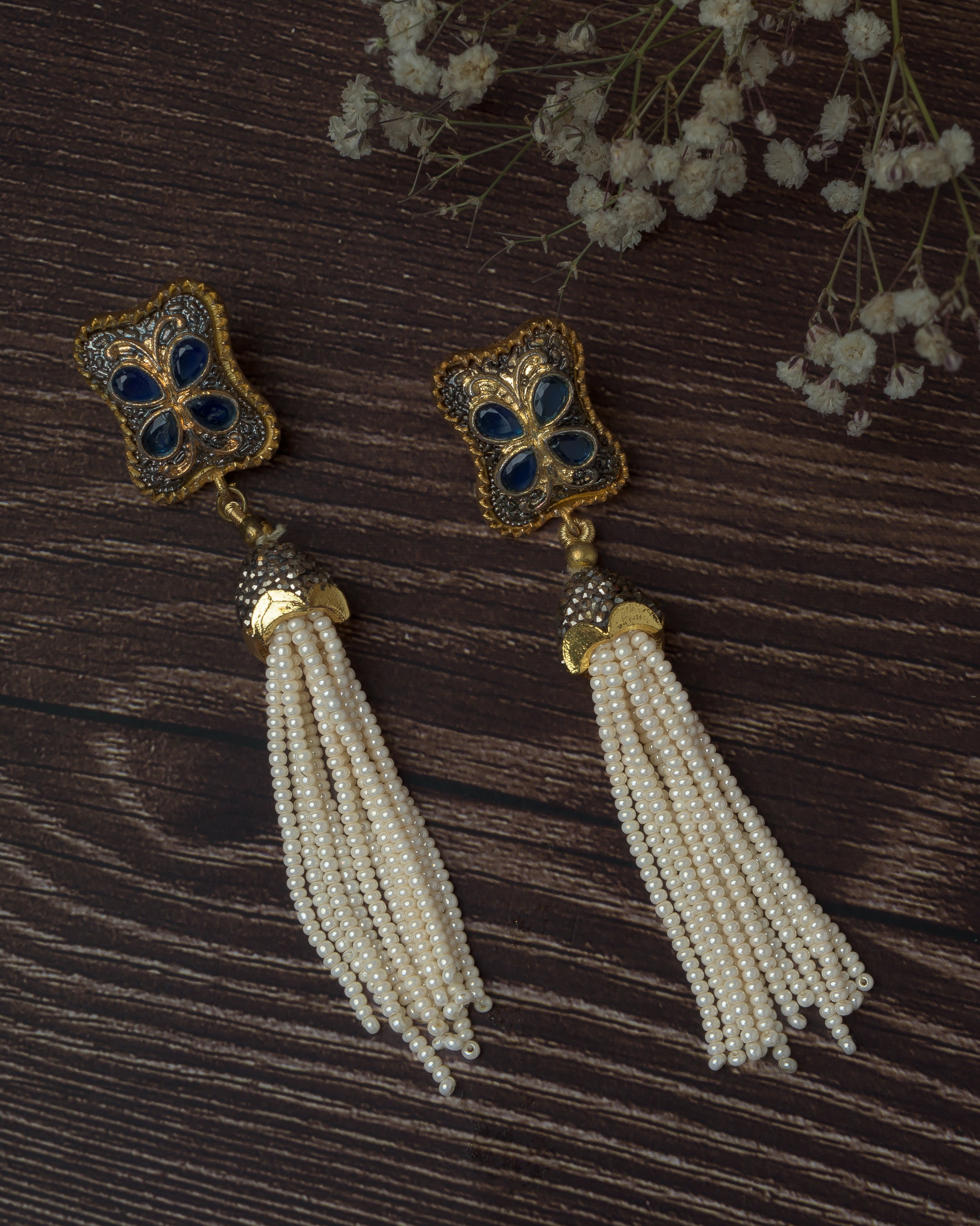 Elegant tassel earrings featuring a blue stone-studded floral design with cascading pearl-like beads. Perfect for festive and ethnic occasions, adding a touch of charm and grace to your look.