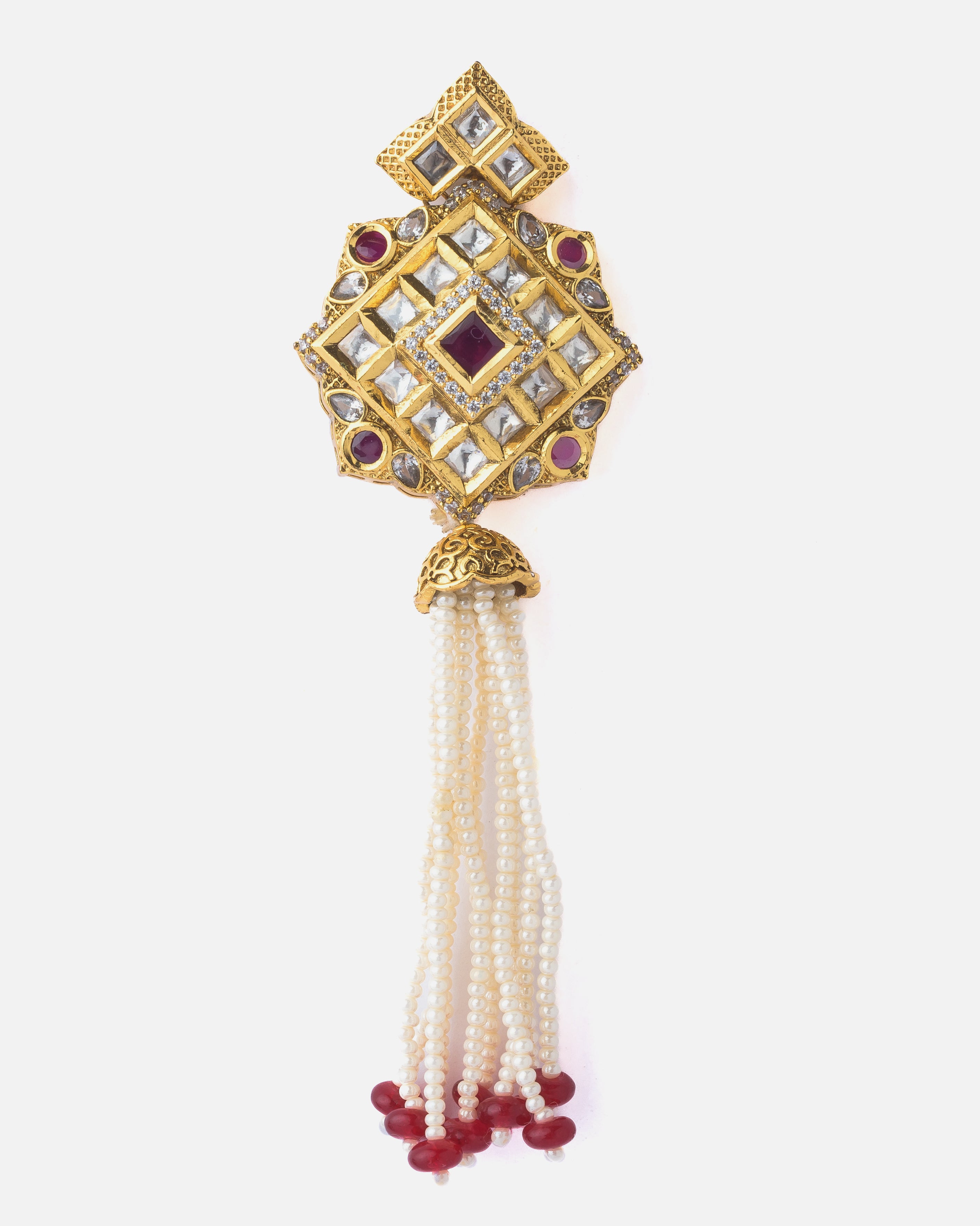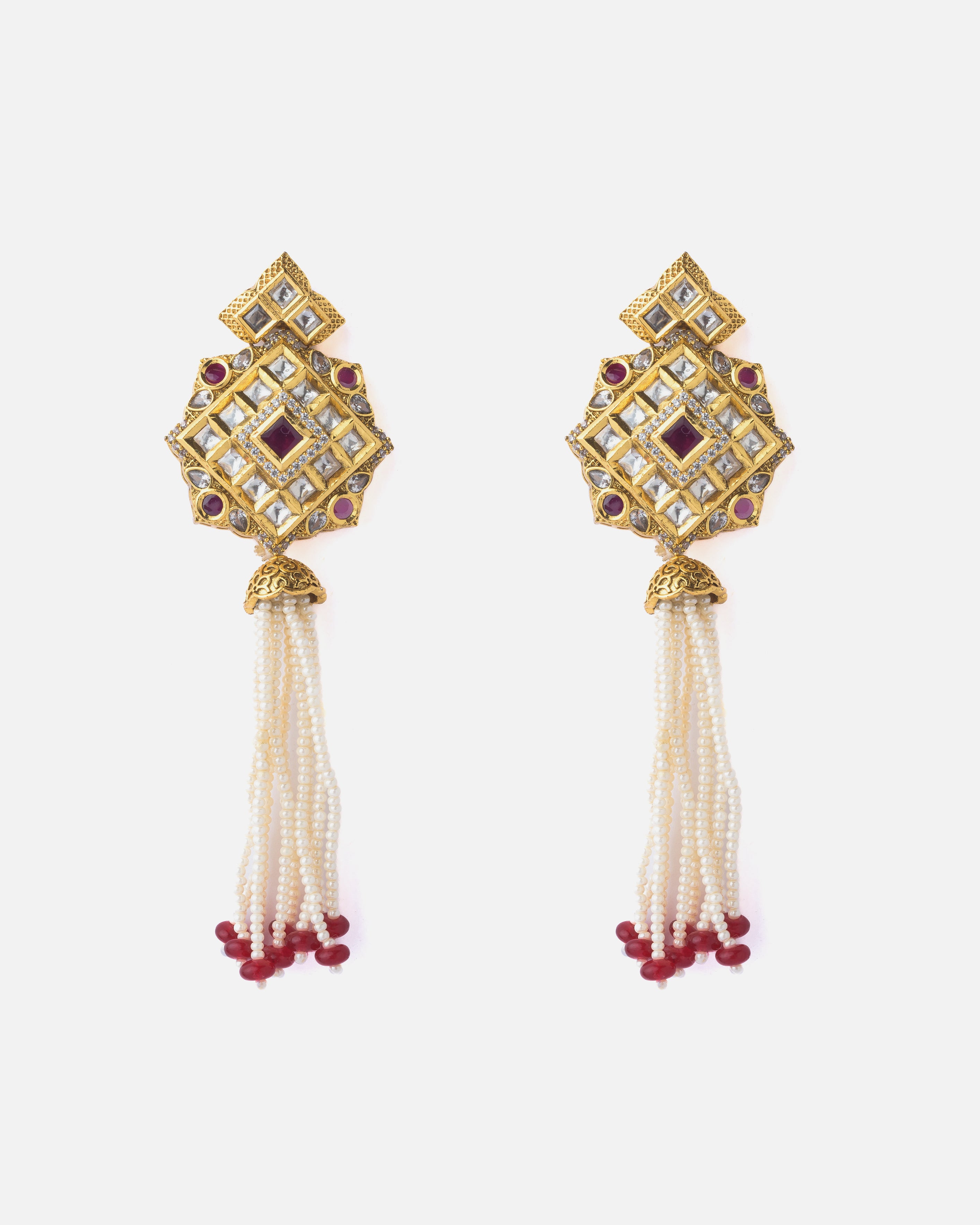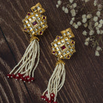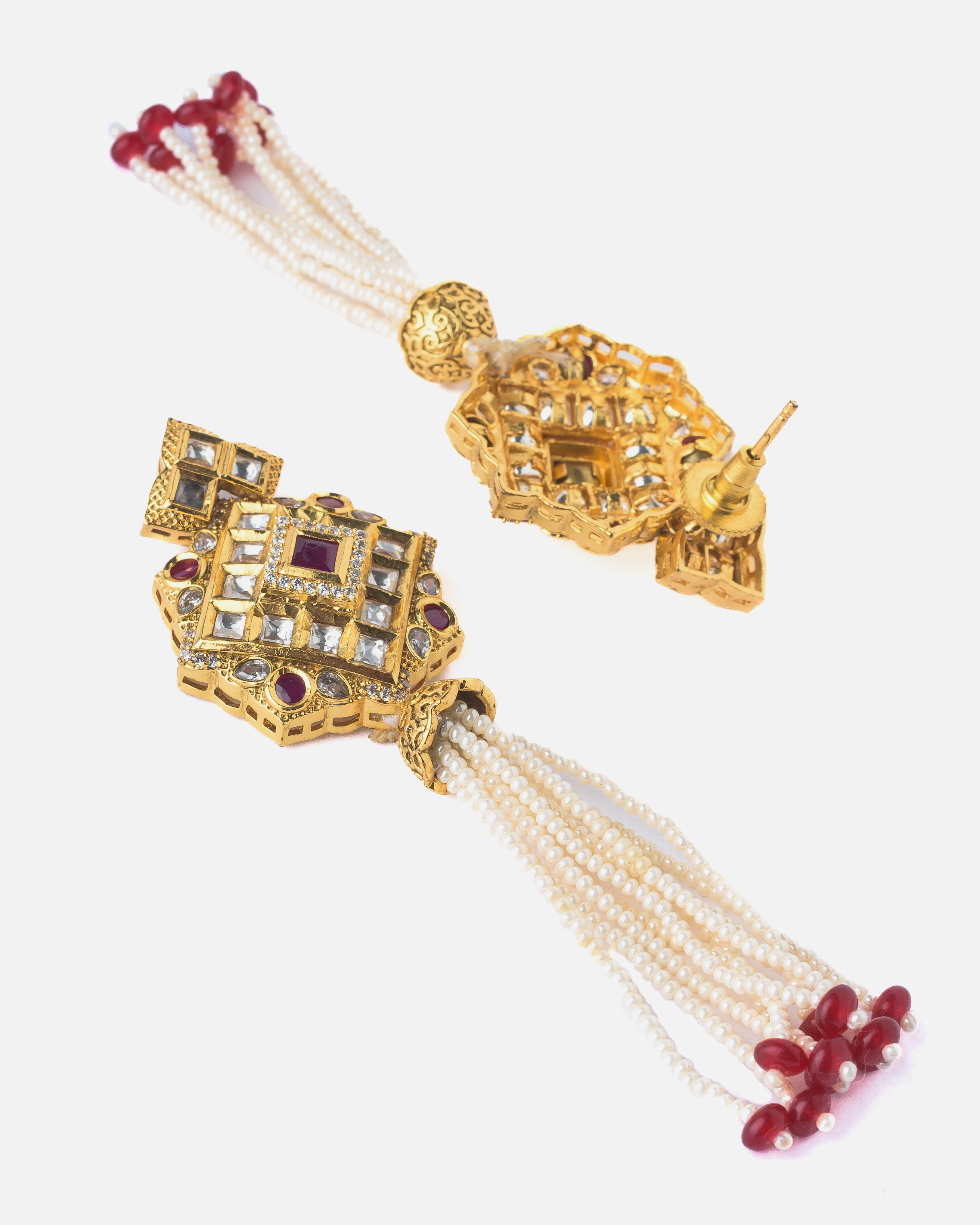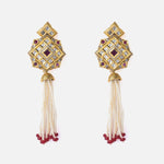 These elegant ethnic earrings feature intricate gold-tone detailing with mirror and ruby-red stone inlays, finished with cascading pearl strands and red bead tips—perfect for traditional occasions.
