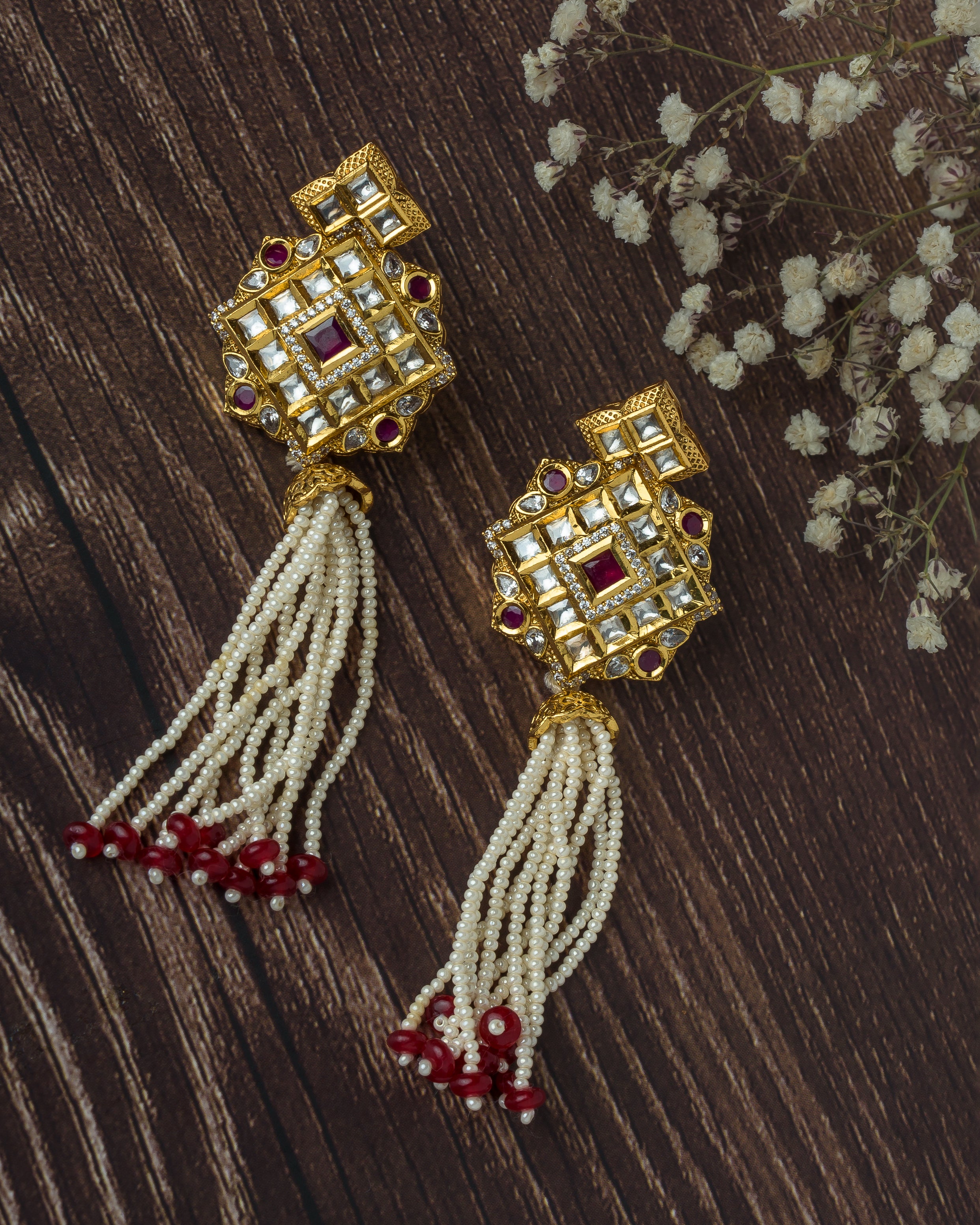 • Elegant Pearl Tassels: Multiple strands of white pearls with red bead ends add graceful movement.
