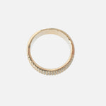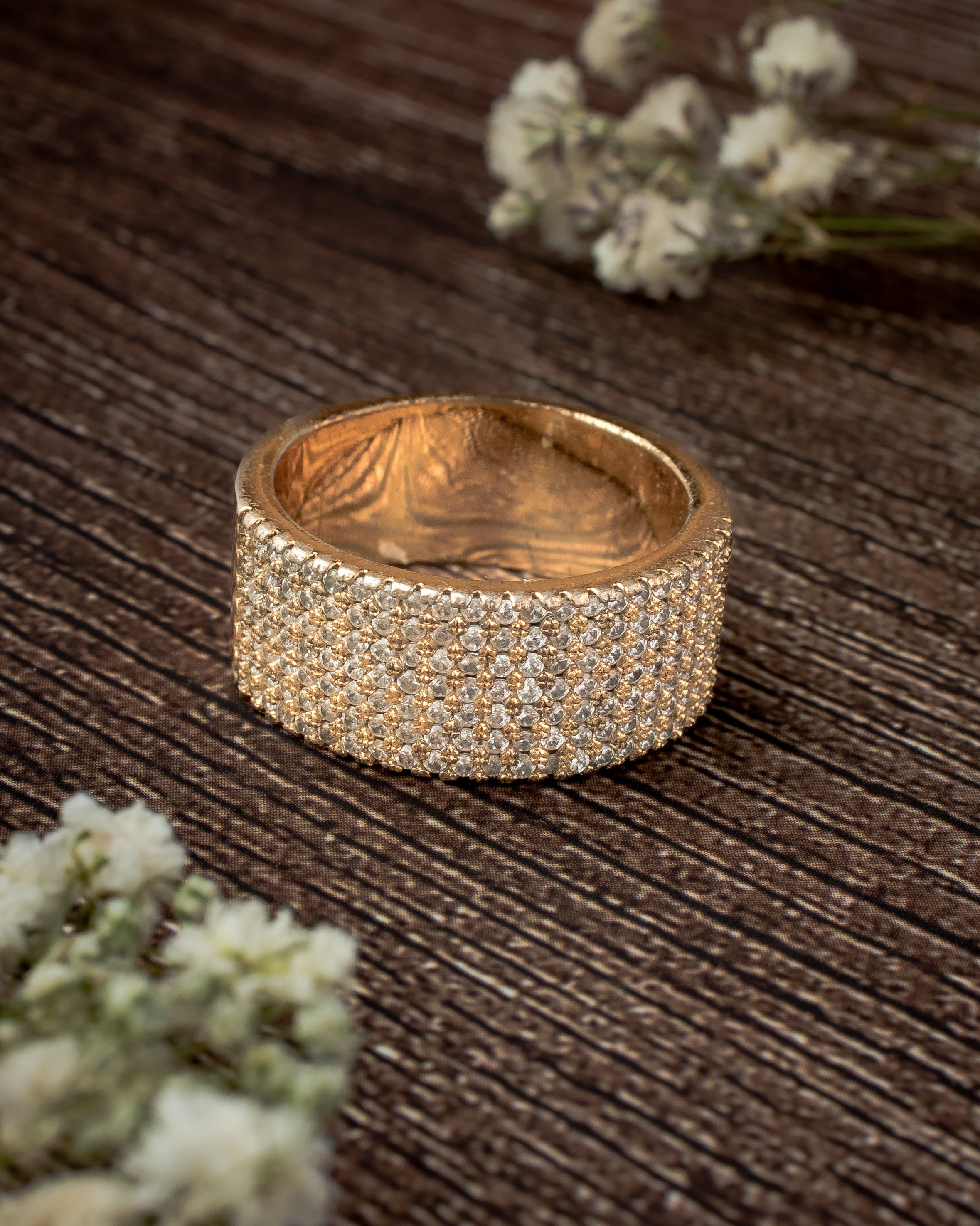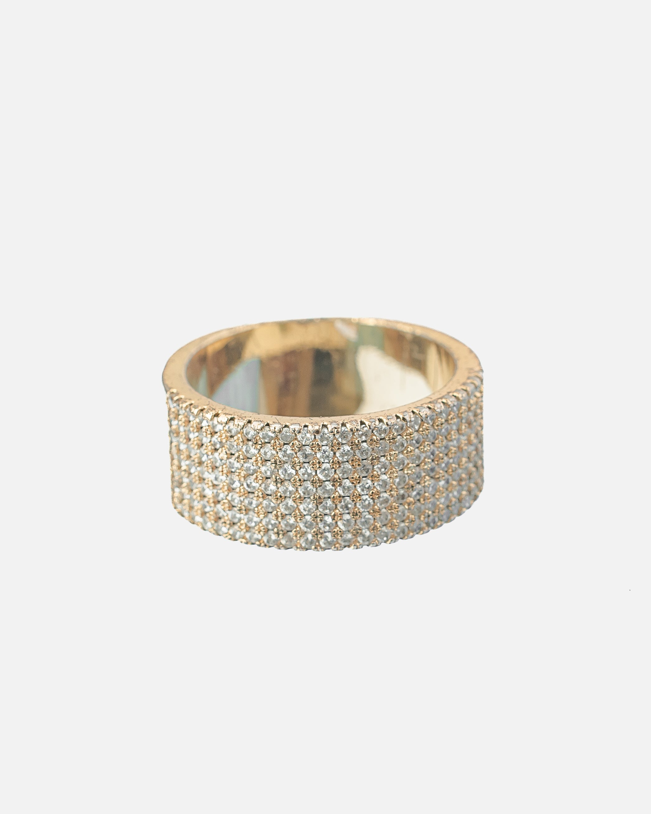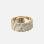 This luxurious wide-band ring features a bold design with rows of shimmering pave-set diamonds, all set on a sleek gold base. Its statement-making style blends timeless elegance with contemporary sophistication.