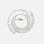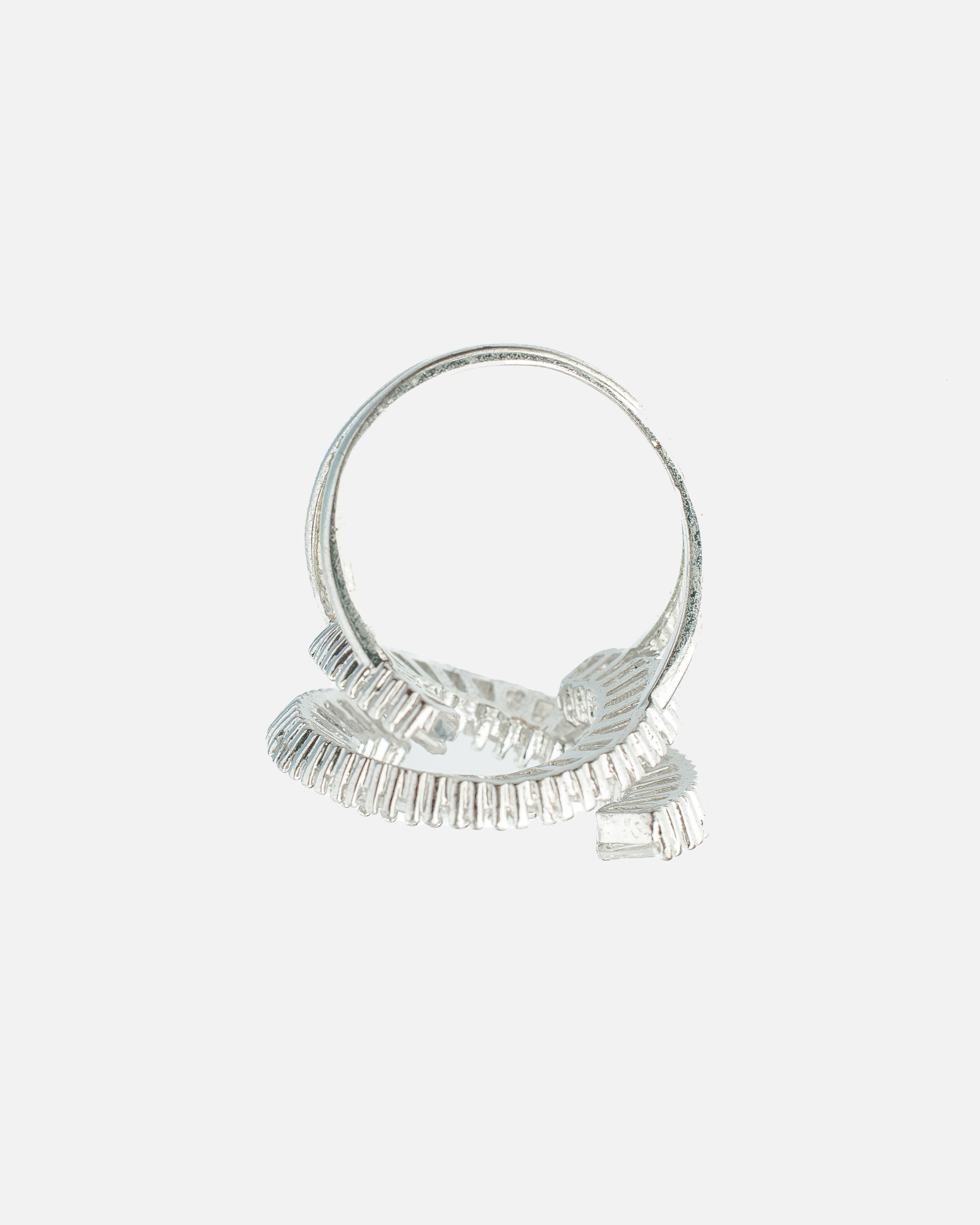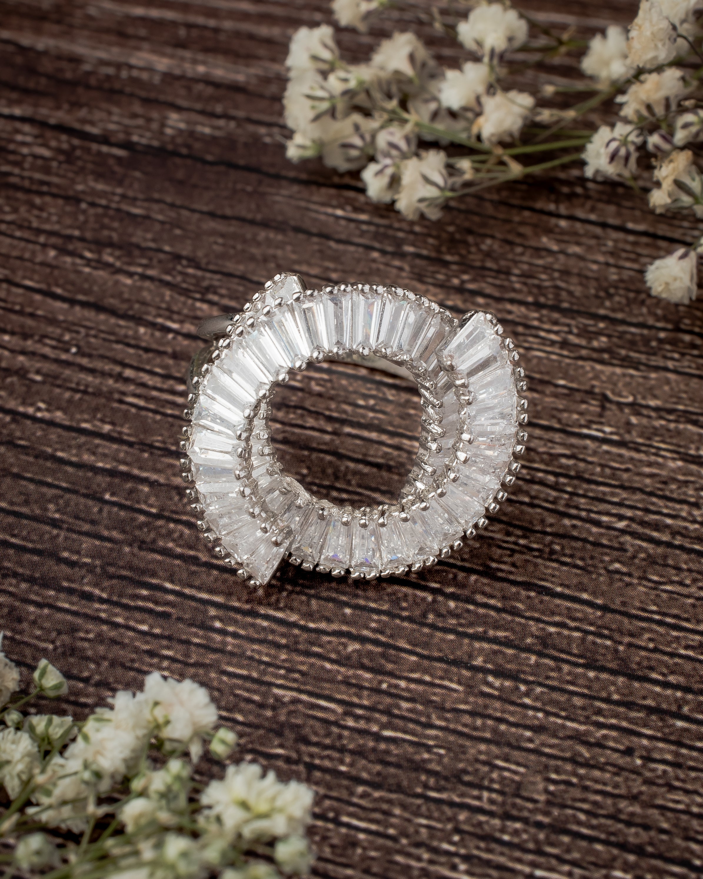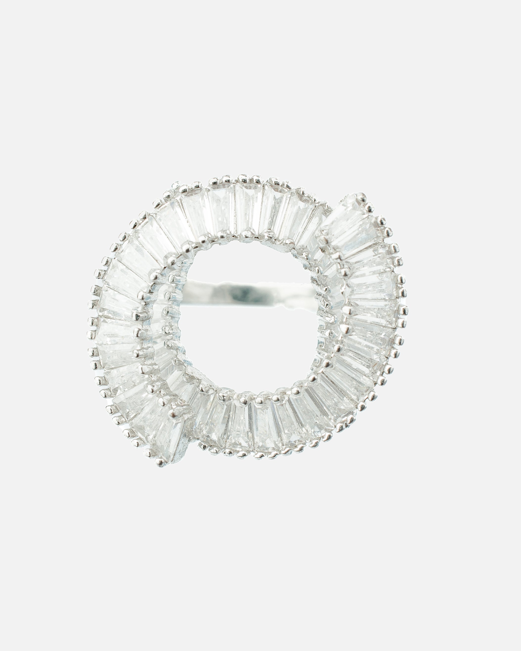 A dazzling open-circle ring featuring radiant baguette-cut stones, beautifully set in silver. Perfectly crafted for elegance, this unique design complements formal occasions or adds charm to everyday looks.