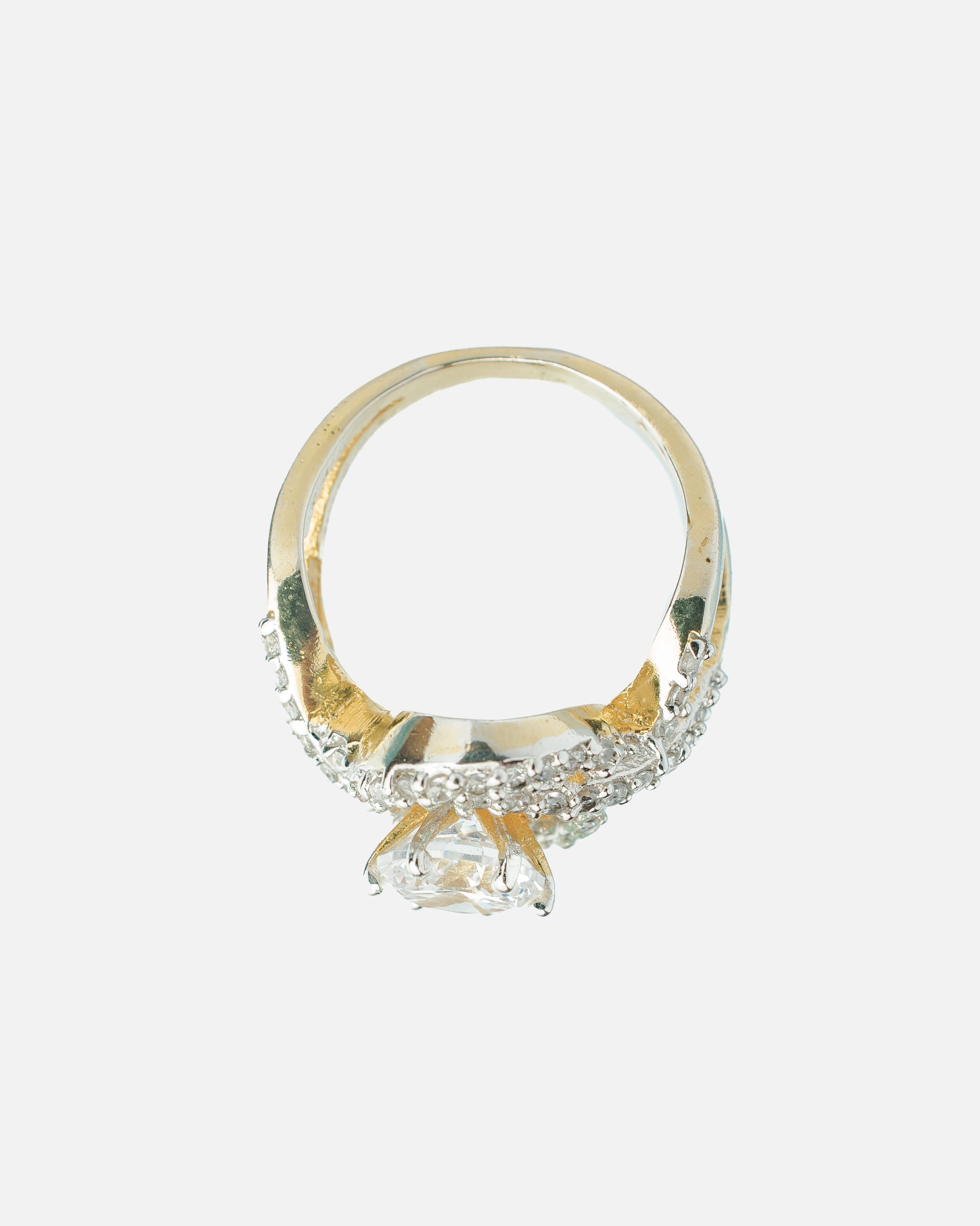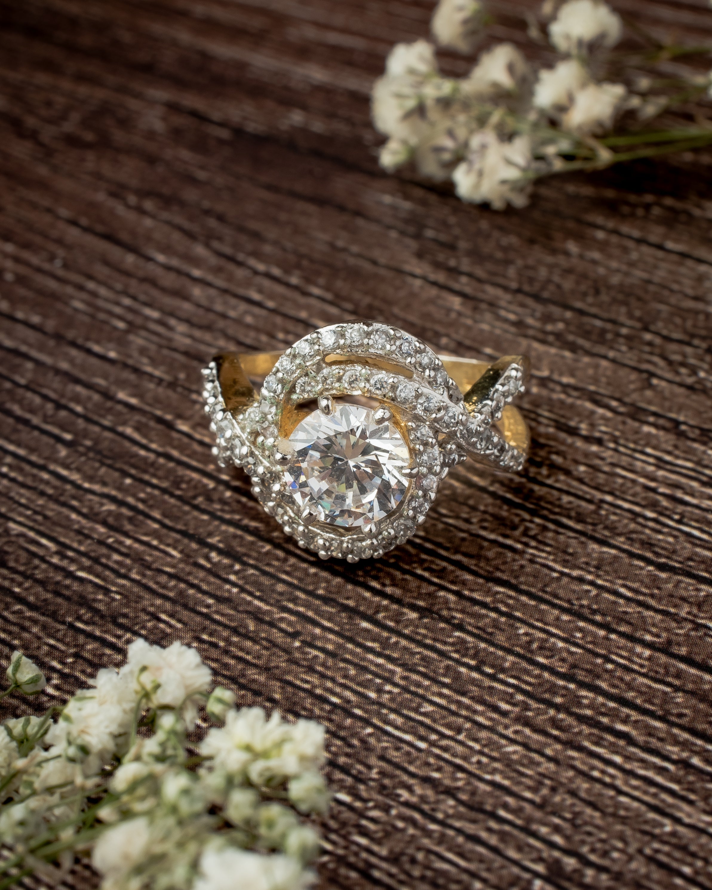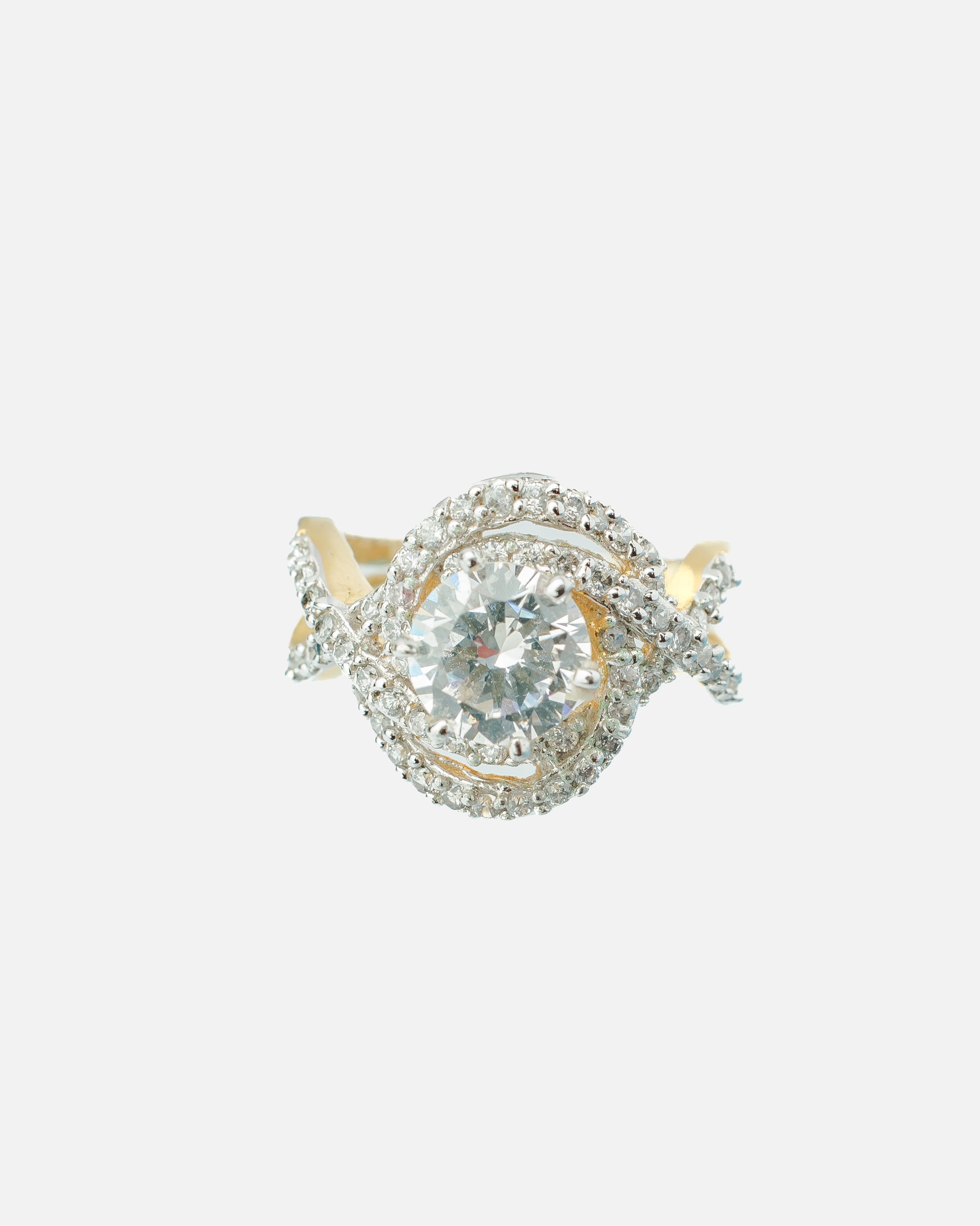 A stunning swirl-style ring featuring a radiant round centerpiece surrounded by sparkling pavé-set stones. Perfect for adding a touch of elegance and charm to any outfit or special occasion.