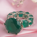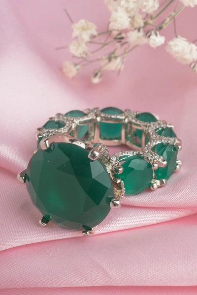 This elegant silver ring features striking green gemstones in a bold, faceted design, accented with delicate crystal details. Perfect for adding a touch of glamour and sophistication to any outfit.