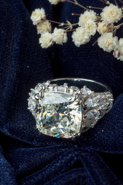 Dazzling luxury ring featuring a large cushion-cut diamond centrepiece, surrounded by a cluster of brilliant side stones set in a high-polish platinum band—crafted for timeless elegance and grandeur.