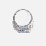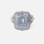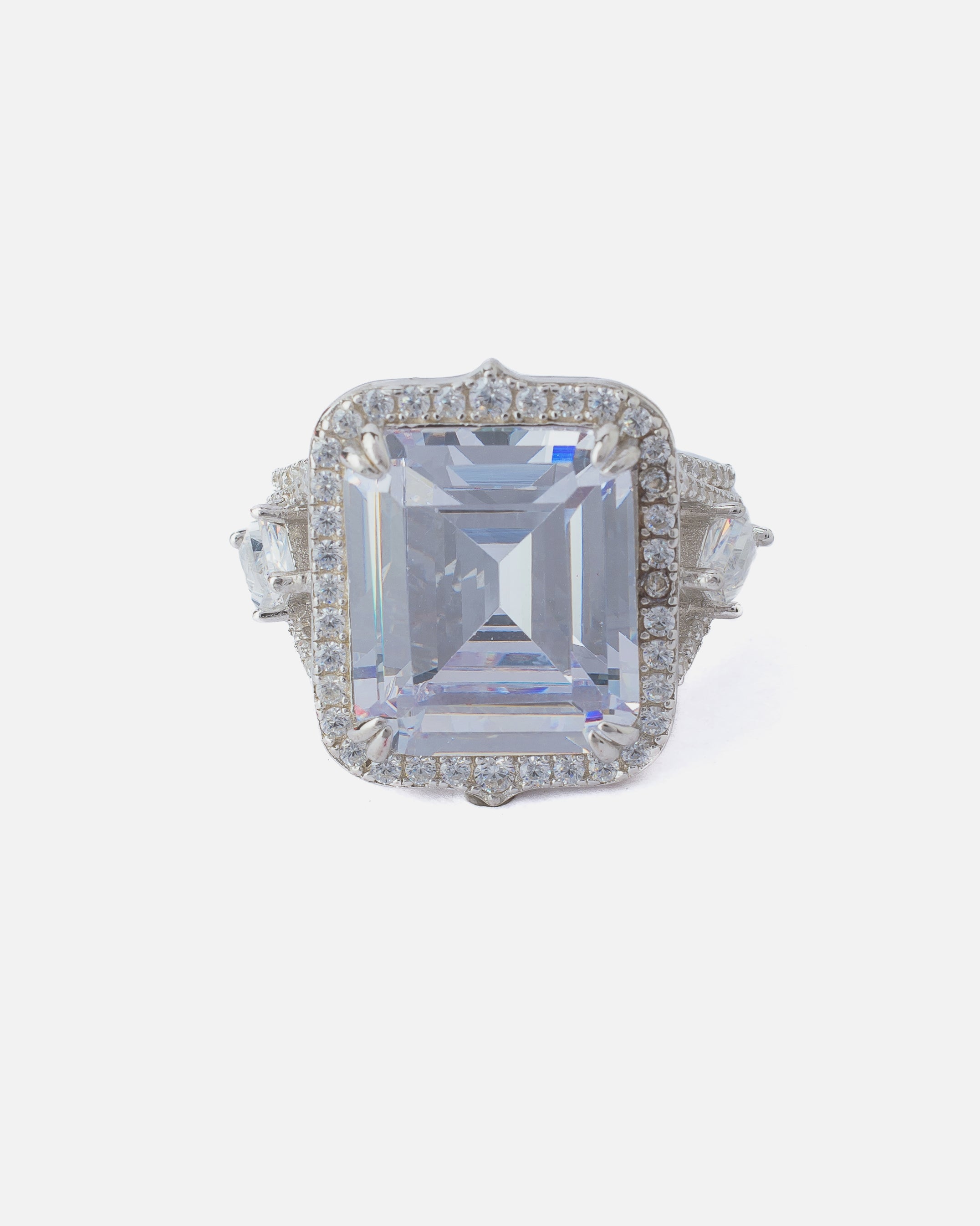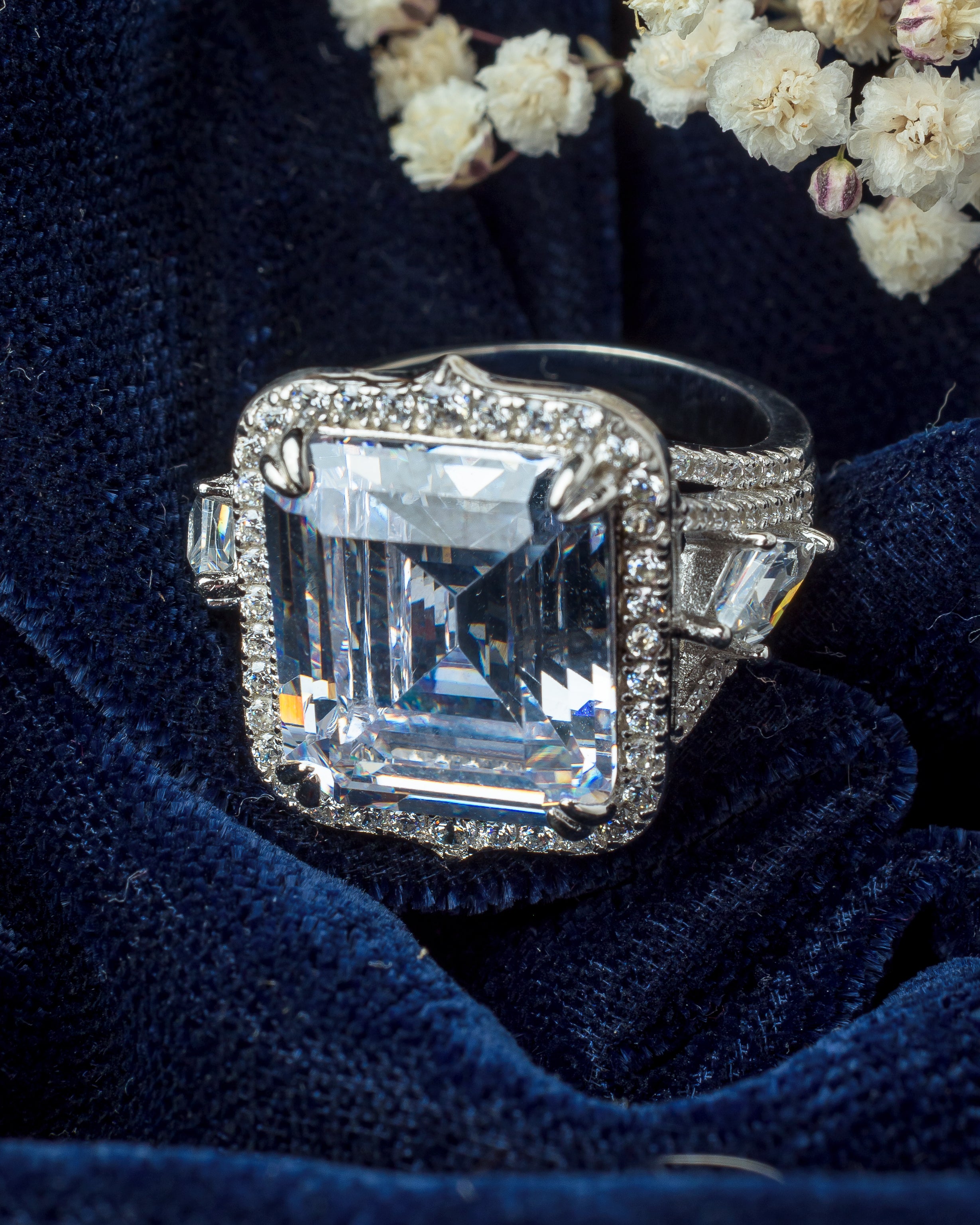 • Emerald-Cut Center Stone: Showcases a stunning, large emerald-cut diamond for a refined and elegant look.
