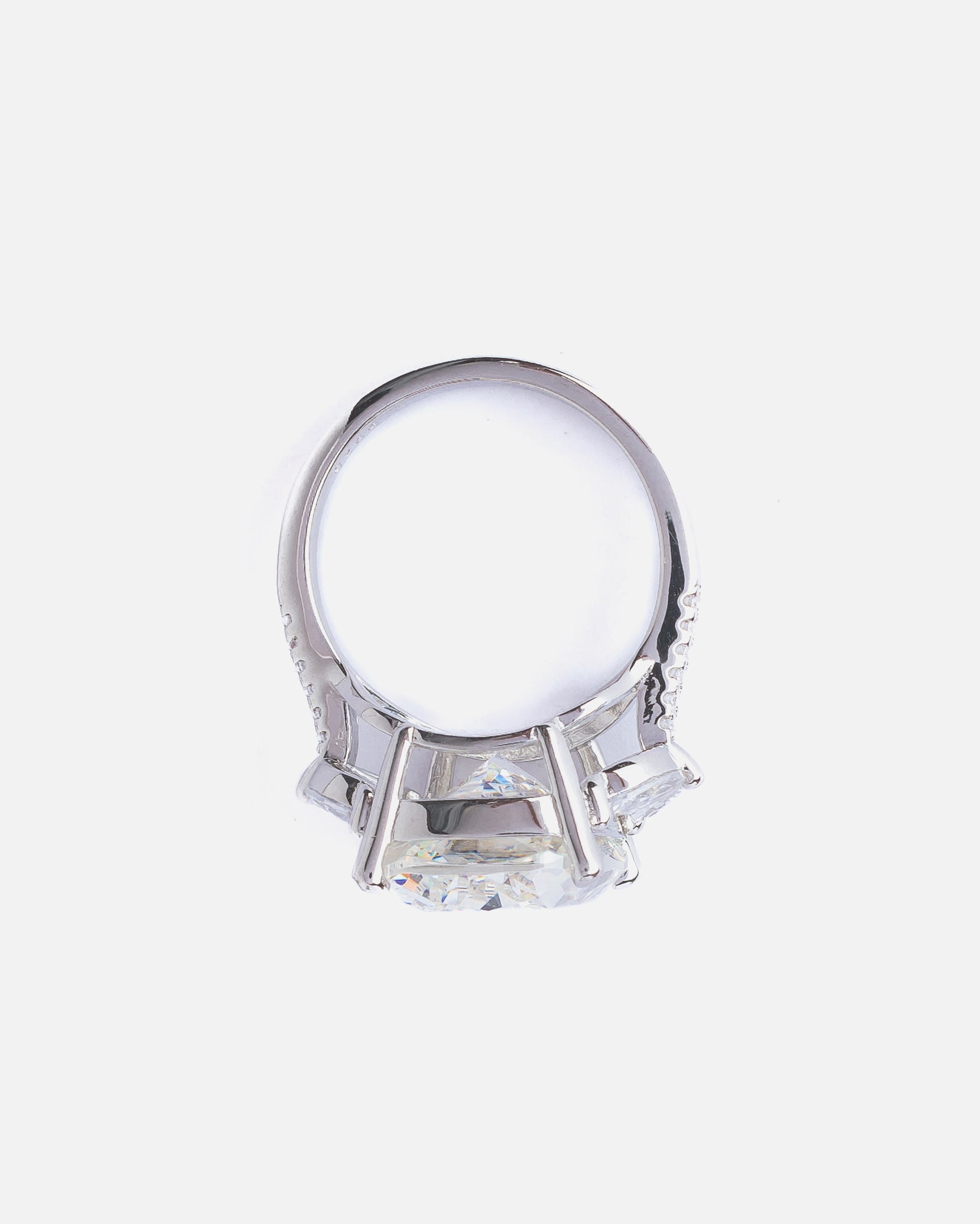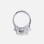 Elegantly bold, this silver ring showcases a brilliant oval-cut diamond simulant flanked by marquise side stones, making it a statement of luxury and timeless glamour.