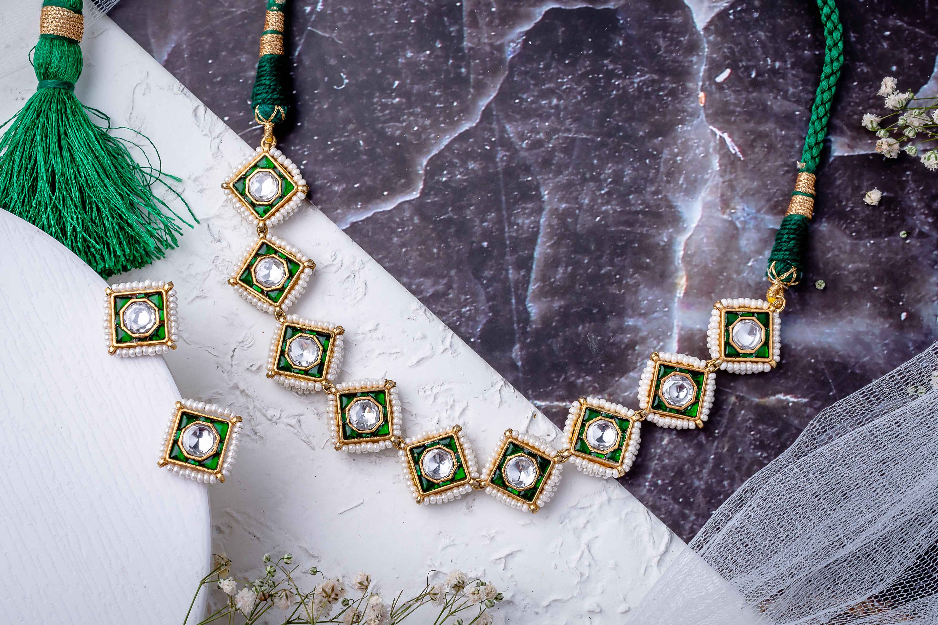 Elegant green-threaded necklaces with gold-plated geometric pendants and matching gemstone-studded earrings. Perfect for traditional or festive occasions, offering a classic yet modern aesthetic.
