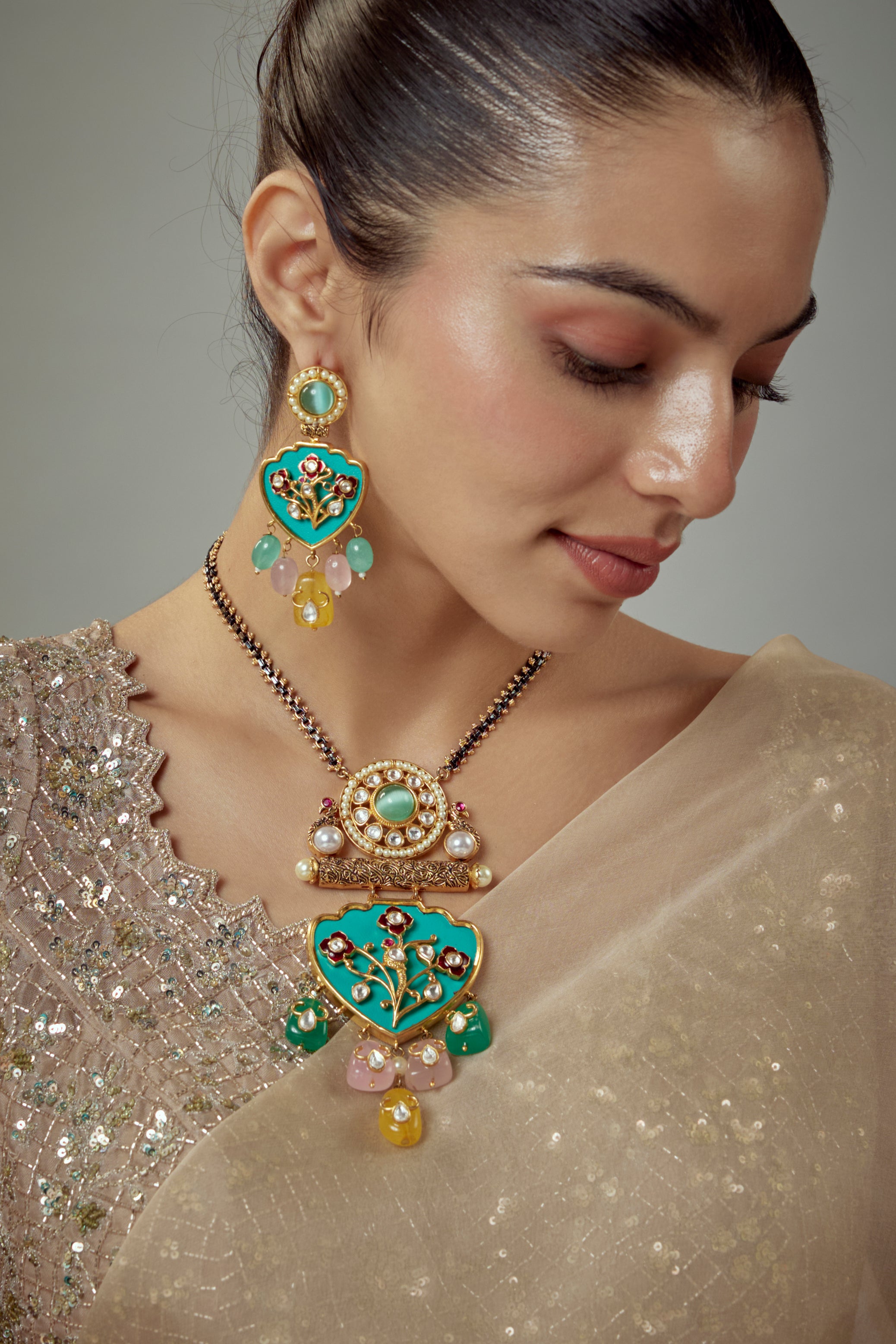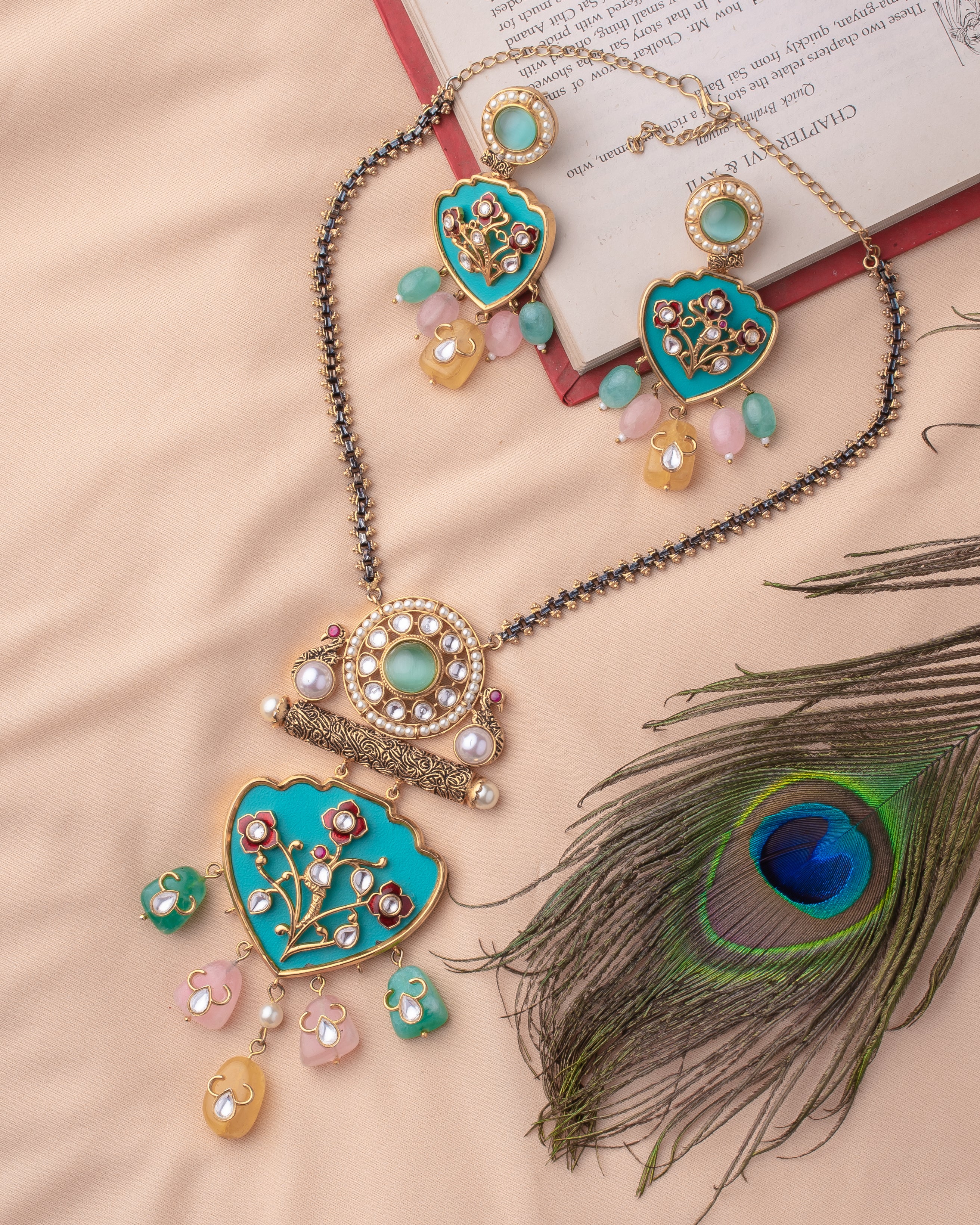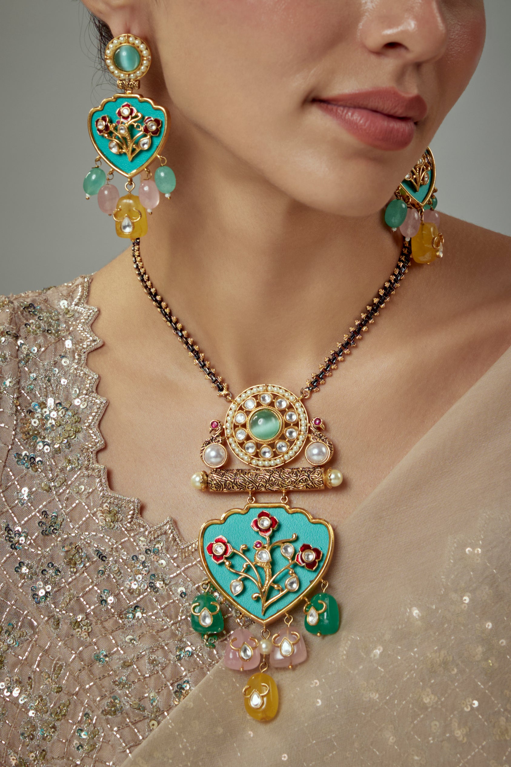 A stunning handcrafted jewelry set featuring intricate enamel work, vibrant gemstones & pearls. Perfect for special occasions, it combines traditional artistry with a modern touch for an elegant look.