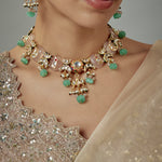 This exquisite necklace set features gold-plated floral motifs, mint-green beads, and pearl accents. Perfect for weddings or festive wear, it exudes elegance and complements any traditional attire.