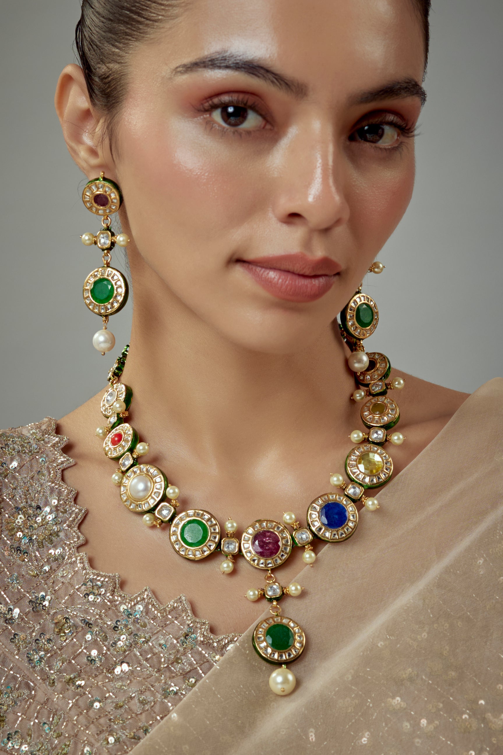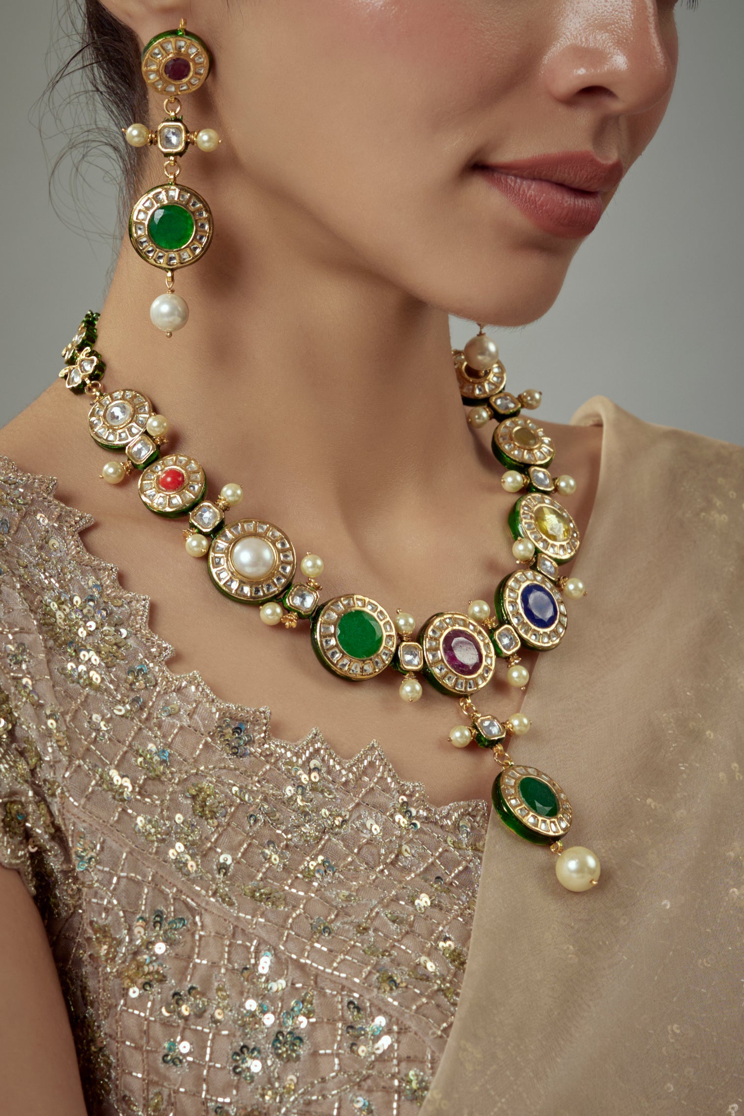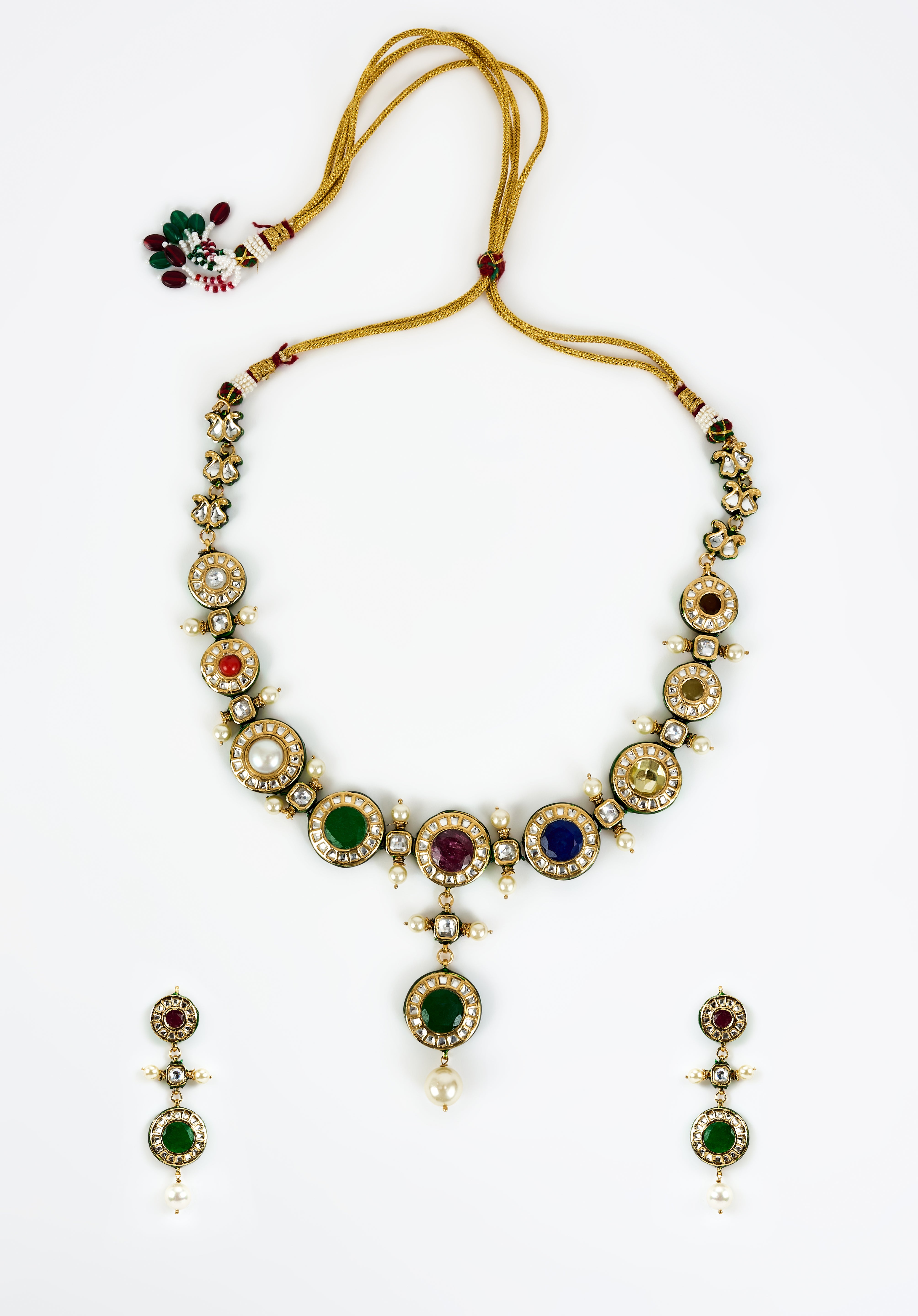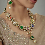 This stunning necklace set features vibrant multicolored stones, pearls, and intricate gold-plated detailing. Ideal for festive occasions, it combines traditional elegance with a contemporary touch.