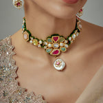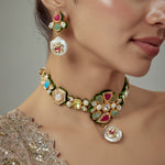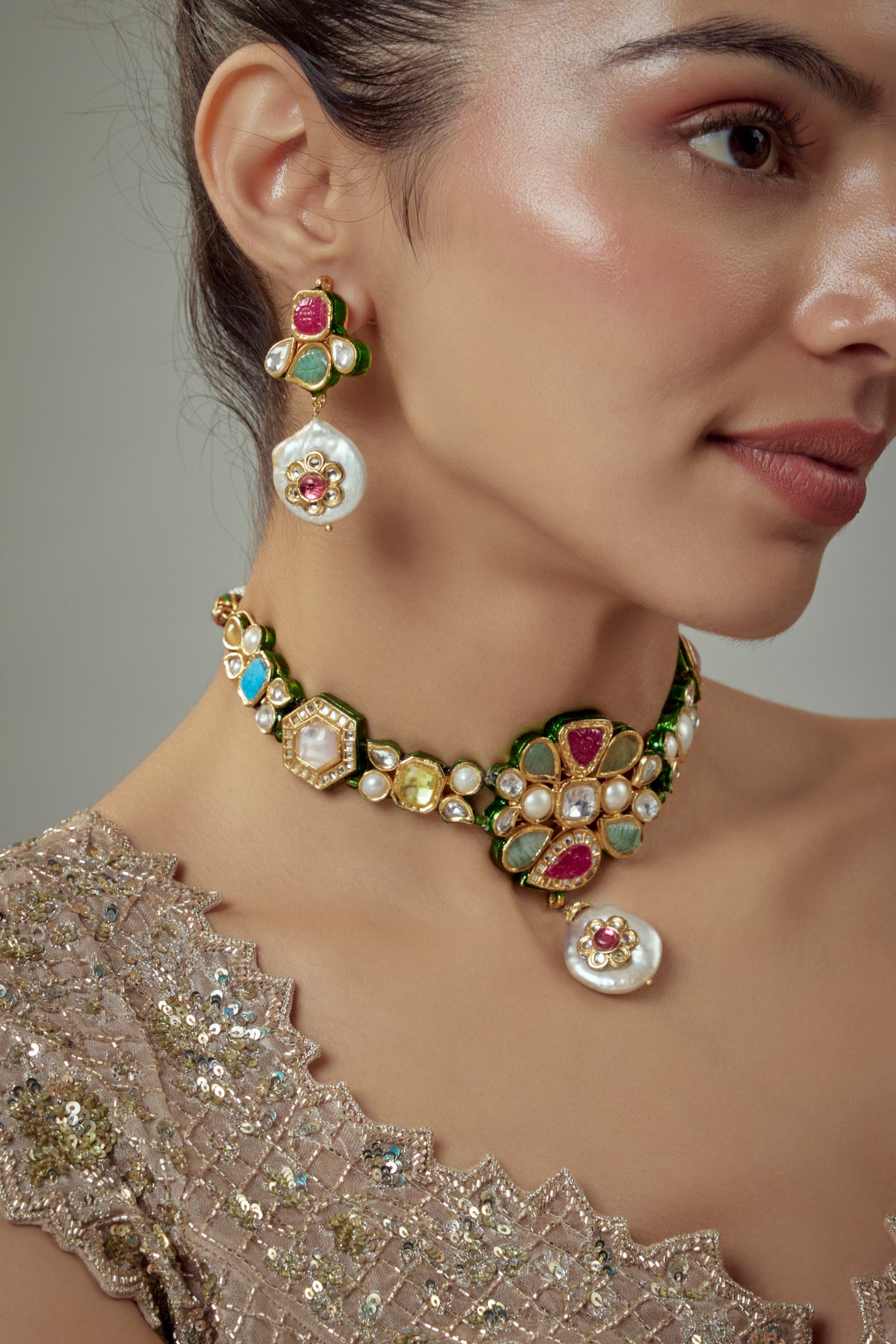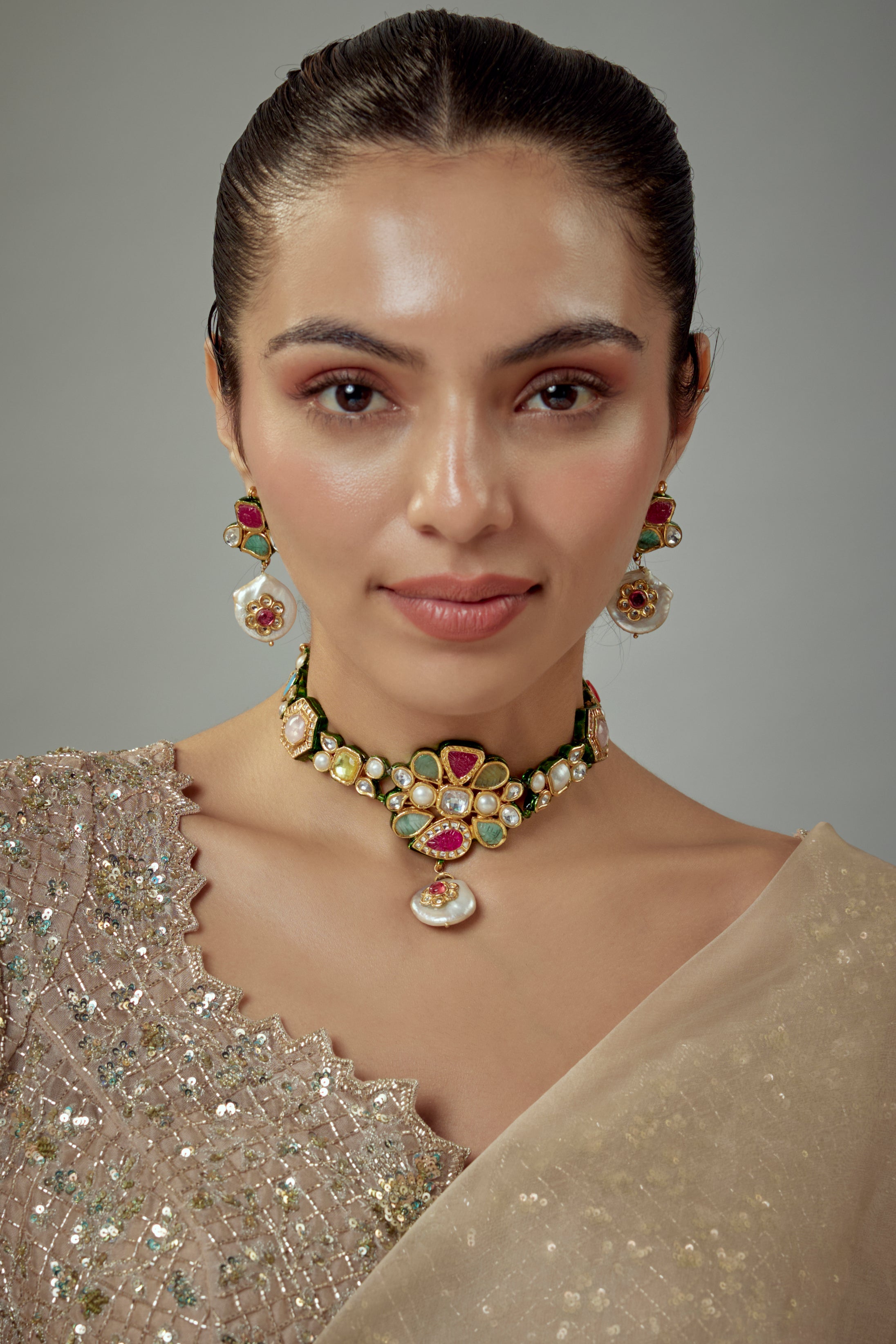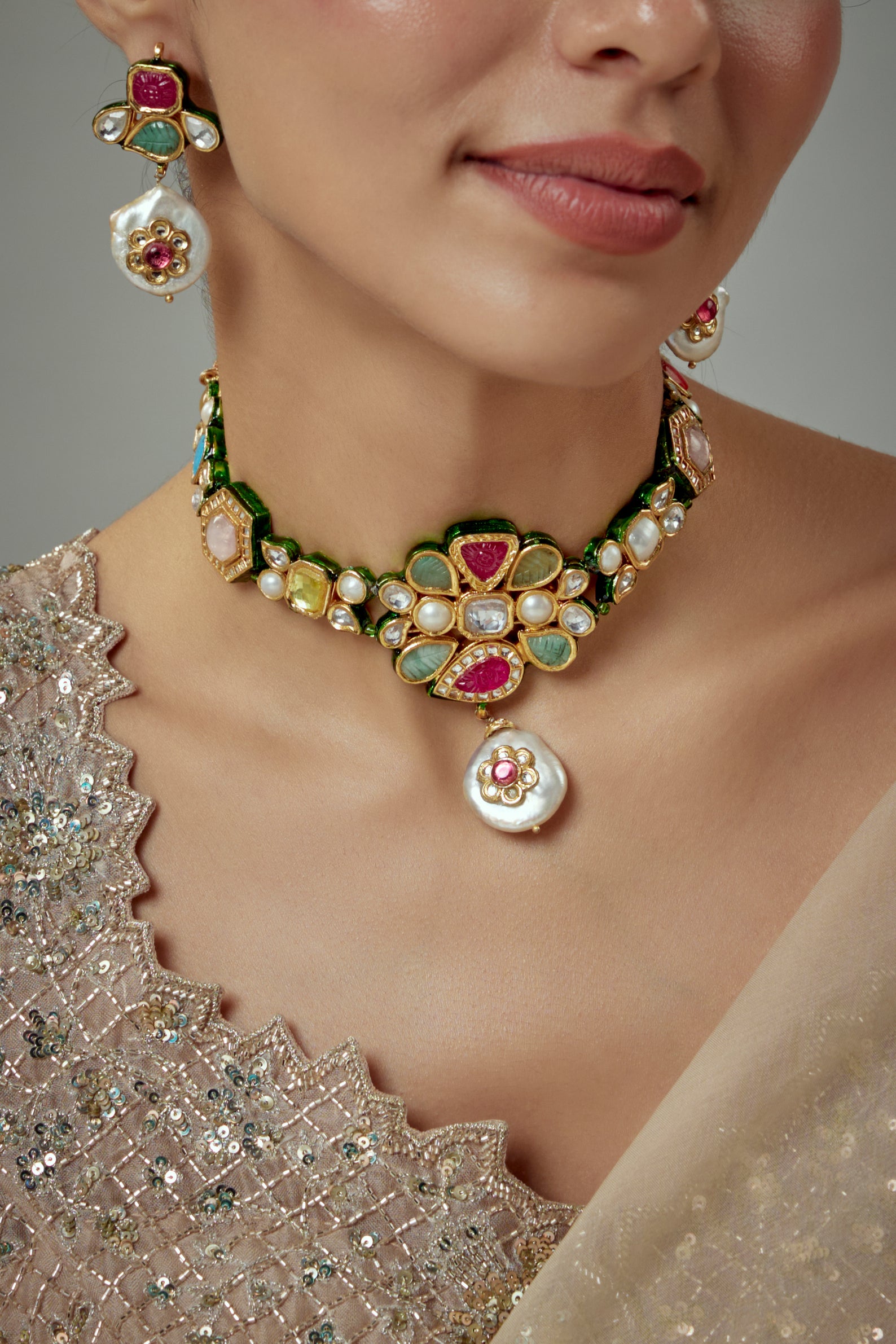 A luxurious choker set featuring floral motifs adorned with vibrant gemstones, pearls & dangling pendant. Paired with matching earrings, this handcrafted design adds timeless elegance to any occasion.