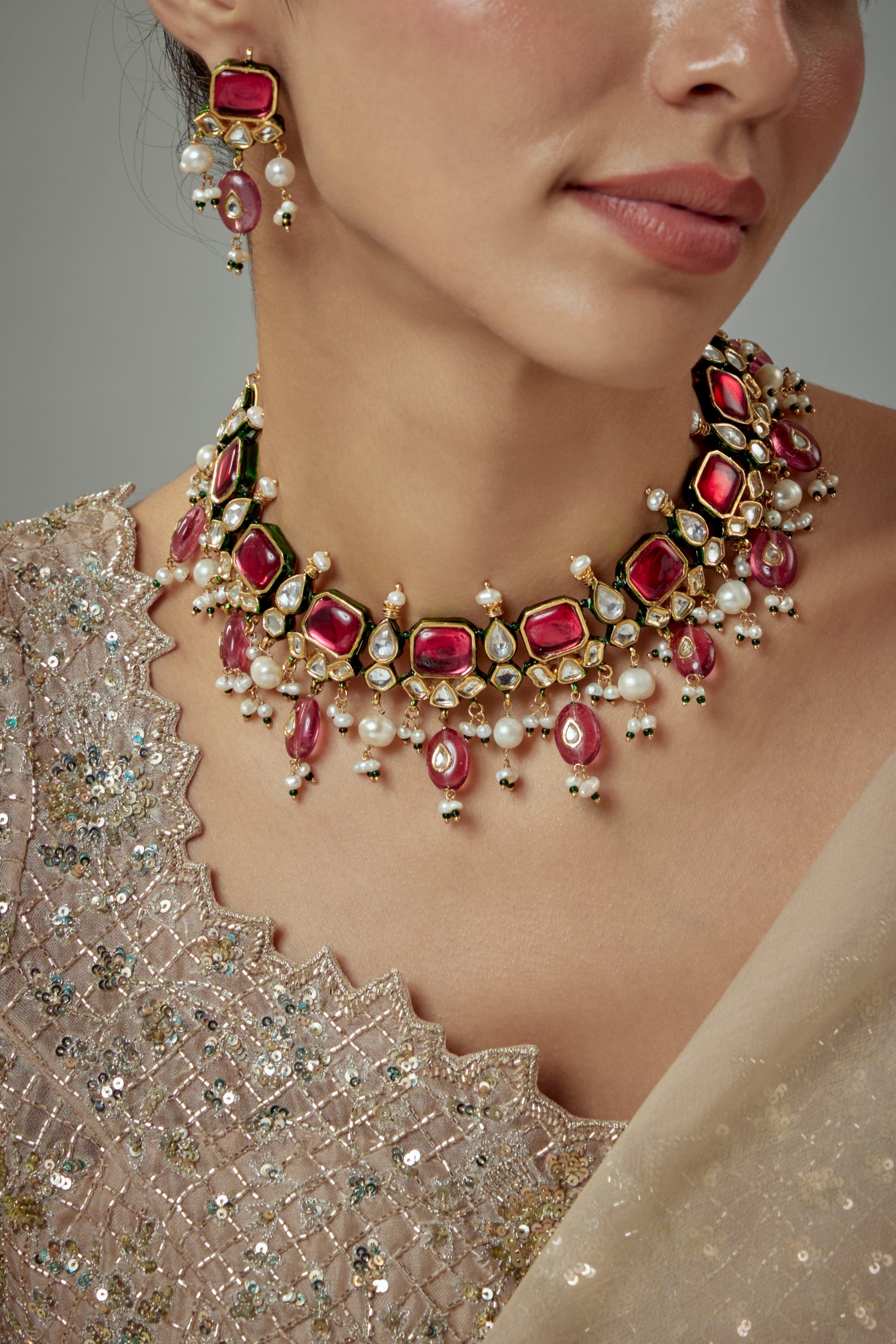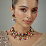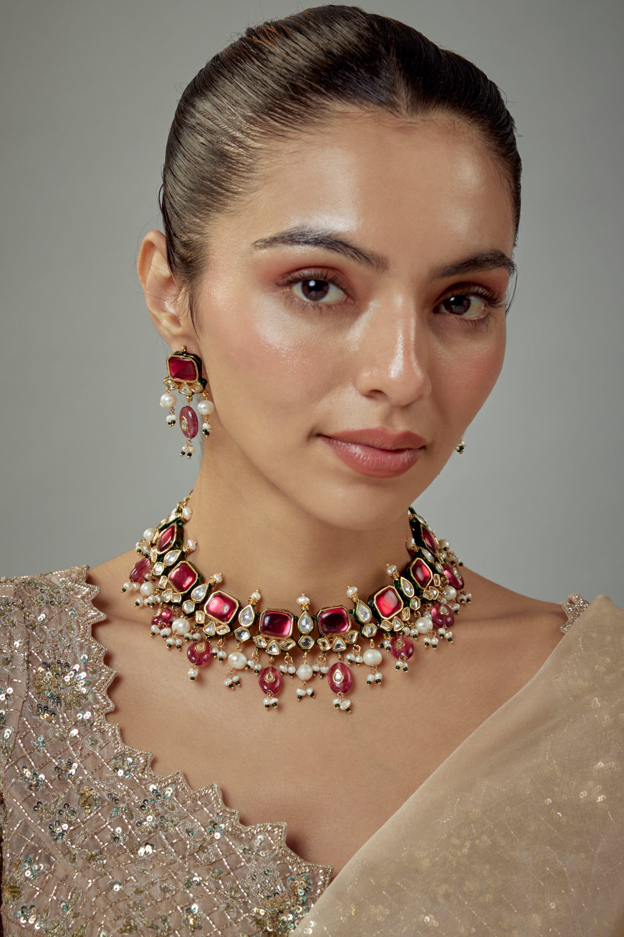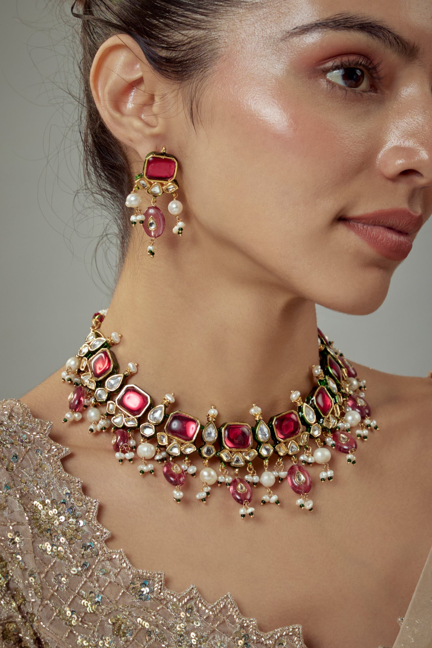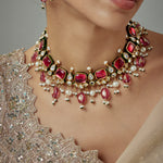 An exquisite choker set featuring bold ruby-like stones, intricate kundan work & pearl embellishments. A perfect blend of traditional charm & modern elegance, ideal for weddings & festive occasions.