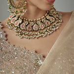Luxurious statement jewelry set featuring intricately crafted earrings & a choker with vibrant teardrop motifs, pearls & gold accents. Perfect for wedding or festive occasions to elevate any ensemble.