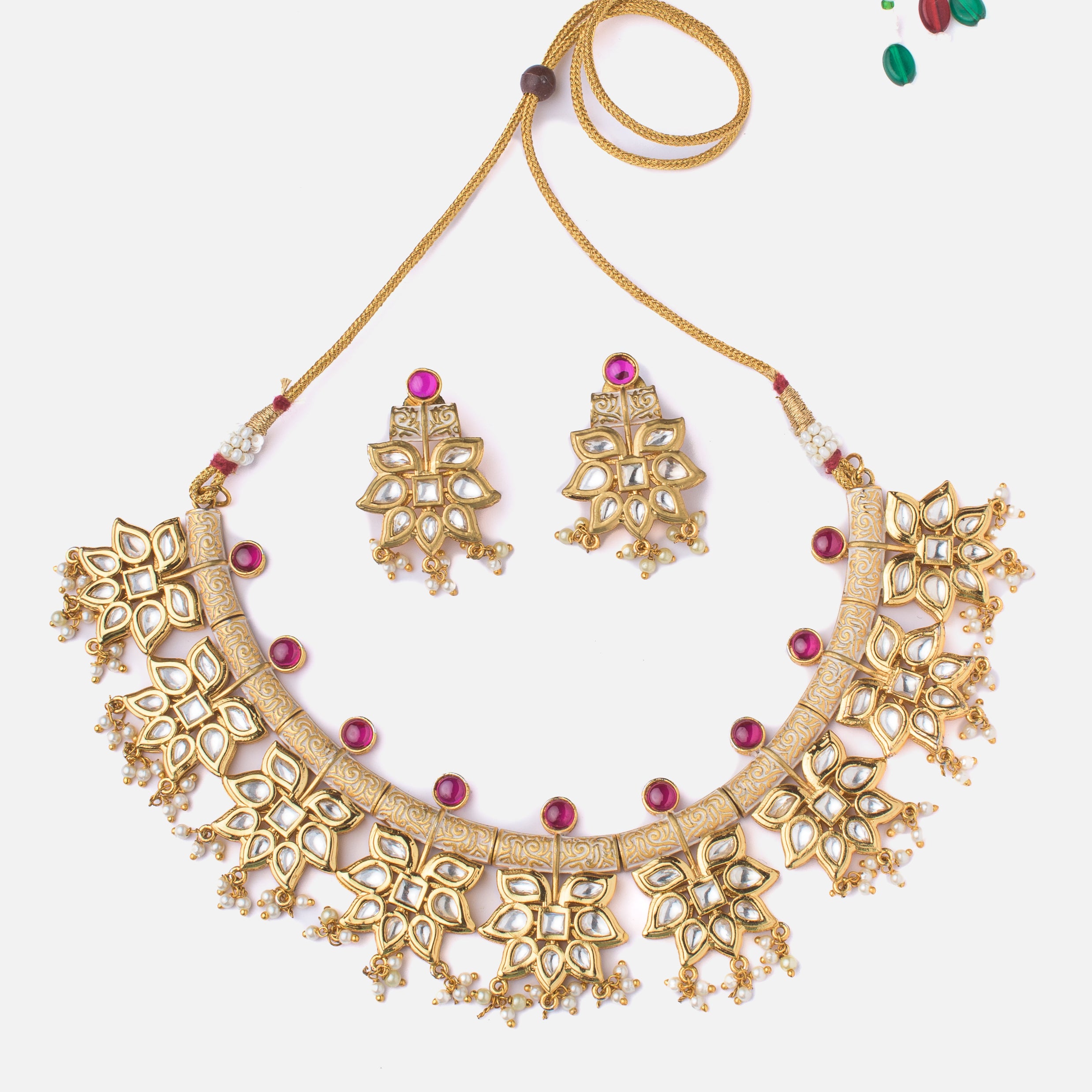 Saadgi Gold Plated White Womens Short Necklace Set with Pair of Earrings