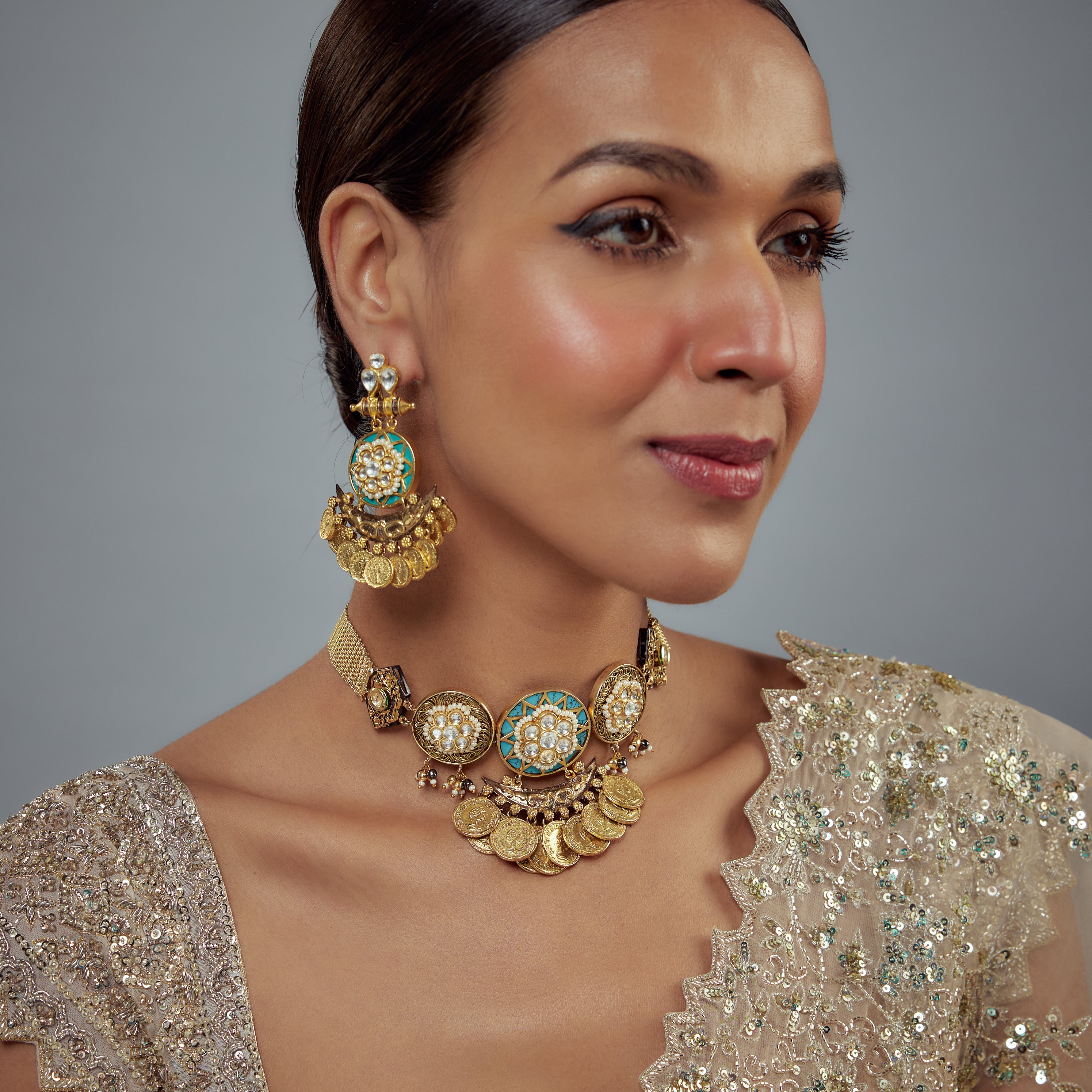 Saadgi Gold Plated Womens Temple Choker Necklace Set with Pair of Earrings