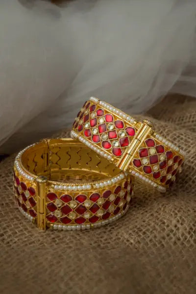 Opulent gold bangles adorned with vibrant red gemstones and intricate detailing. A perfect fusion of tradition and elegance, ideal for weddings, festive occasions, or statement styling.