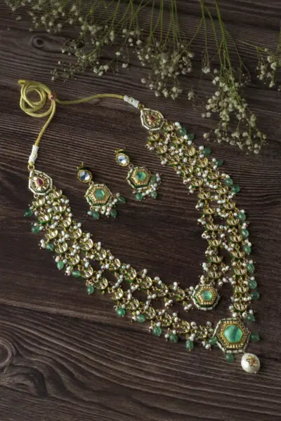 Elegant green Kundan necklace set with pearl drops and intricate detailing, paired with matching earrings. Perfect for weddings, festivals, or traditional occasions. Adjustable thread closure included.