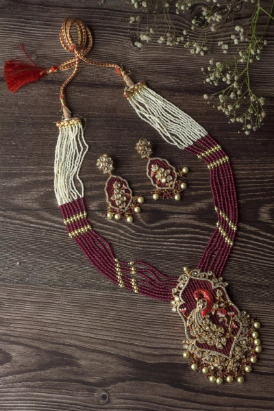 Elegant handcrafted necklace set with maroon and white bead strands, featuring a detailed peacock pendant with pearl drops. Paired with matching earrings, perfect for weddings and traditional occasions.