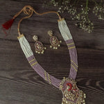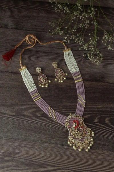 Traditional handcrafted necklace and earring set with intricate peacock motif, pearl drops, and layered seed beads. A perfect ethnic accessory for weddings, festive occasions.