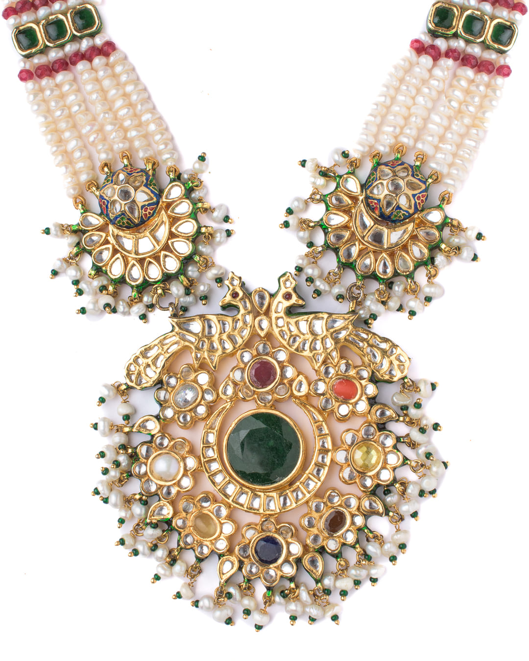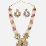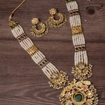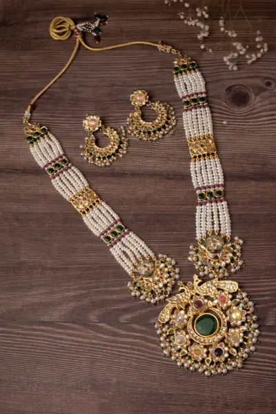 Elevate your ethnic look with this regal necklace set featuring layered pearl strands, intricate gold-toned detailing, and matching earrings. Perfect for weddings, festive occasions, and grand events.