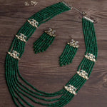 Elegant multi-layer green beaded necklace set with matching long earrings, adorned with crystal-studded separators. Perfect for festive occasions, traditional outfits, or statement ethnic fashion looks.