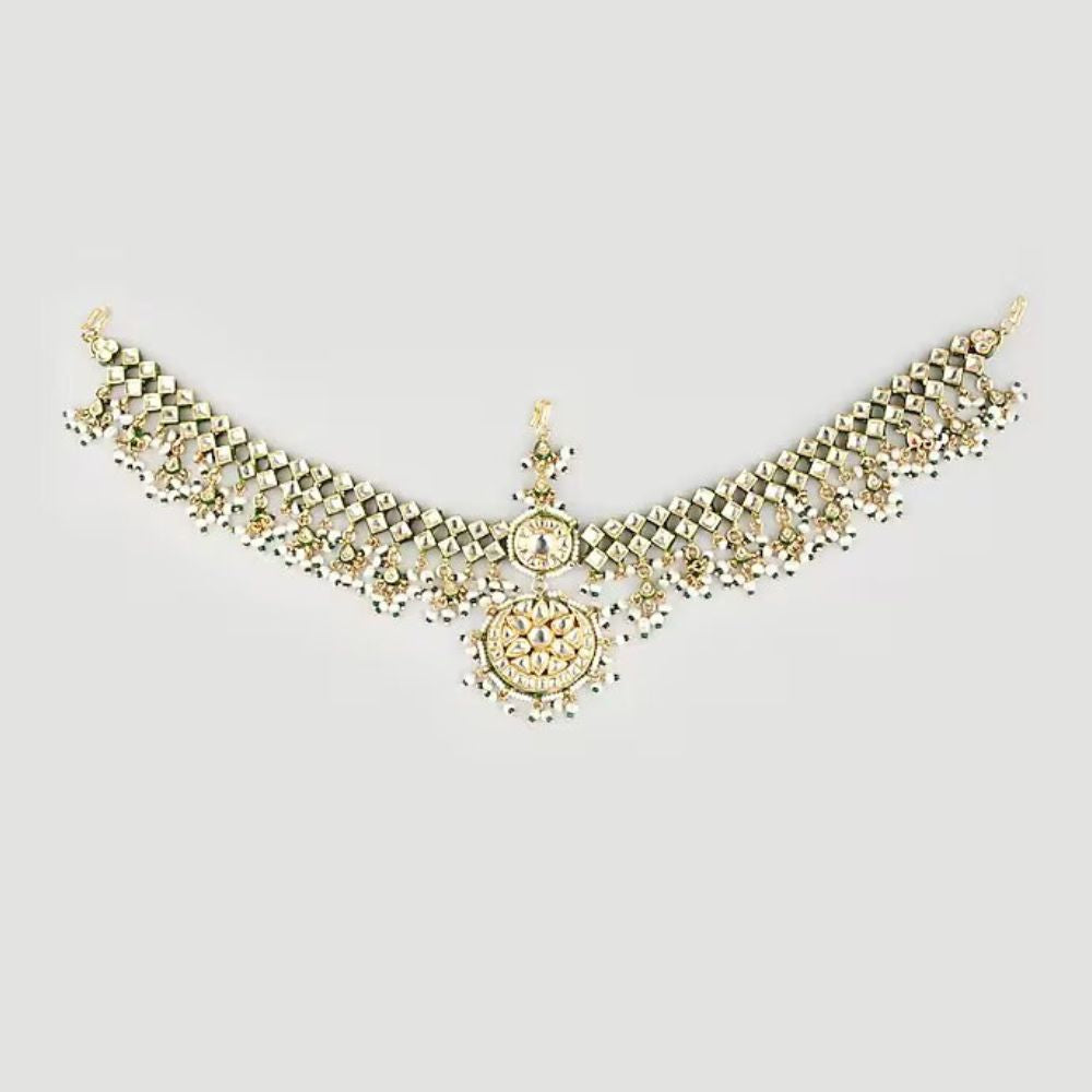 Elevate your bridal look with this exquisite pearl-studded Maathapatti. Featuring intricate floral motifs and gleaming embellishments, it adds elegance and charm, perfect for weddings and festive occasions.