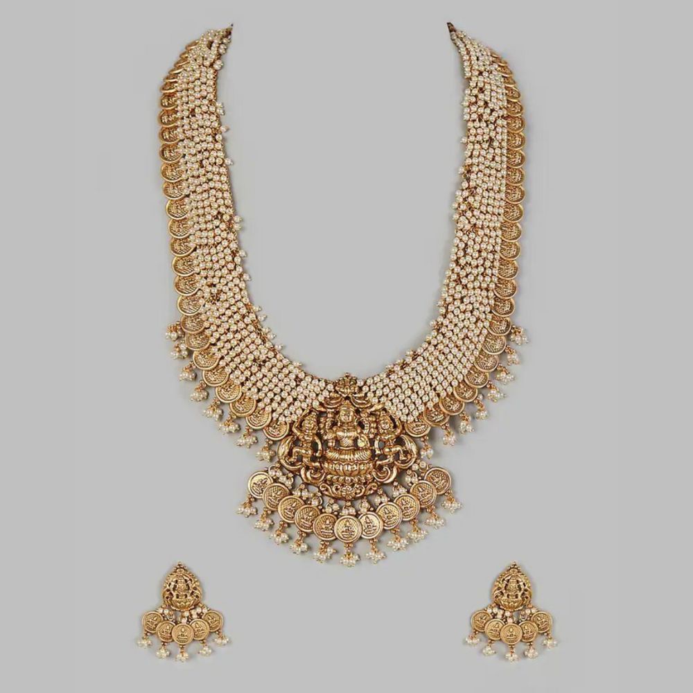 - Elegant Bridal Necklace Set – Features intricate gold-tone detailing with pearl embellishments for a royal look.