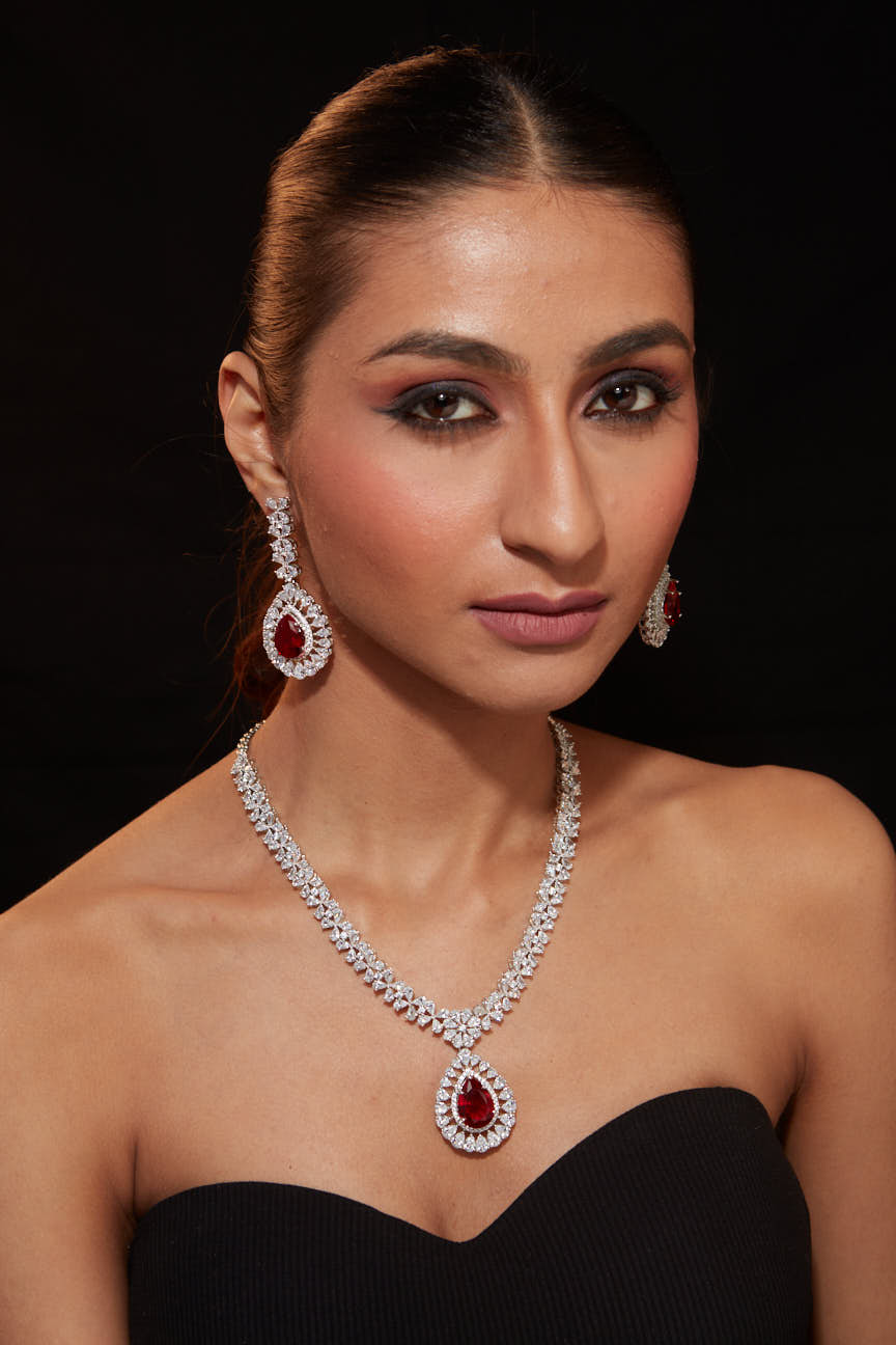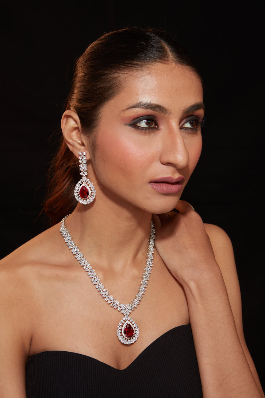 Rhodium Plated Zircon Studded With Red Synthetic Stone Pendant Necklace & Drop Earrings Set