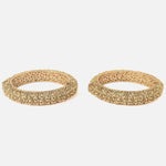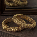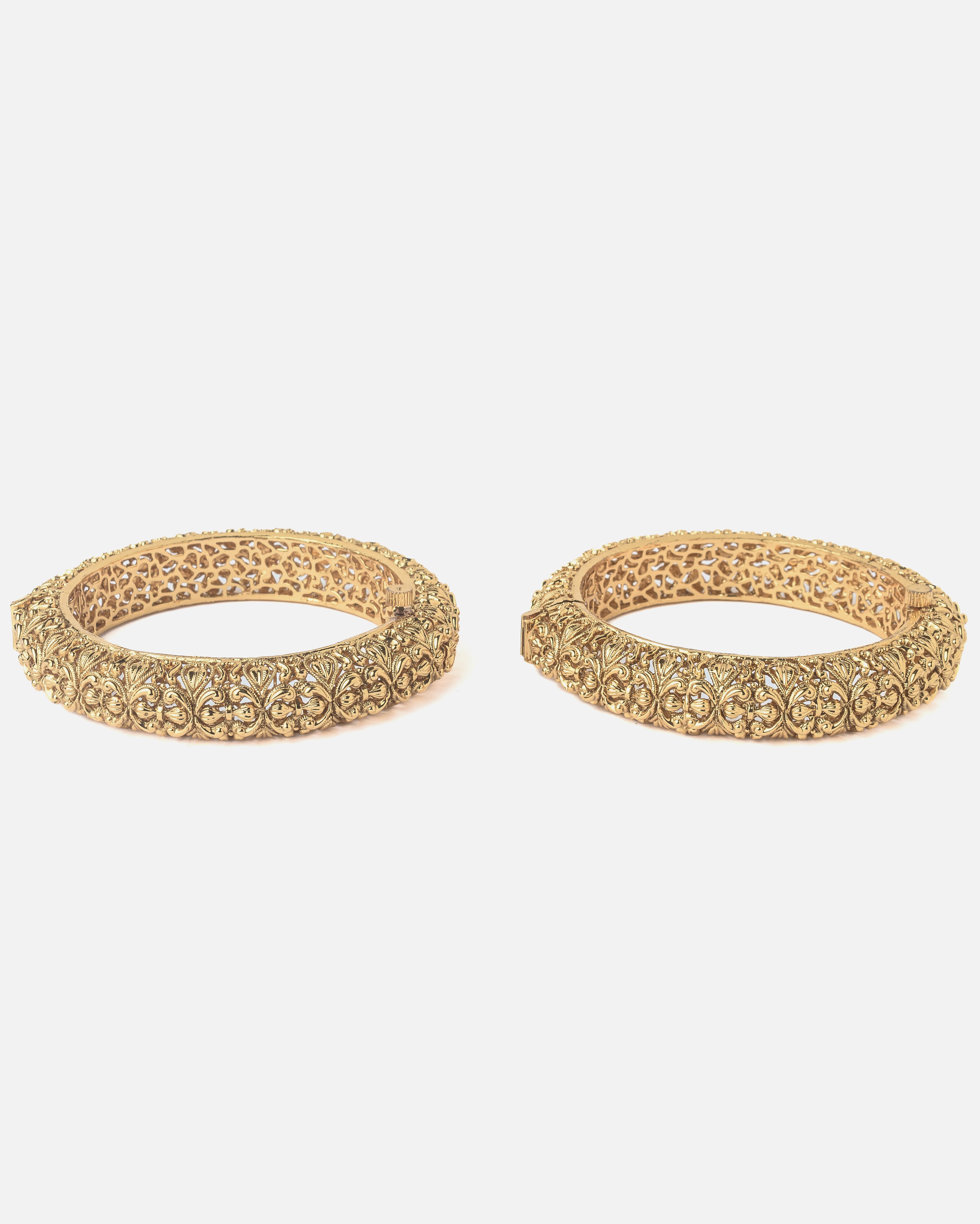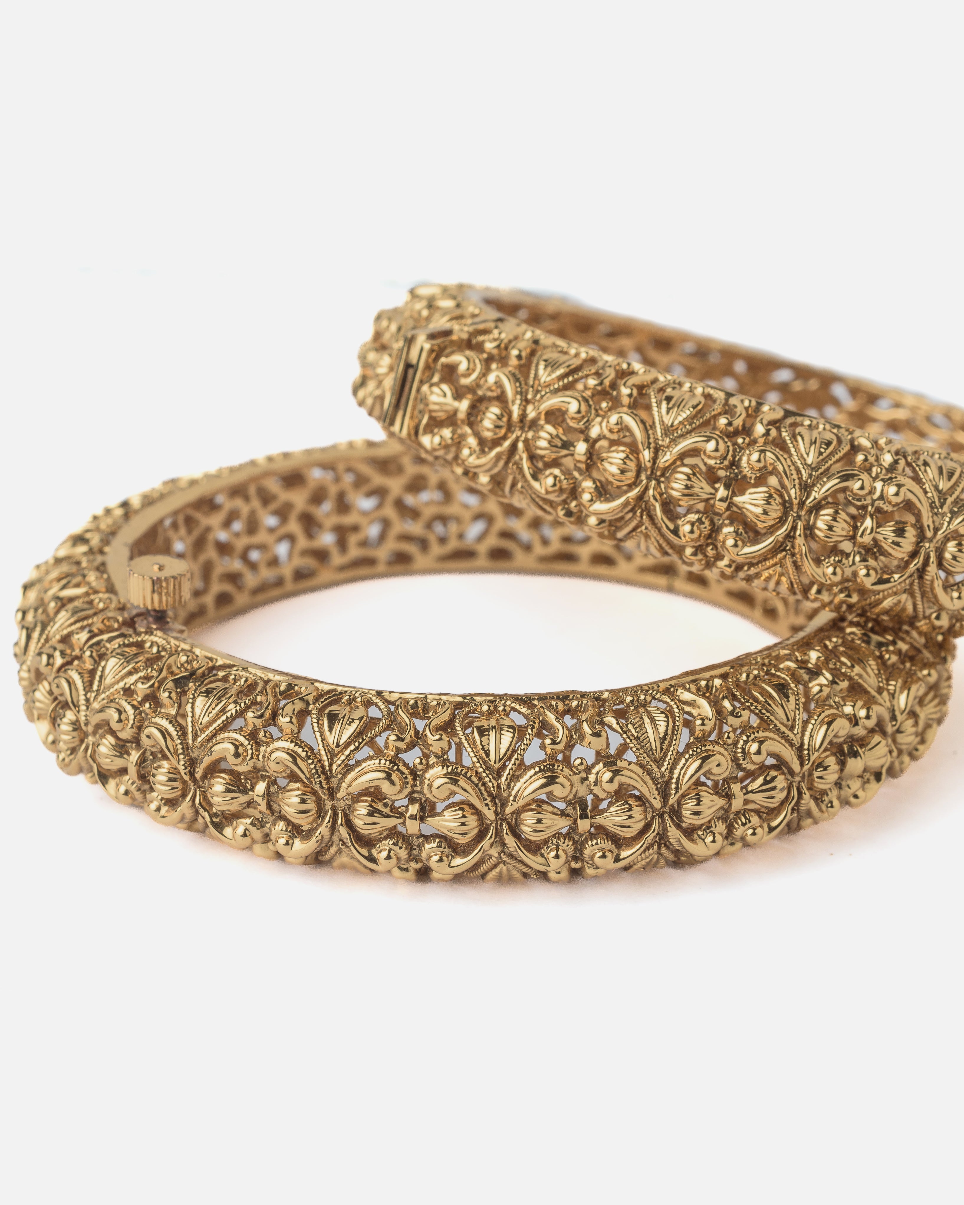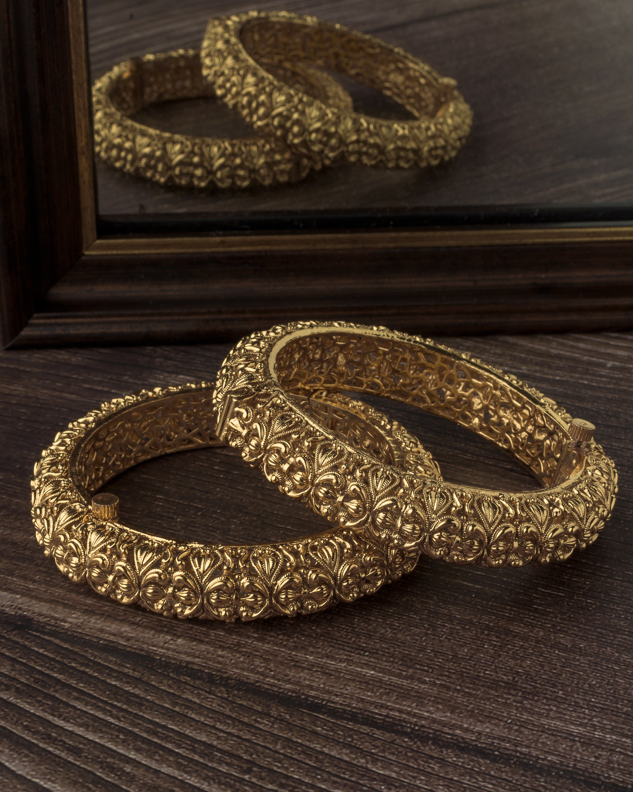 Elegant gold-tone bangles with intricate floral engraving and antique finish. Perfect for traditional wear, these sturdy and ornate bangles add a royal charm to festive and wedding outfits.
