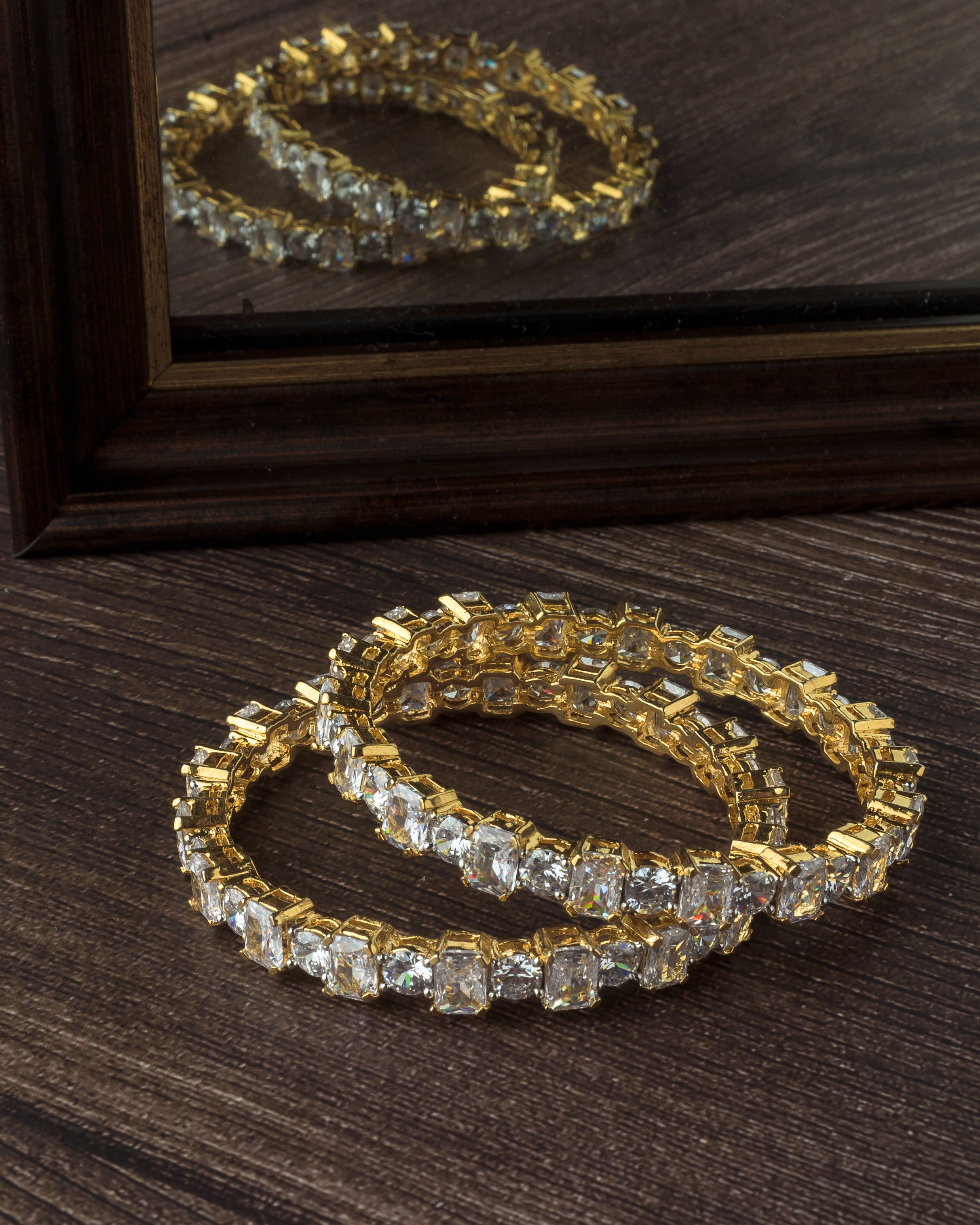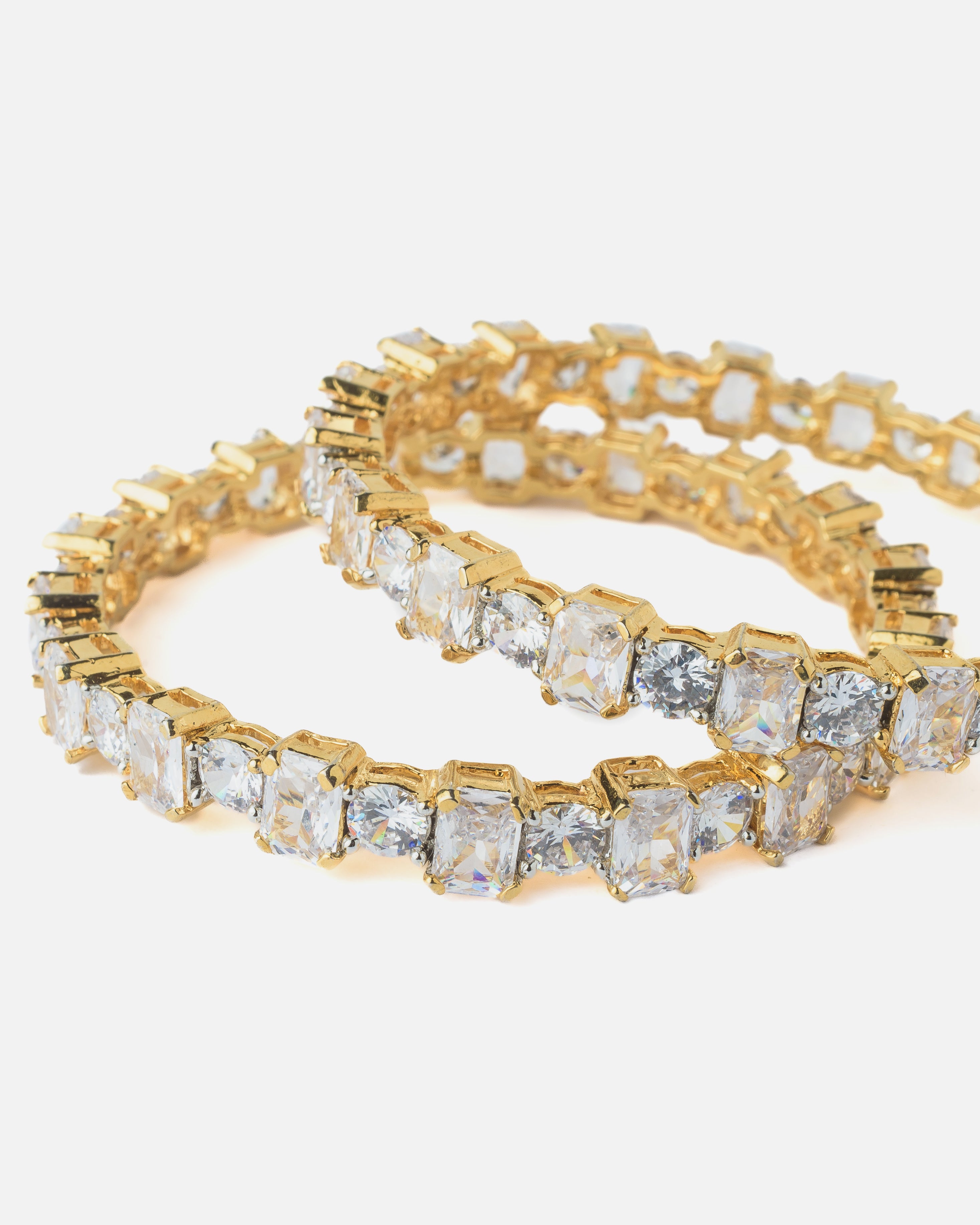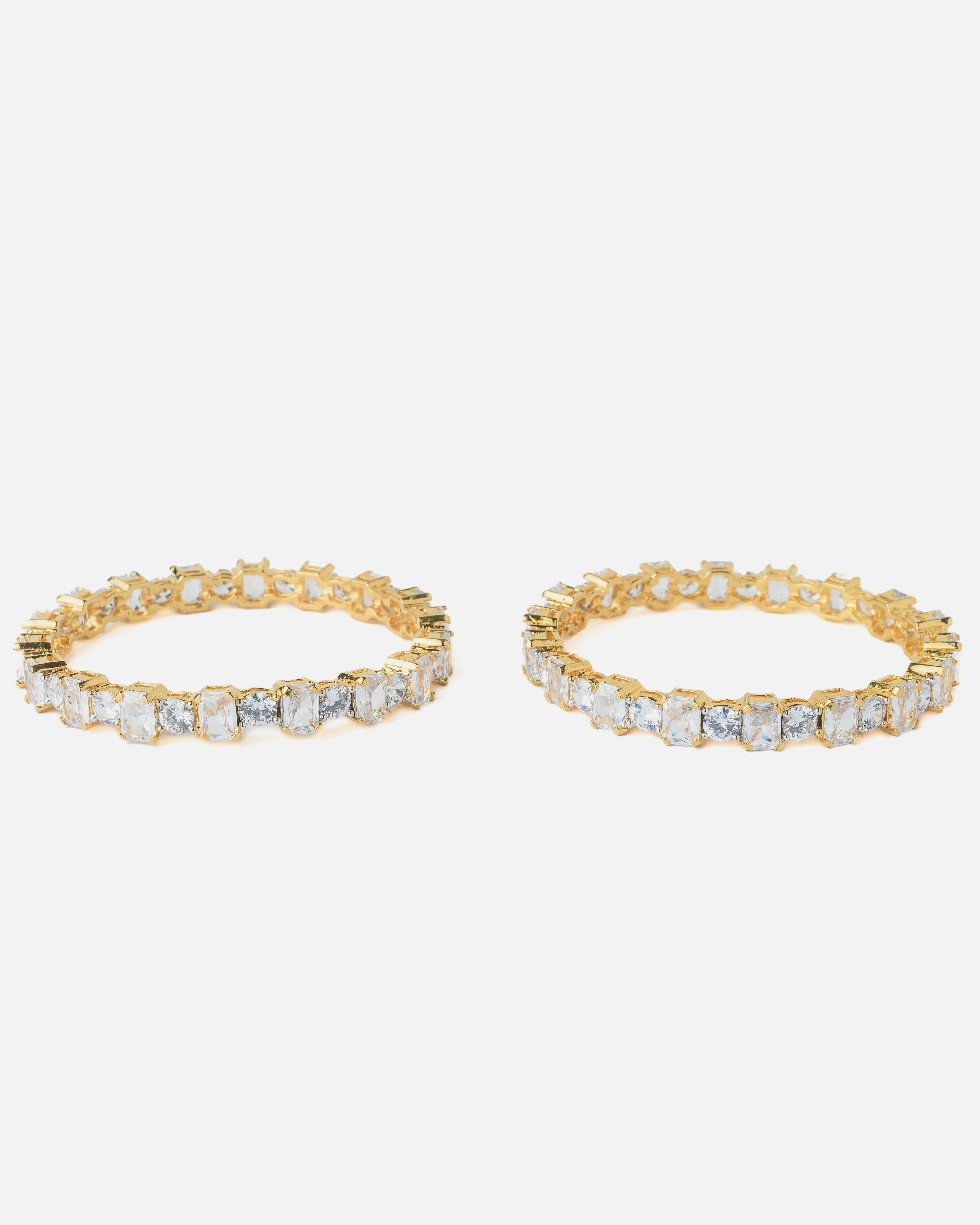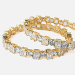 Elegant gold-plated bangles adorned with sparkling clear stones in a prong setting. Perfect for party and festive wear, these bangles add a glamorous touch to any outfit with their radiant shine.