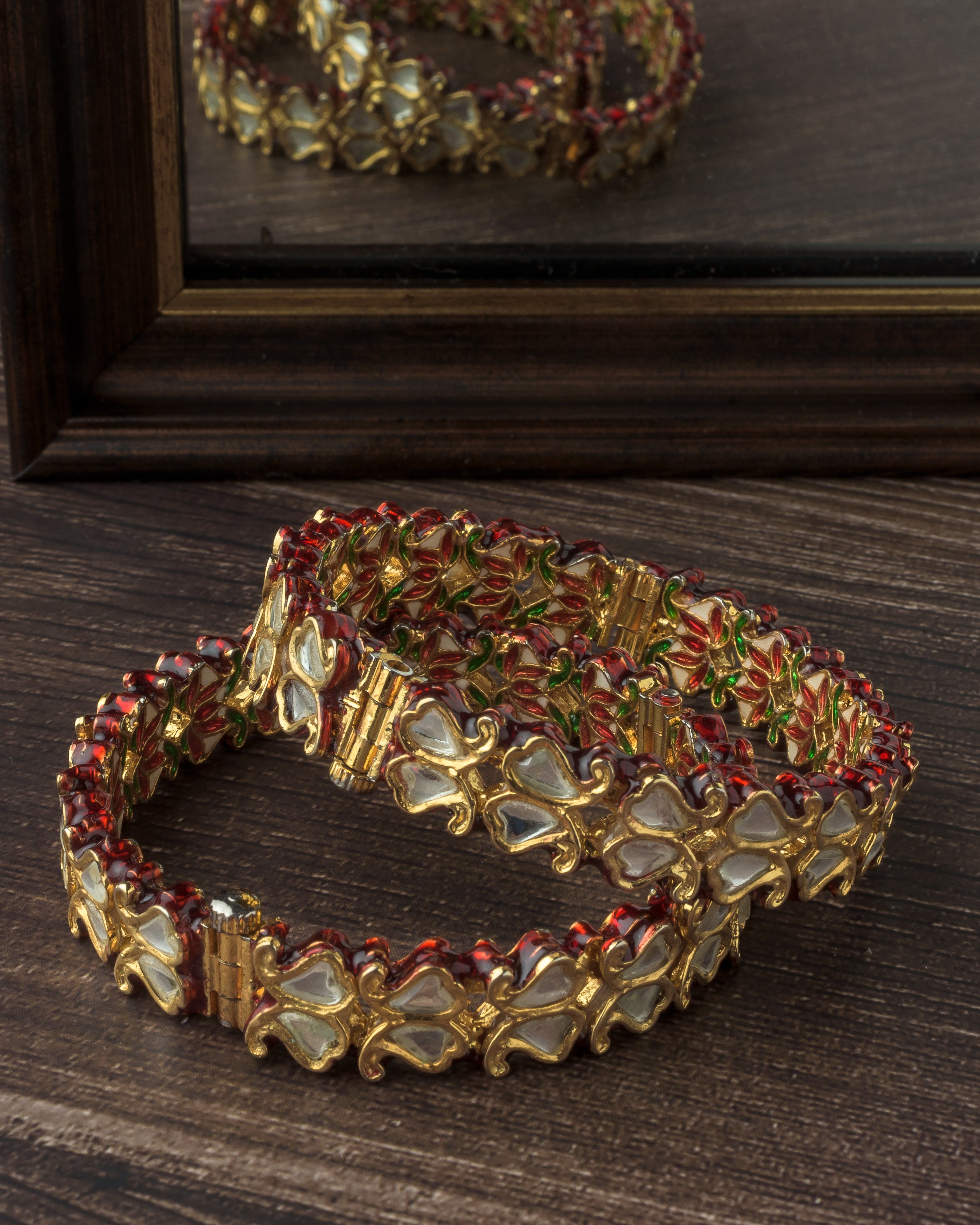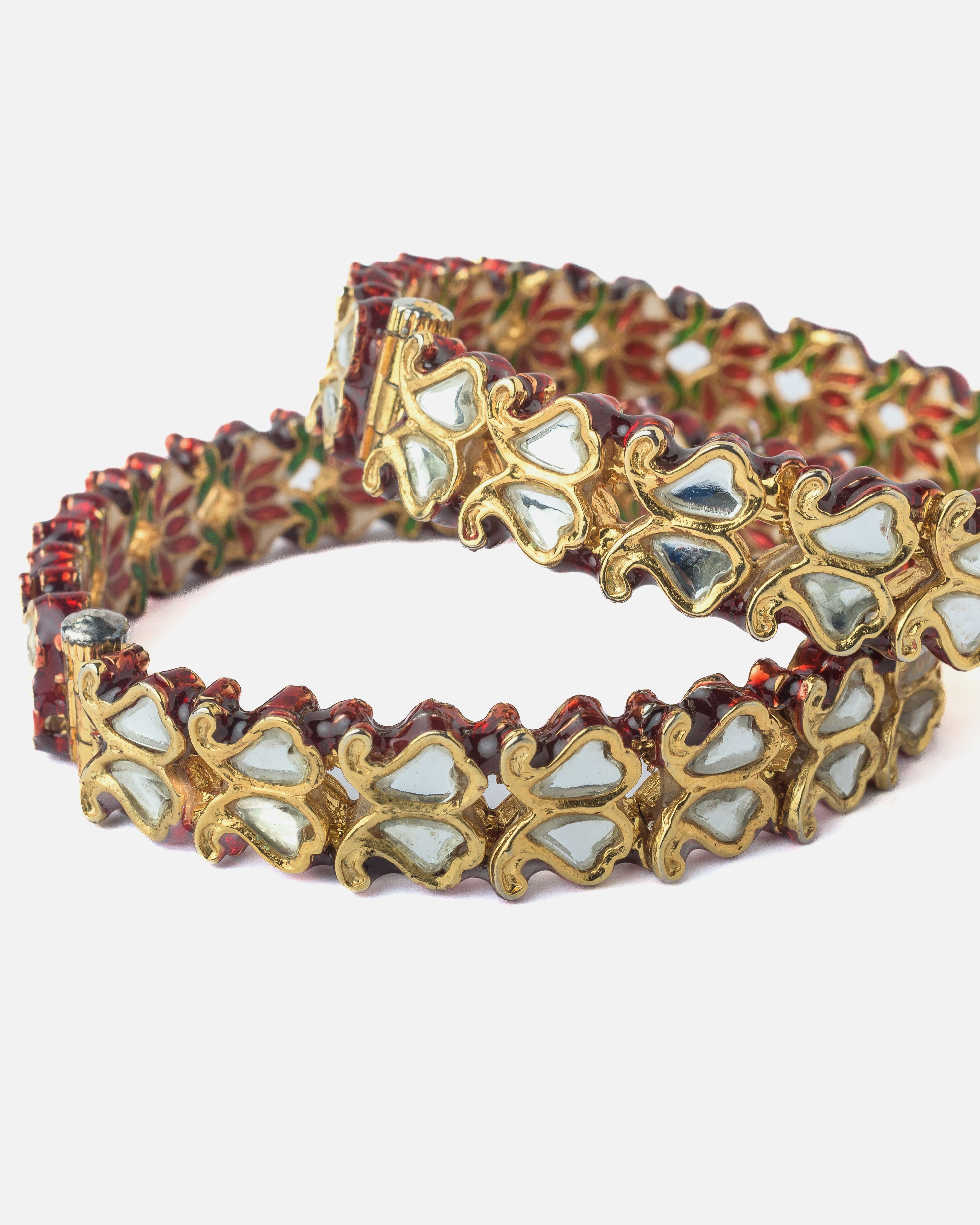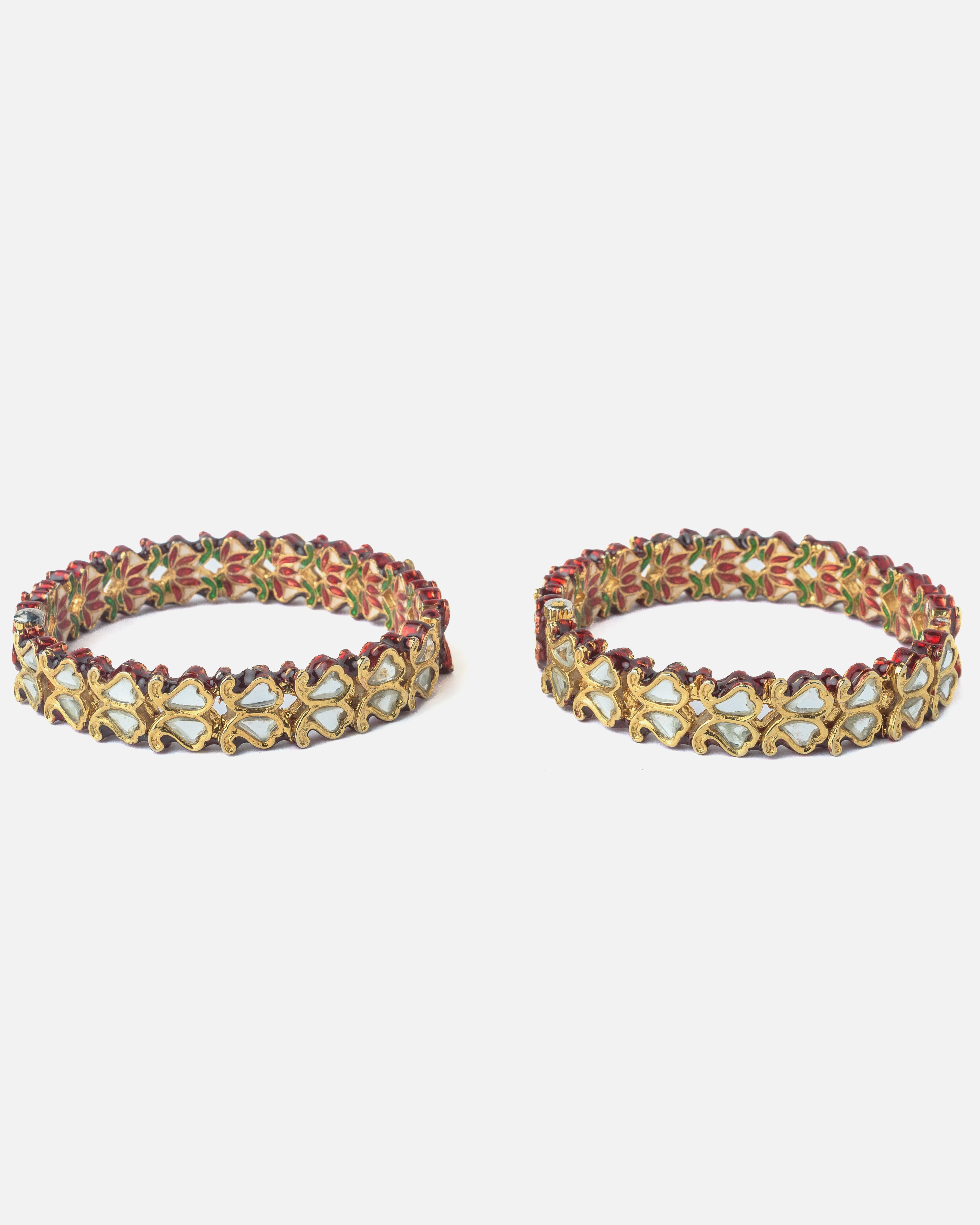 Elegant gold-plated bangles adorned with red and green enamel and white stone inlays. Intricate floral motifs and mirror detailing add a touch of traditional charm, perfect for festive occasions.