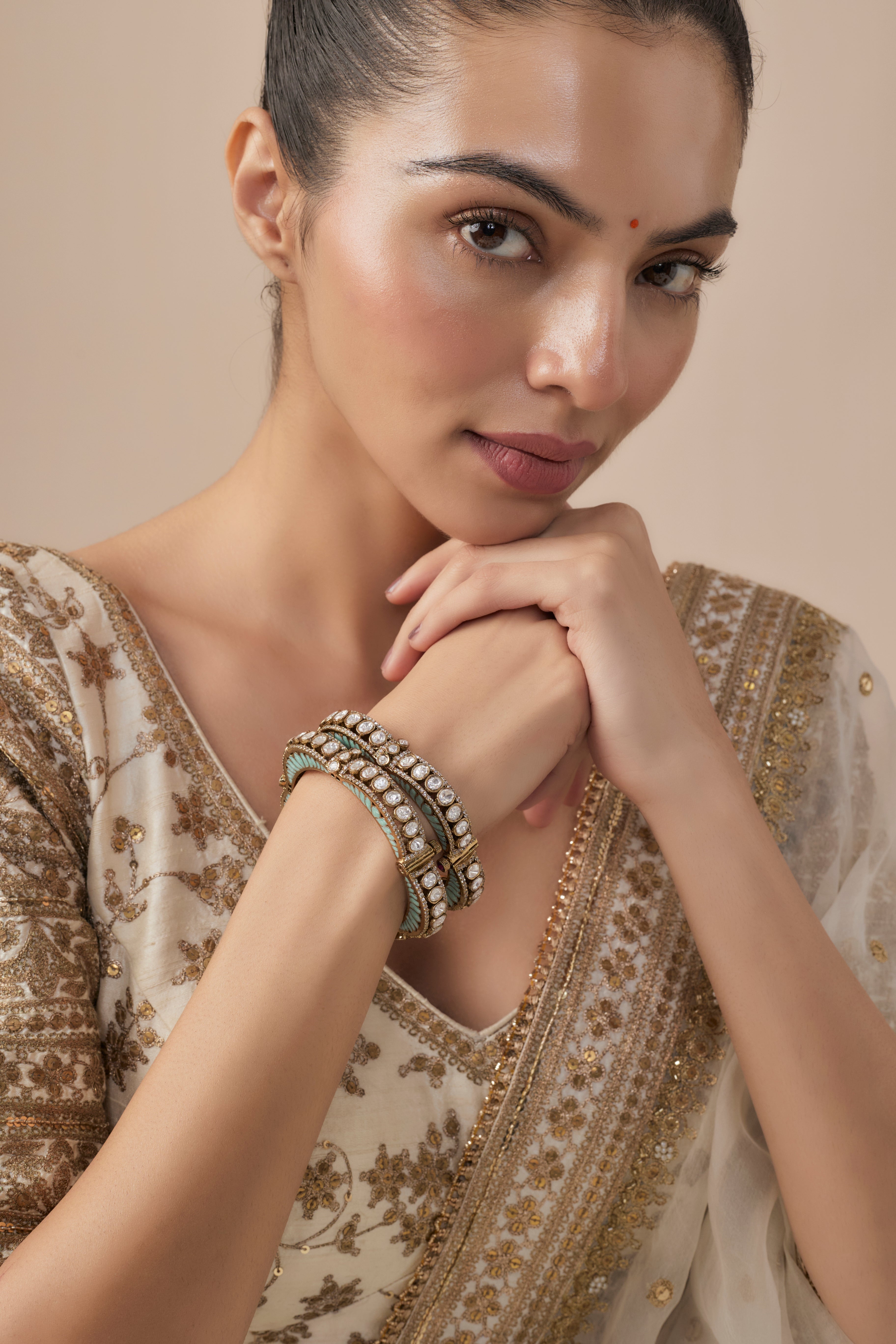 Elegant handcrafted bangles with turquoise enamel detailing & sparkling stone accents, set in a gold-tone finish. Perfect for weddings and festive occasions. Pairs beautifully with traditional attire.