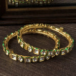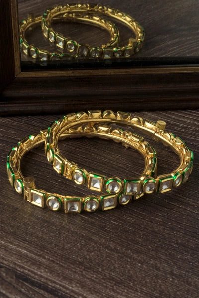 Elegant gold-tone bangles adorned with square-cut kundan stones and green enamel detailing. A perfect blend of sophistication and tradition, ideal for festive occasions, weddings, or ethnic attire.