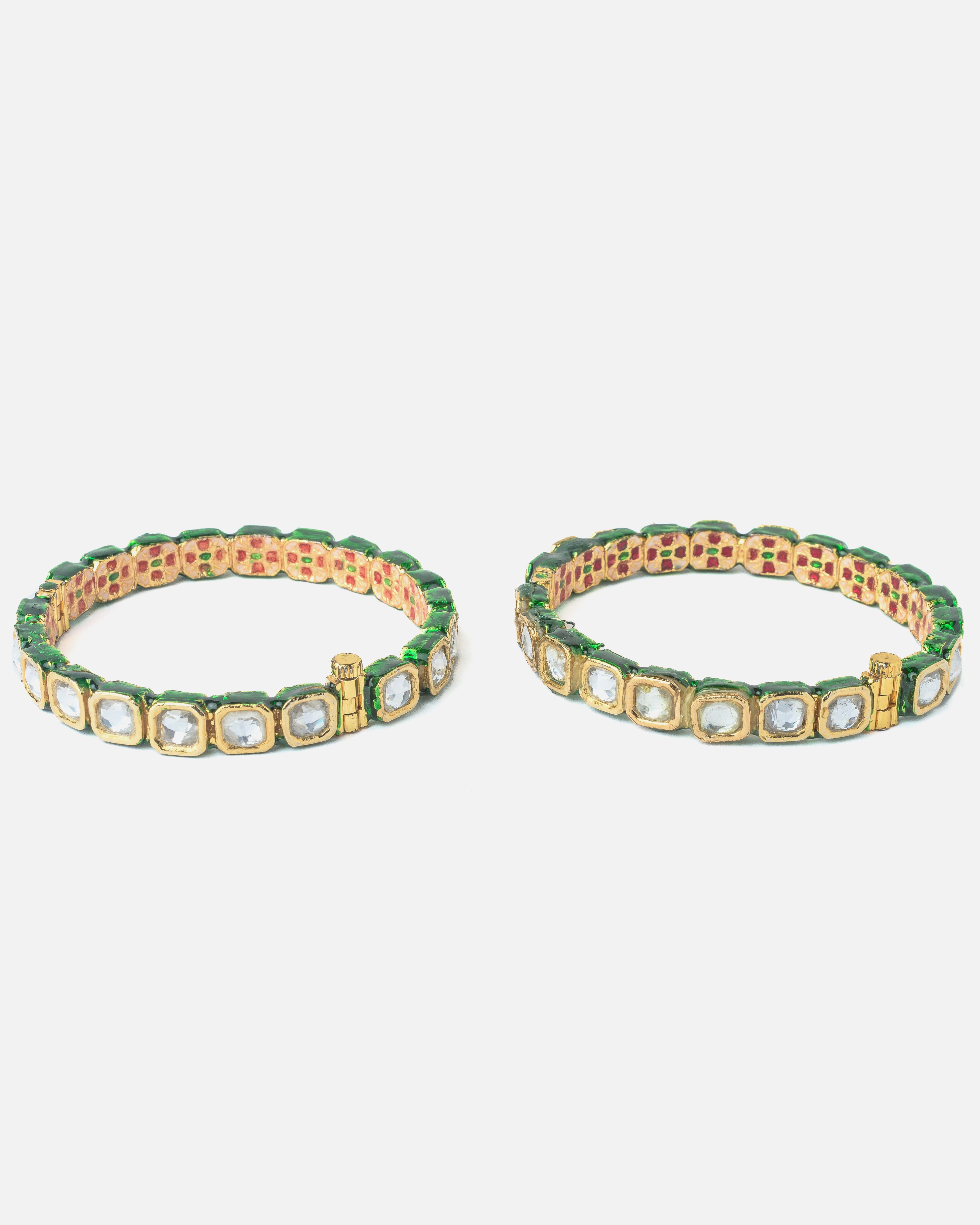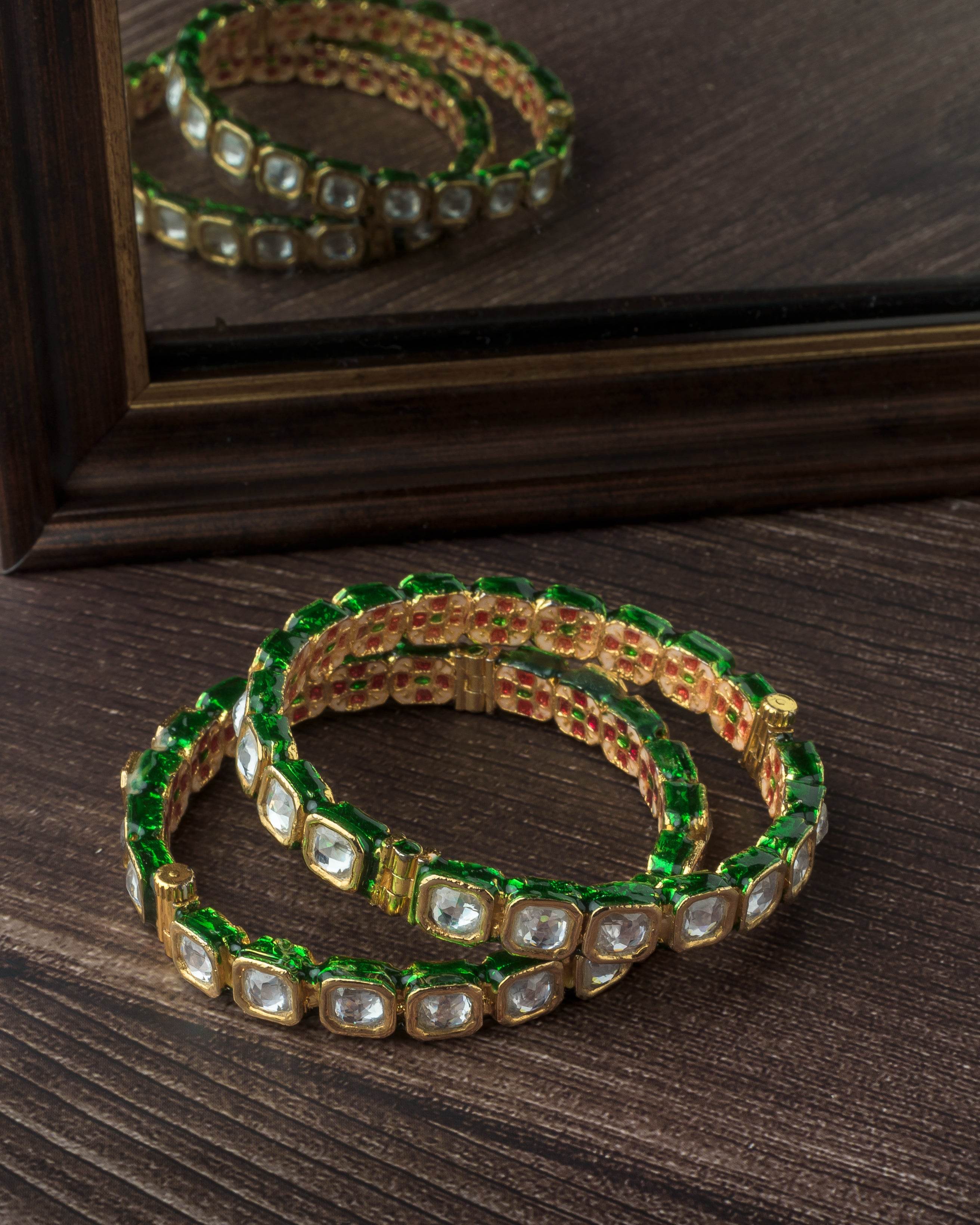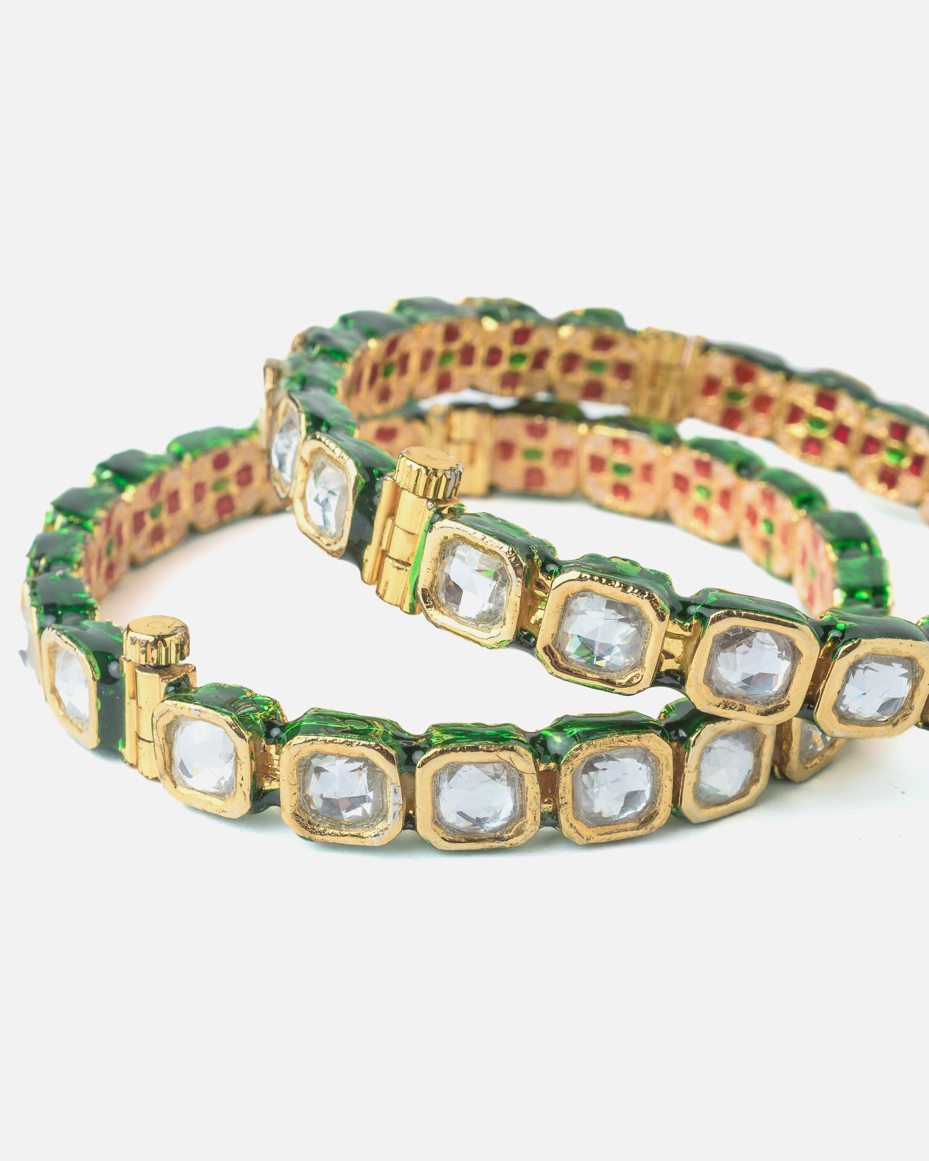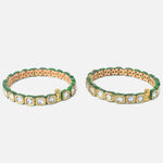 Add sparkle to your look with these striking gold-toned bangles, featuring square-cut white stones bordered in vibrant green enamel. A perfect match for festive, bridal, or ethnic ensembles.