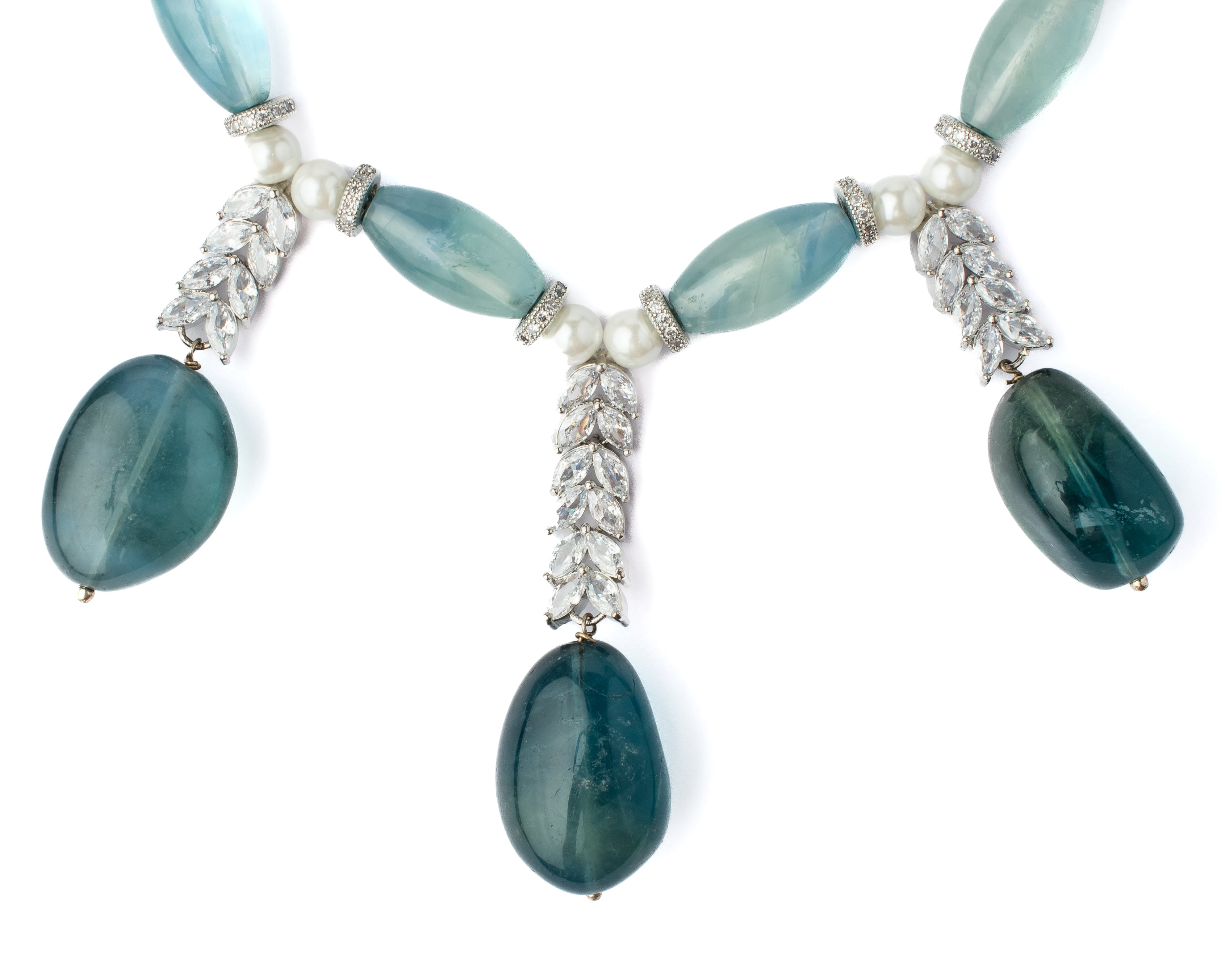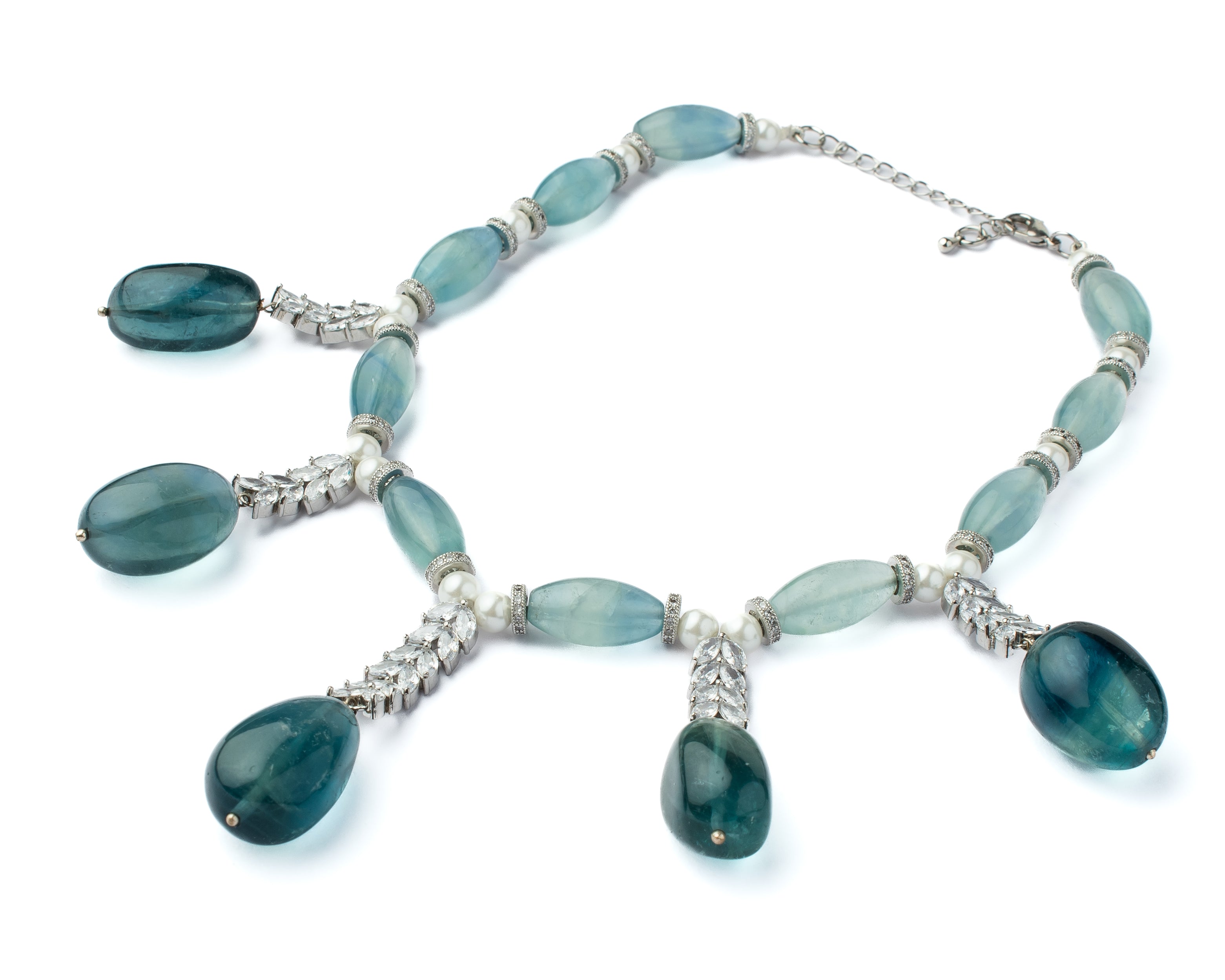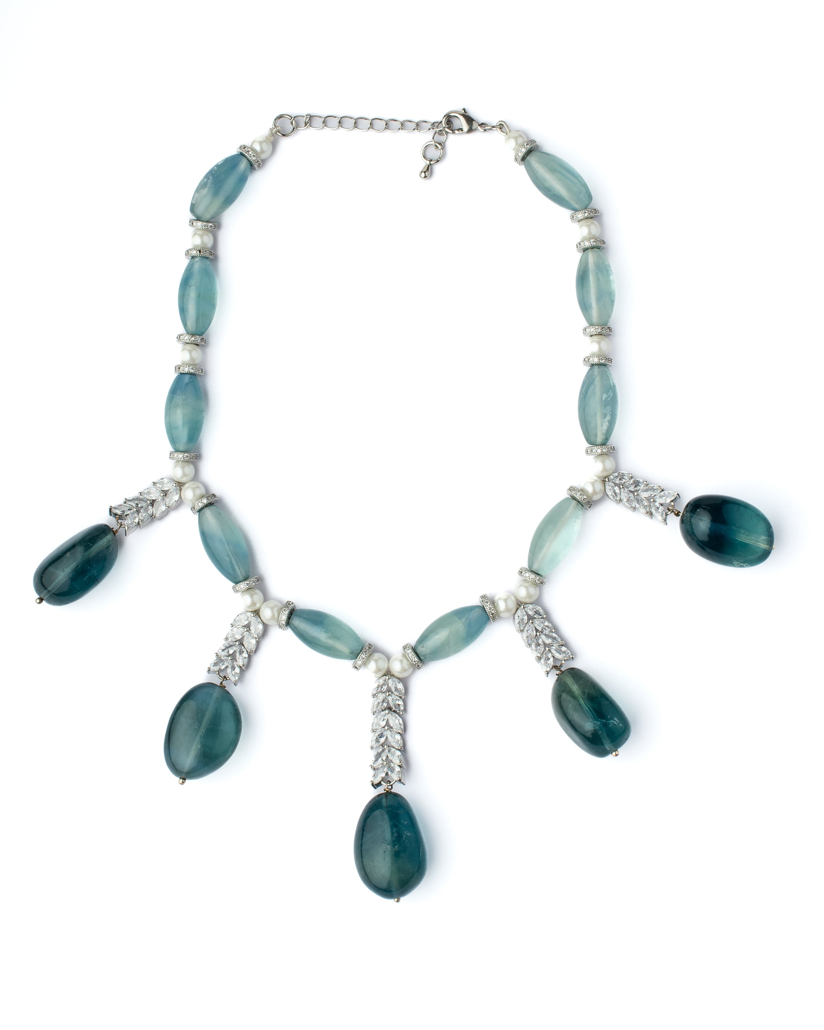 Elegant necklace with a blend of aqua-toned beads, pearl accents, and silver embellishments. Perfect for adding a touch of sophistication and charm to any outfit. Adjustable clasp for a custom fit.