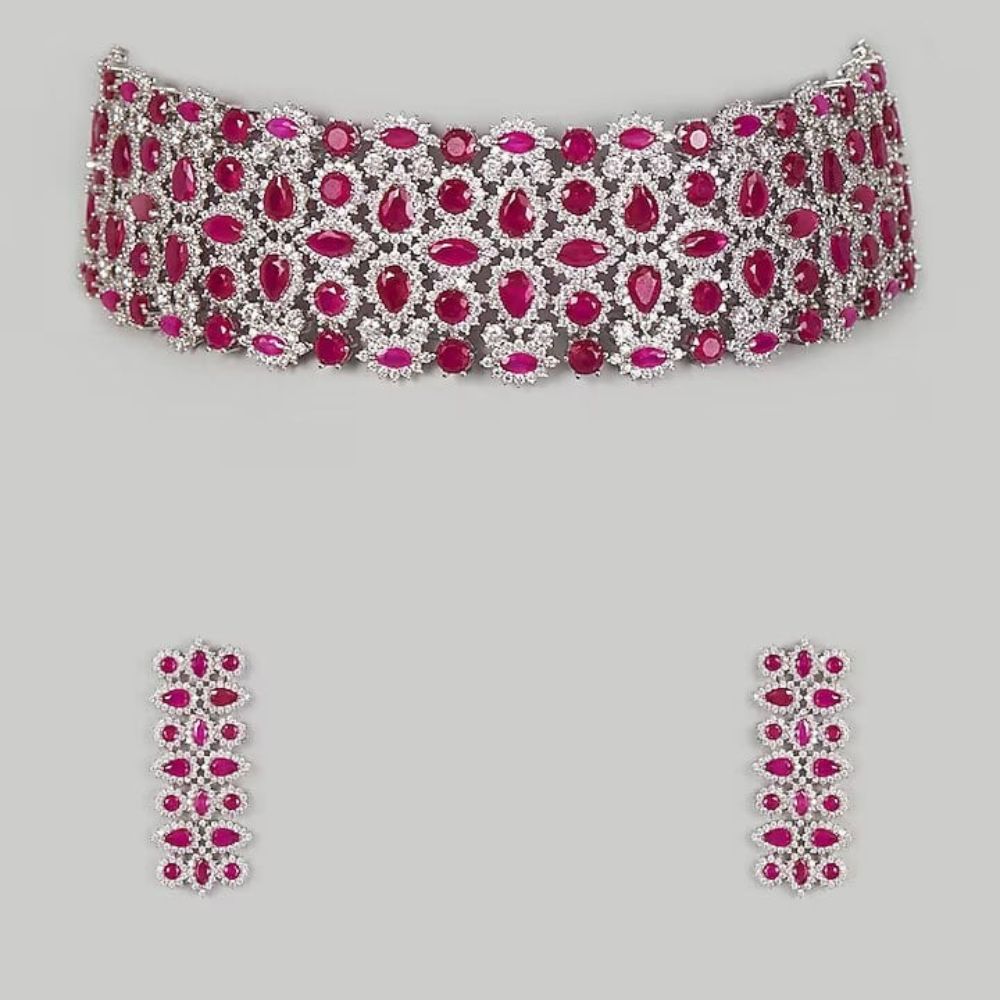Elegant choker set adorned with ruby-red and white stones in floral motifs. Includes a wide, intricate necklace and matching long earrings perfect for weddings or festive occasions.