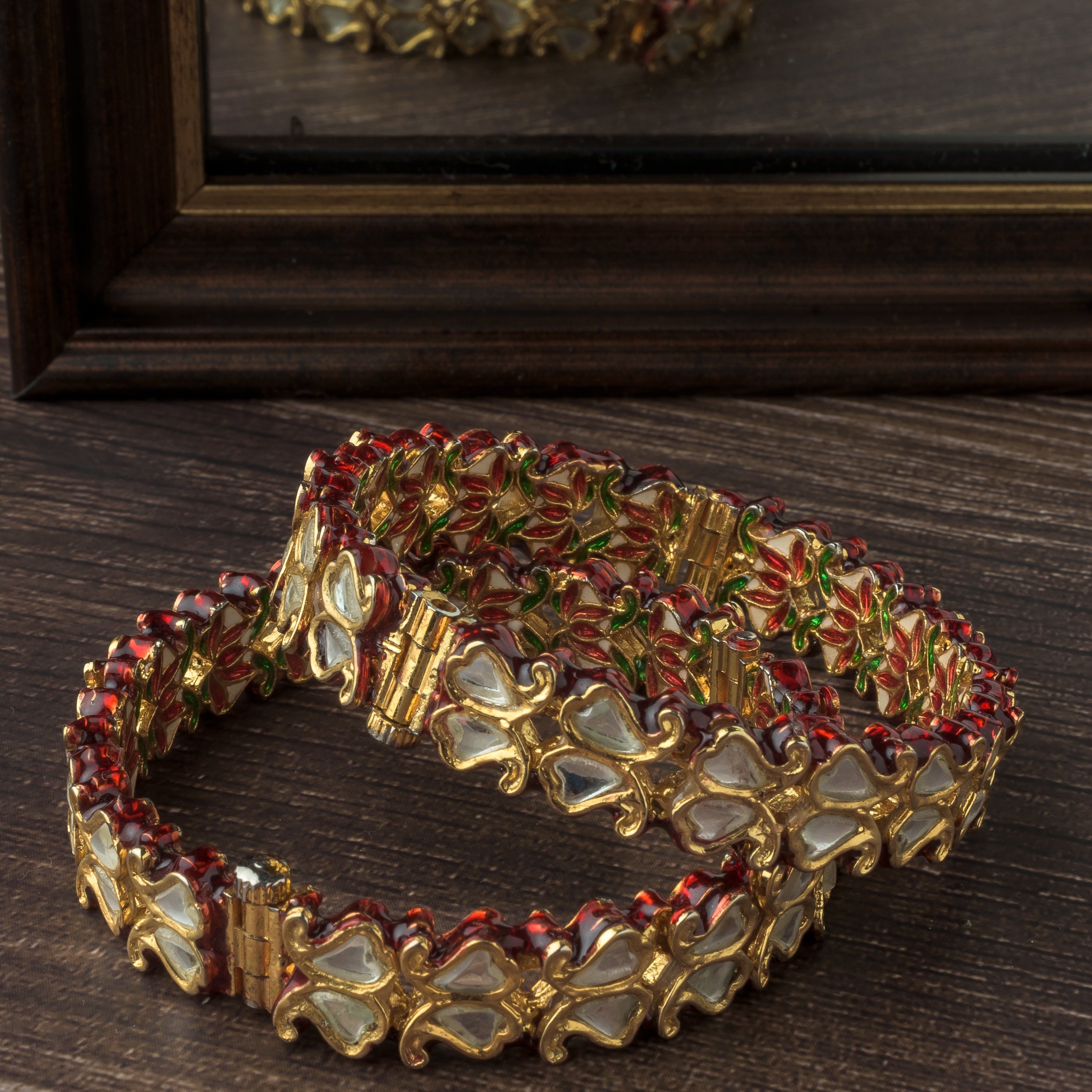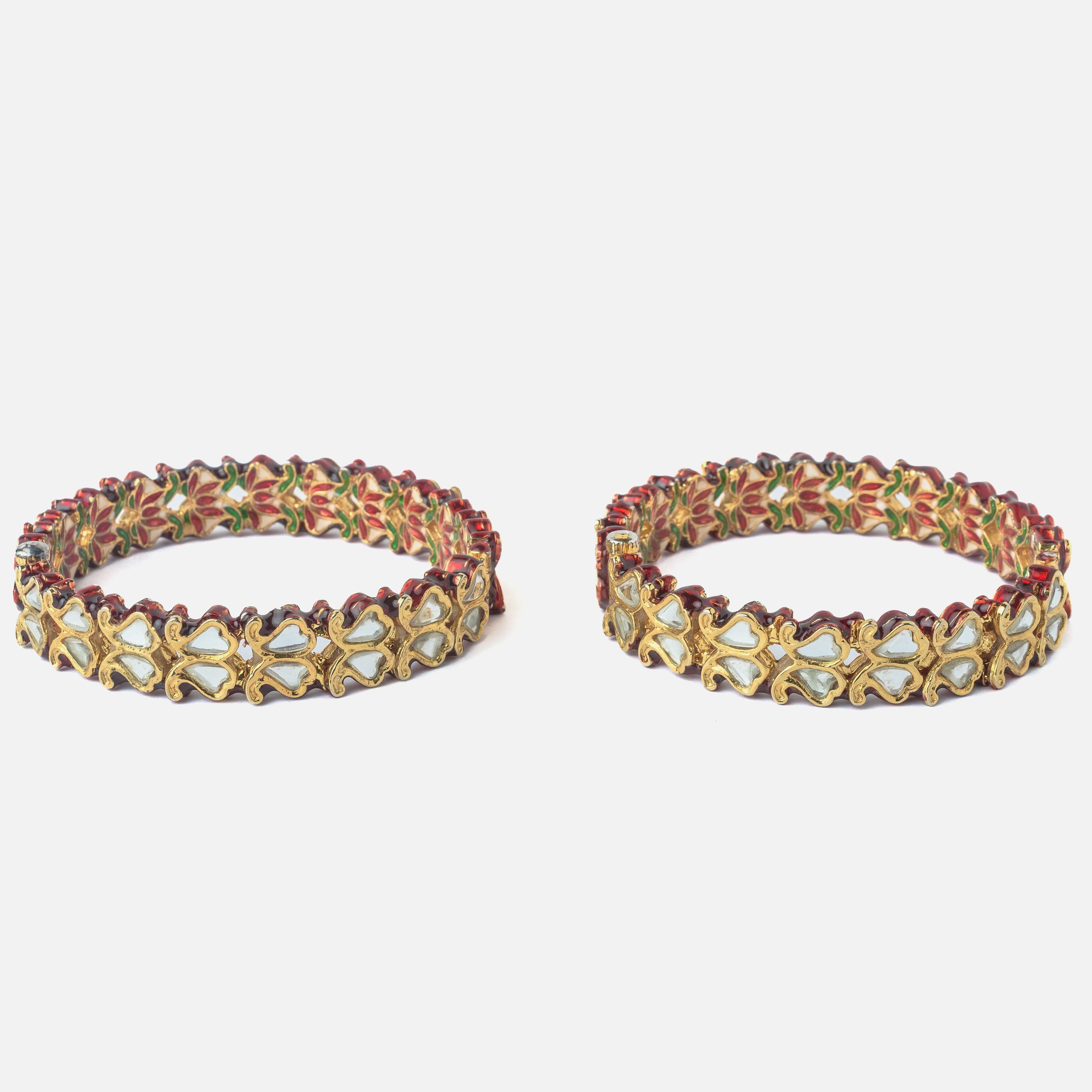 Gold Plated Red Colored Kundan, Polki Womens Pair of Bangles