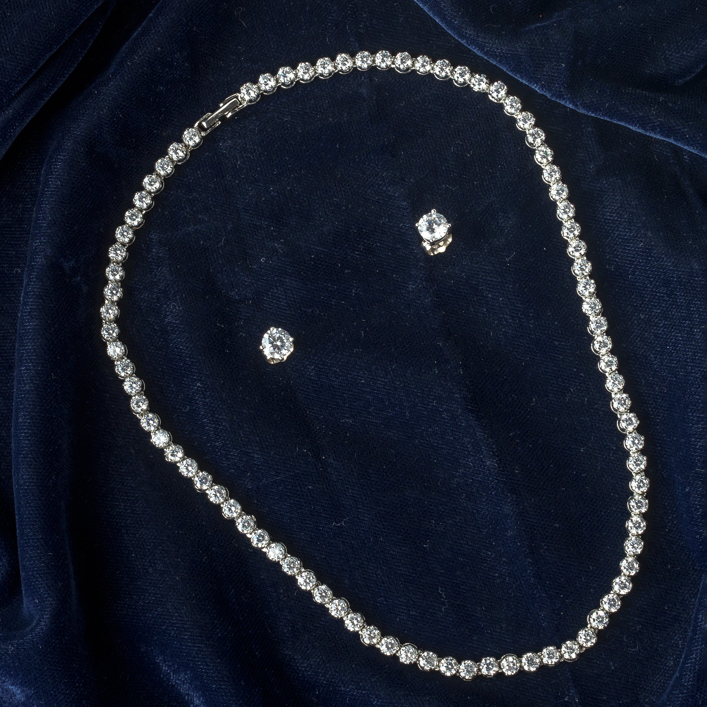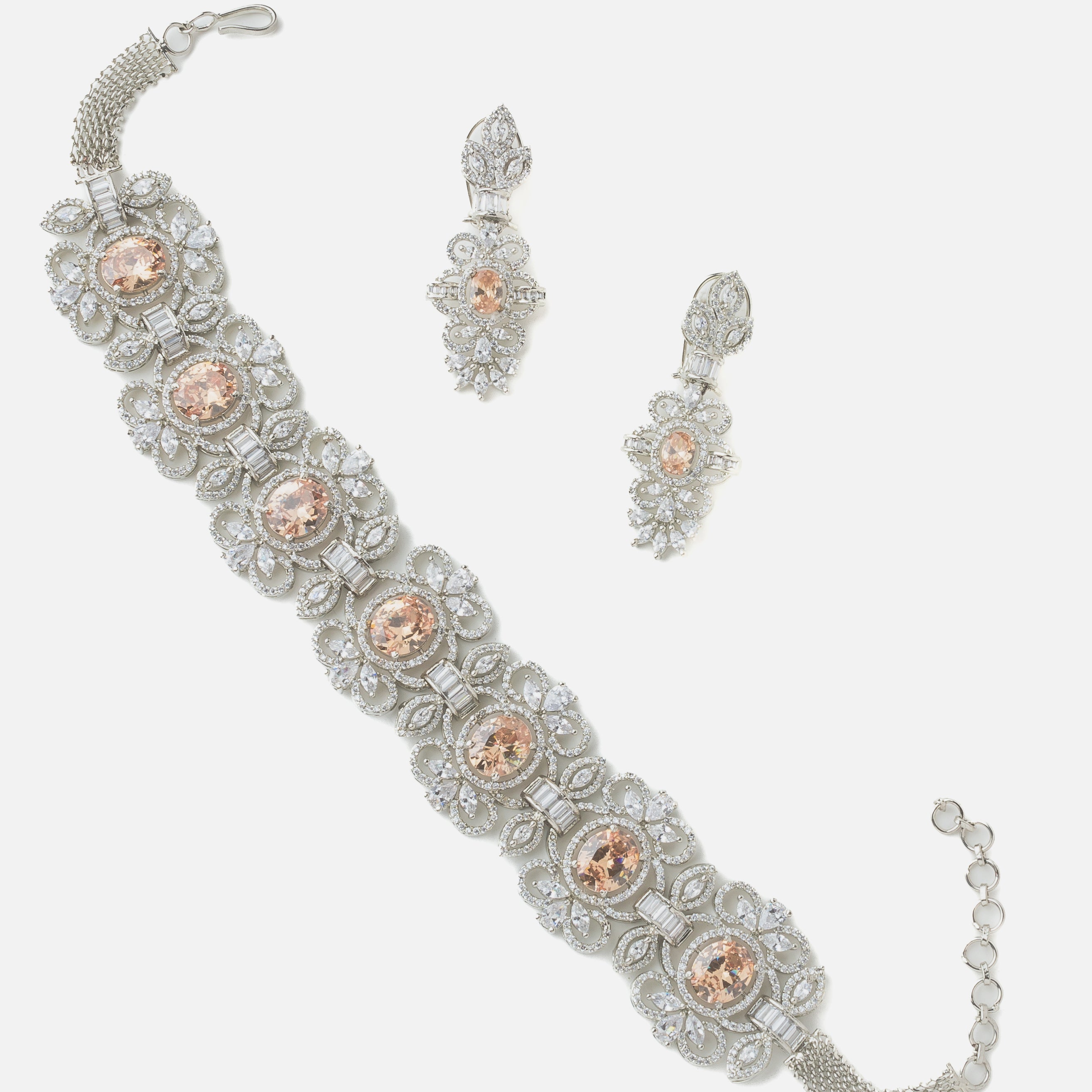 Silver Plated Womens Zircon Choker Necklace Set with Pair of Earrings