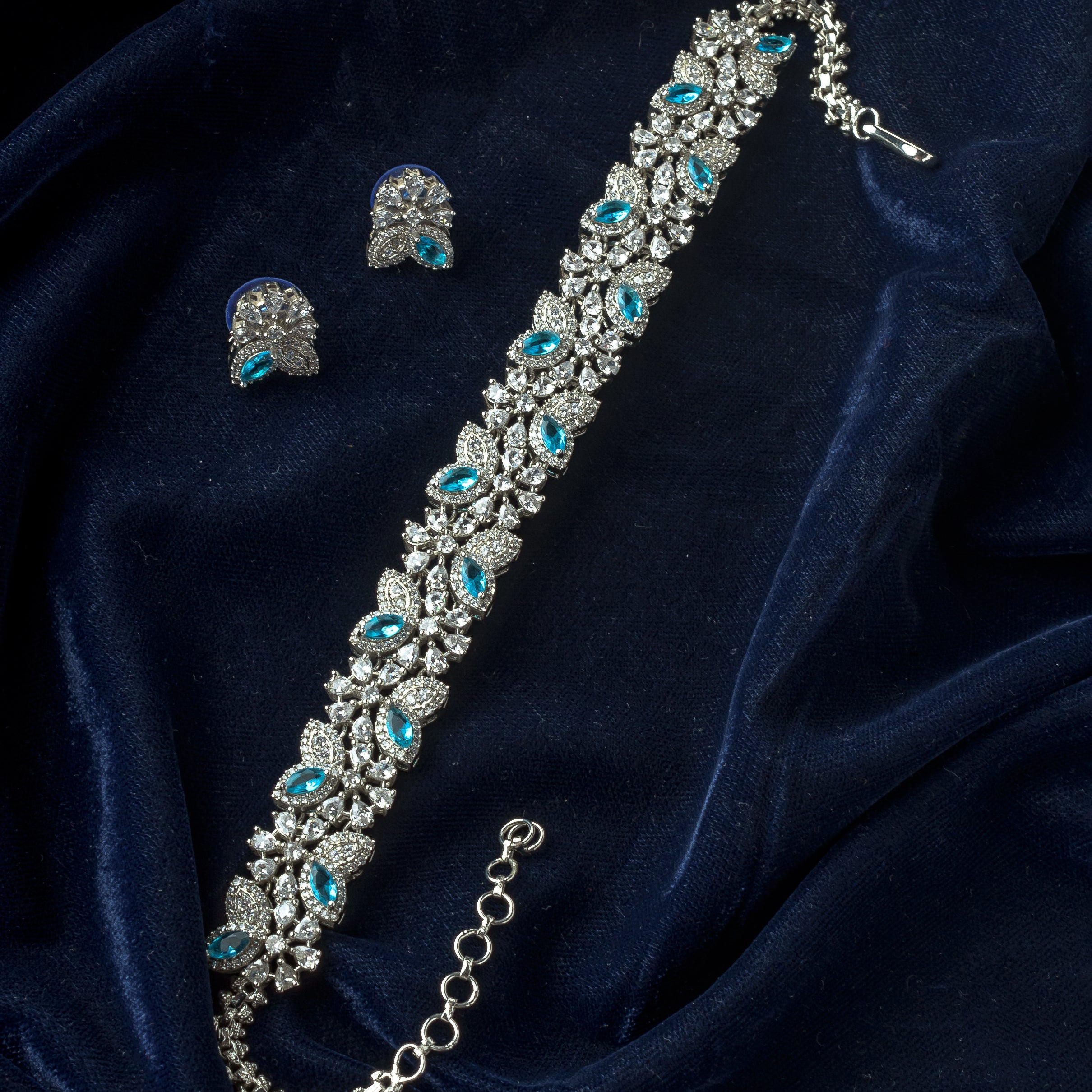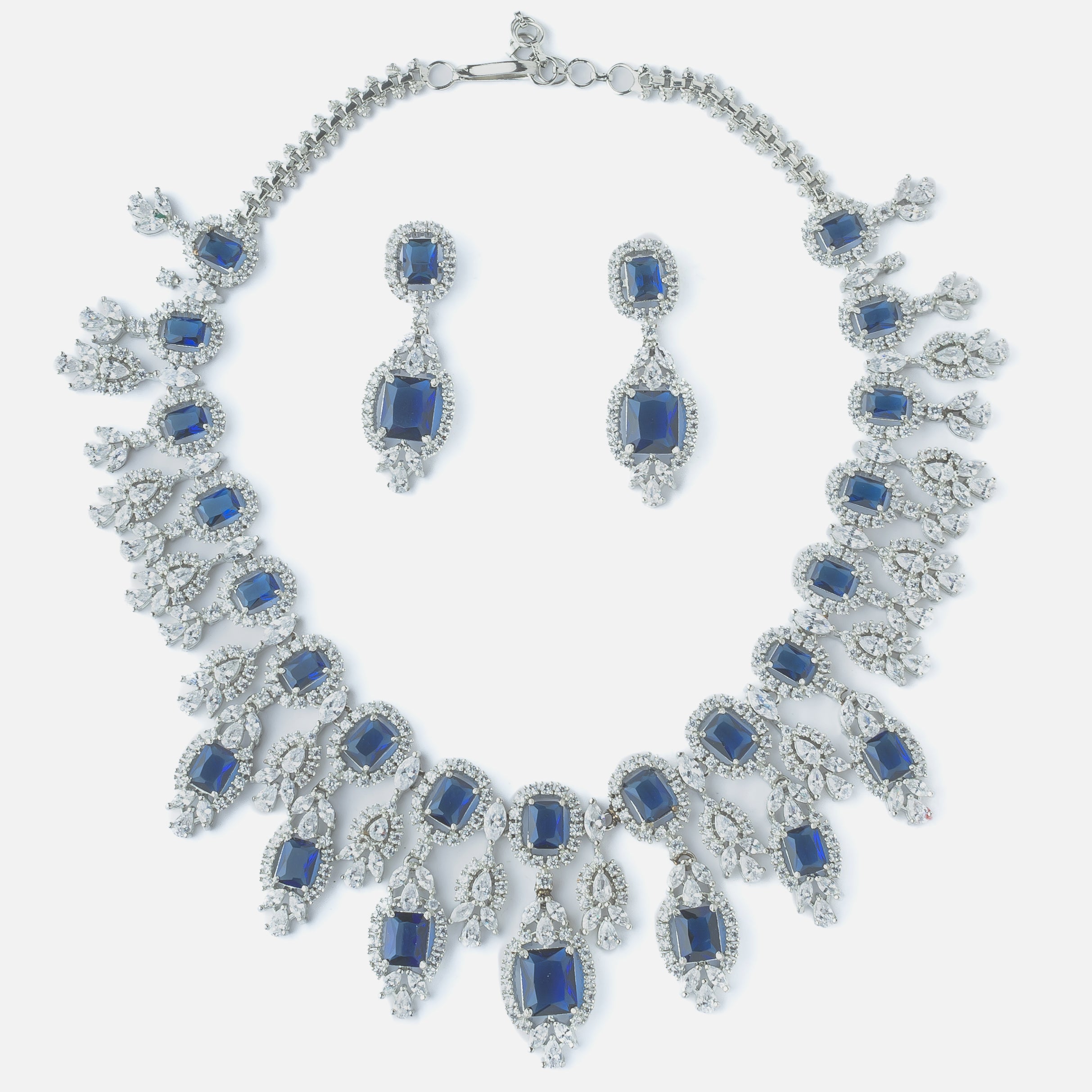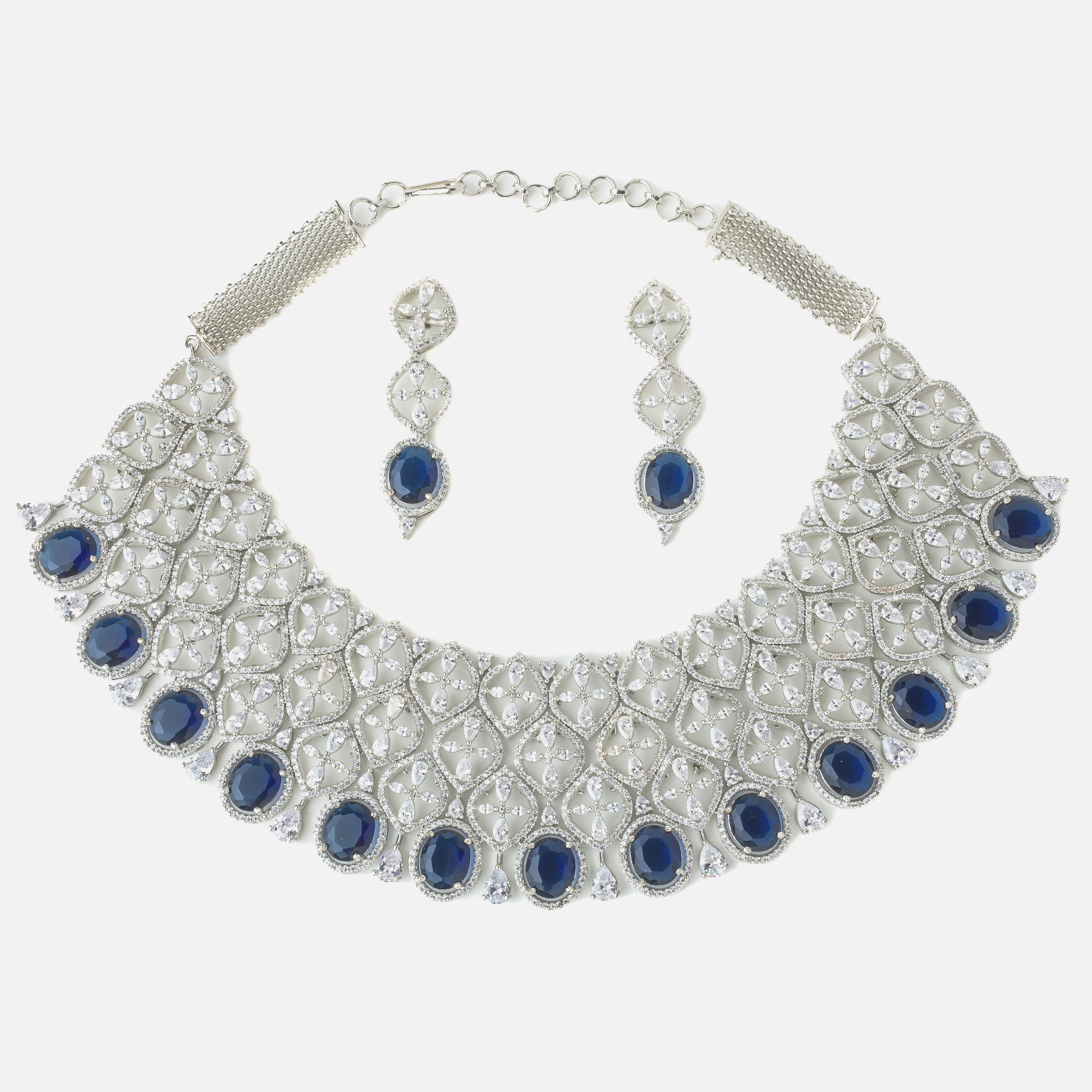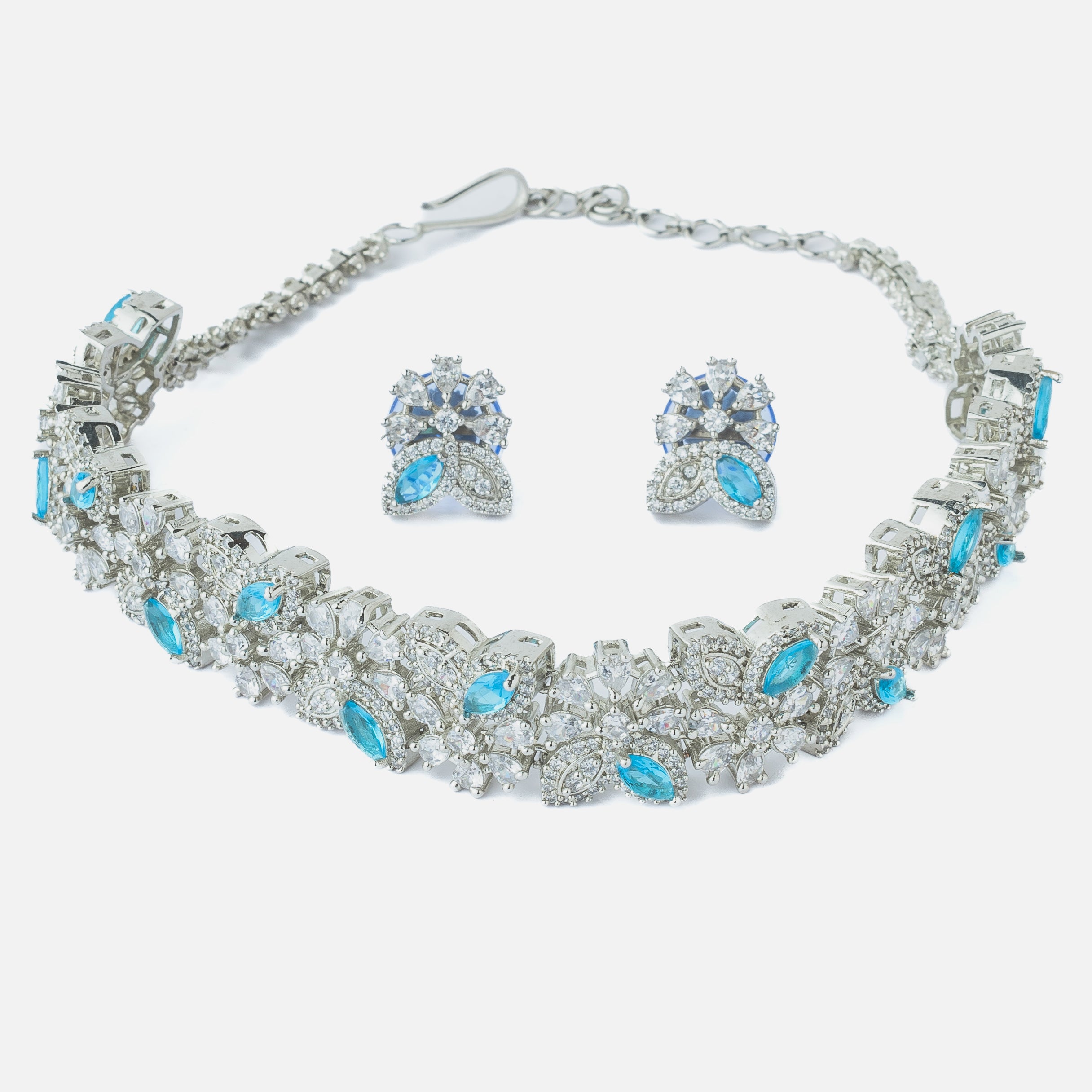 Silver Plated Blue Womens Zircon Choker Necklace Set with Pair of Earrings