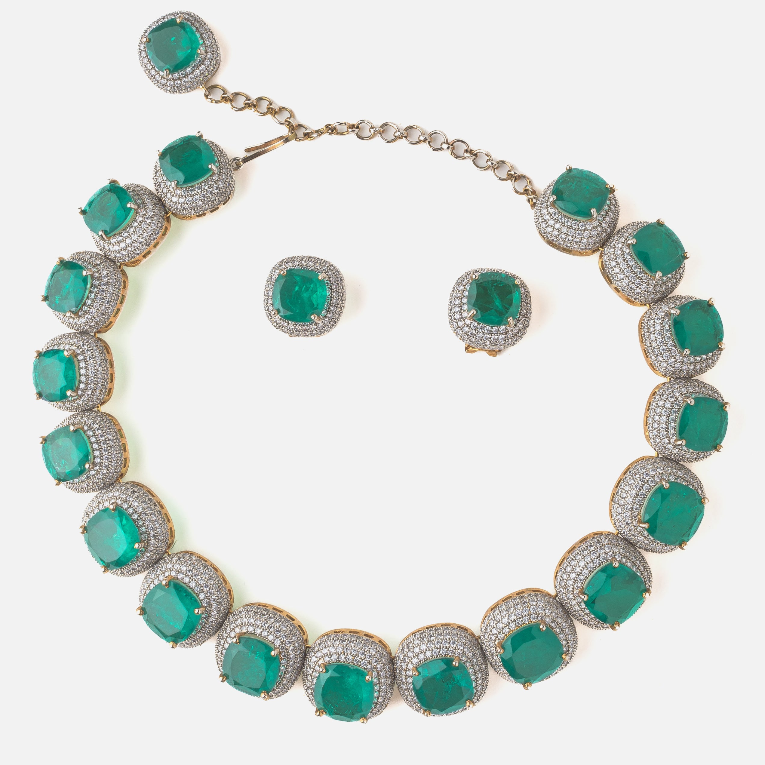 Zia Silver Plated Green Womens Zircon Short Necklace Set with Pair of Earrings